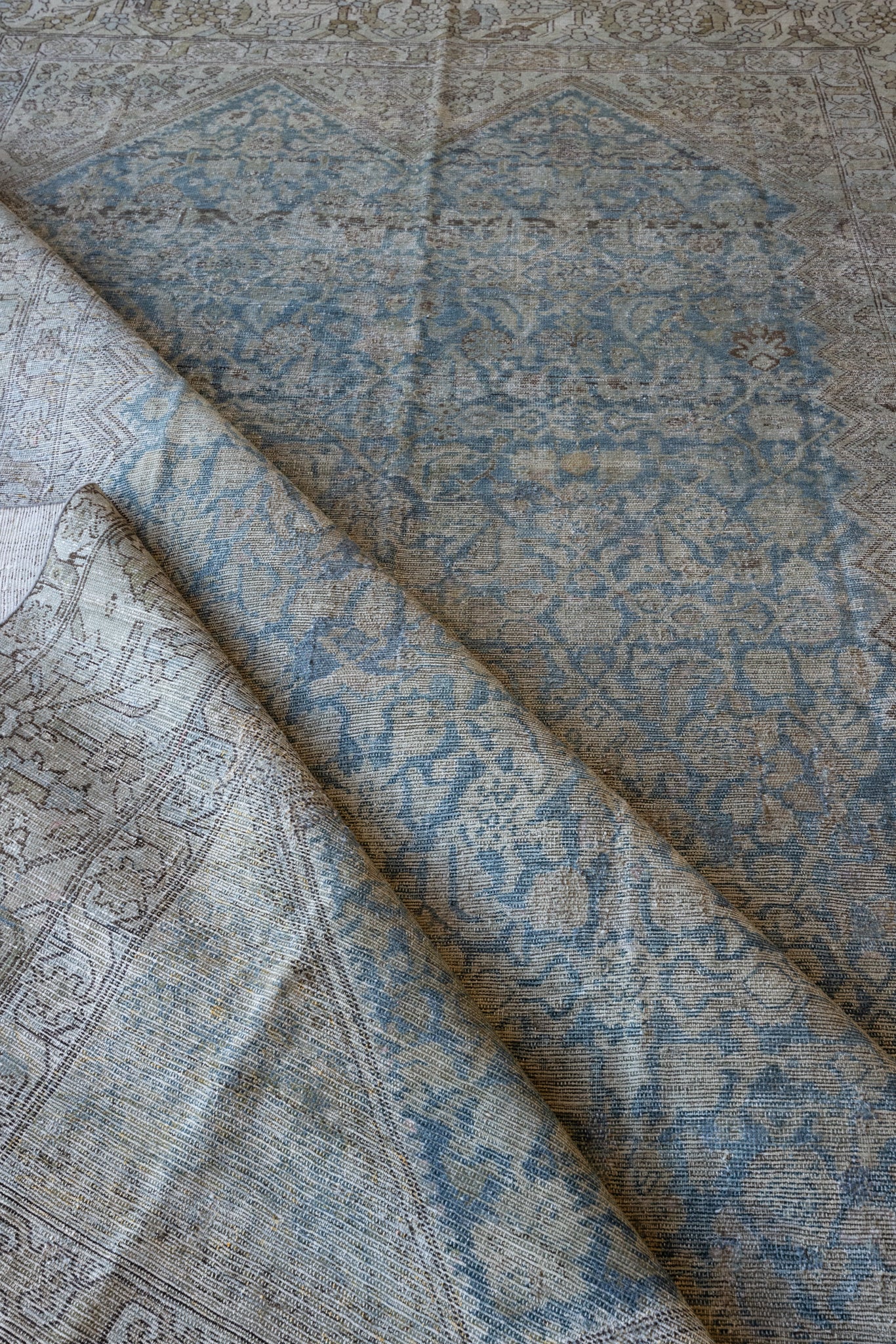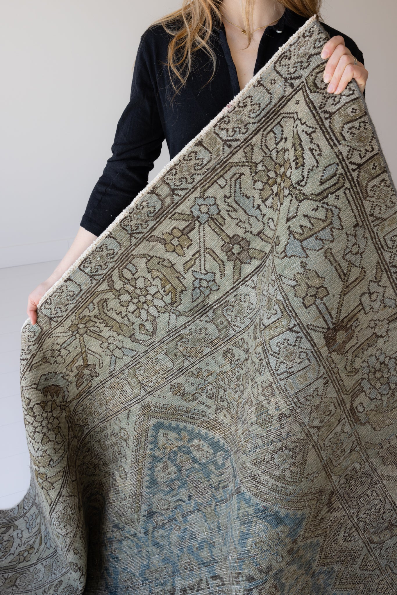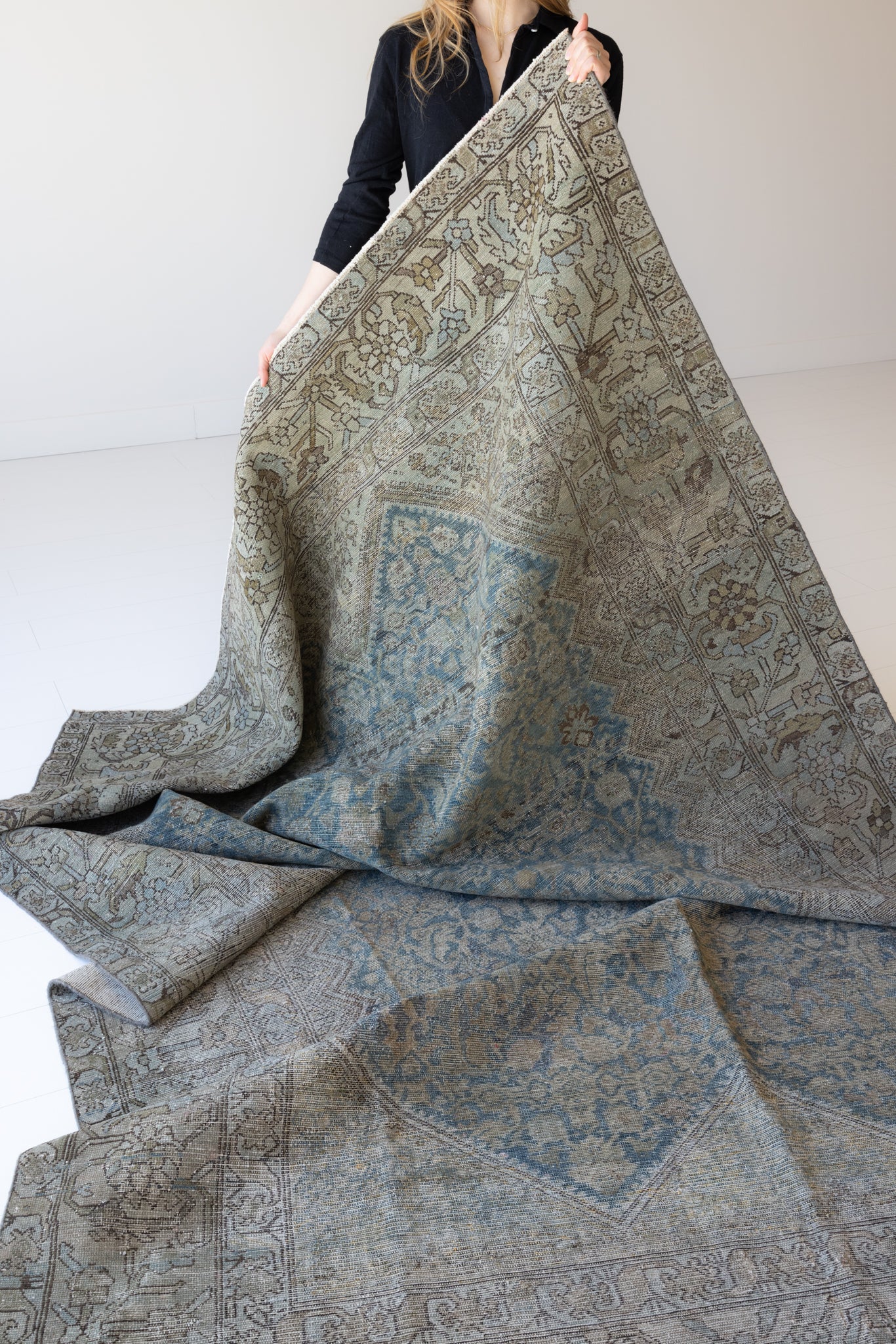 Because of the nature of this item, there may be slight imperfections in its wear, shape, dimensions, and color. Our rugs have been repaired over the years, using various techniques. There might be evidence of these repairs through texture, look and feel. This is all part of the rich history and story of each artistic piece. These markings are not considered defective.