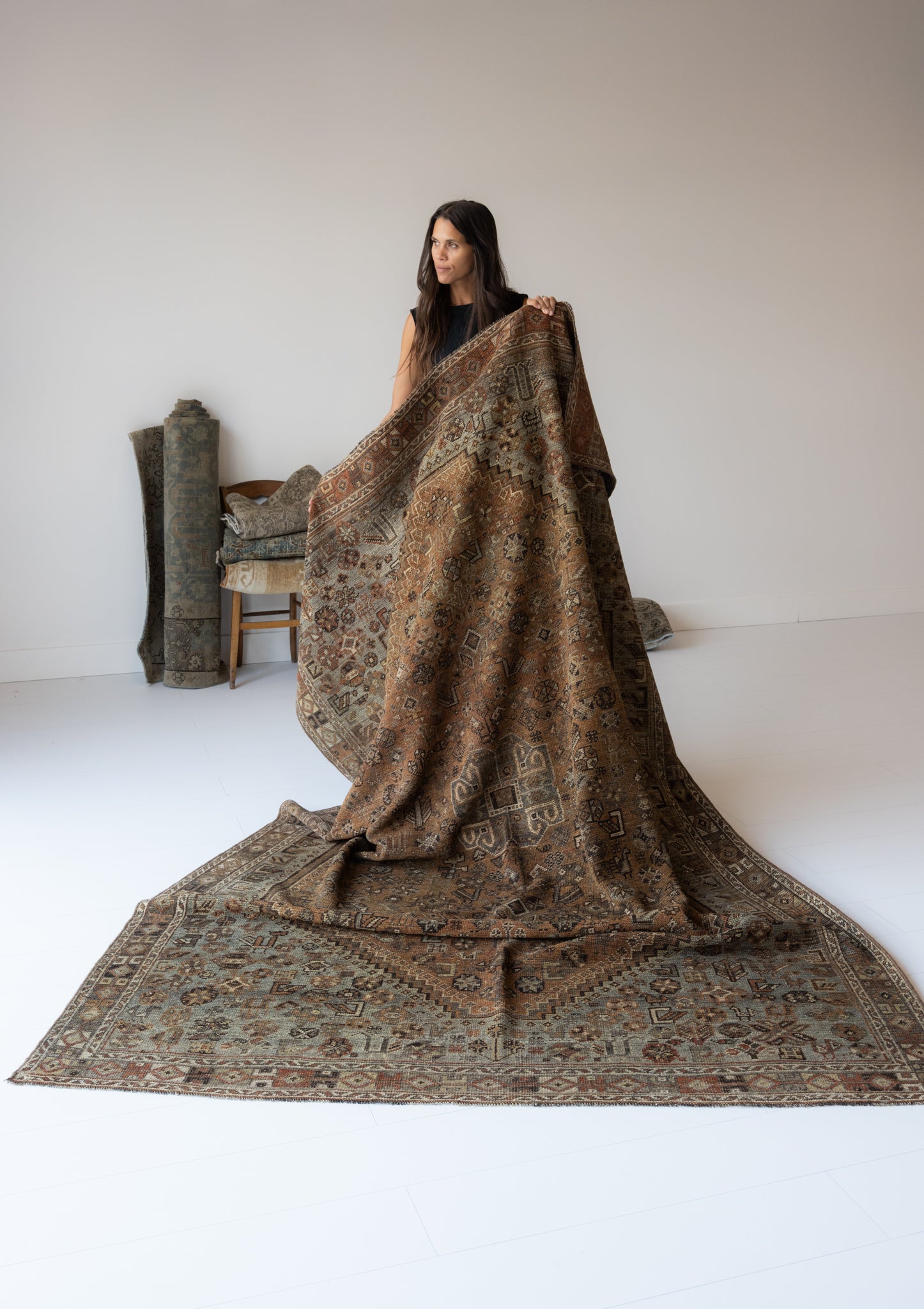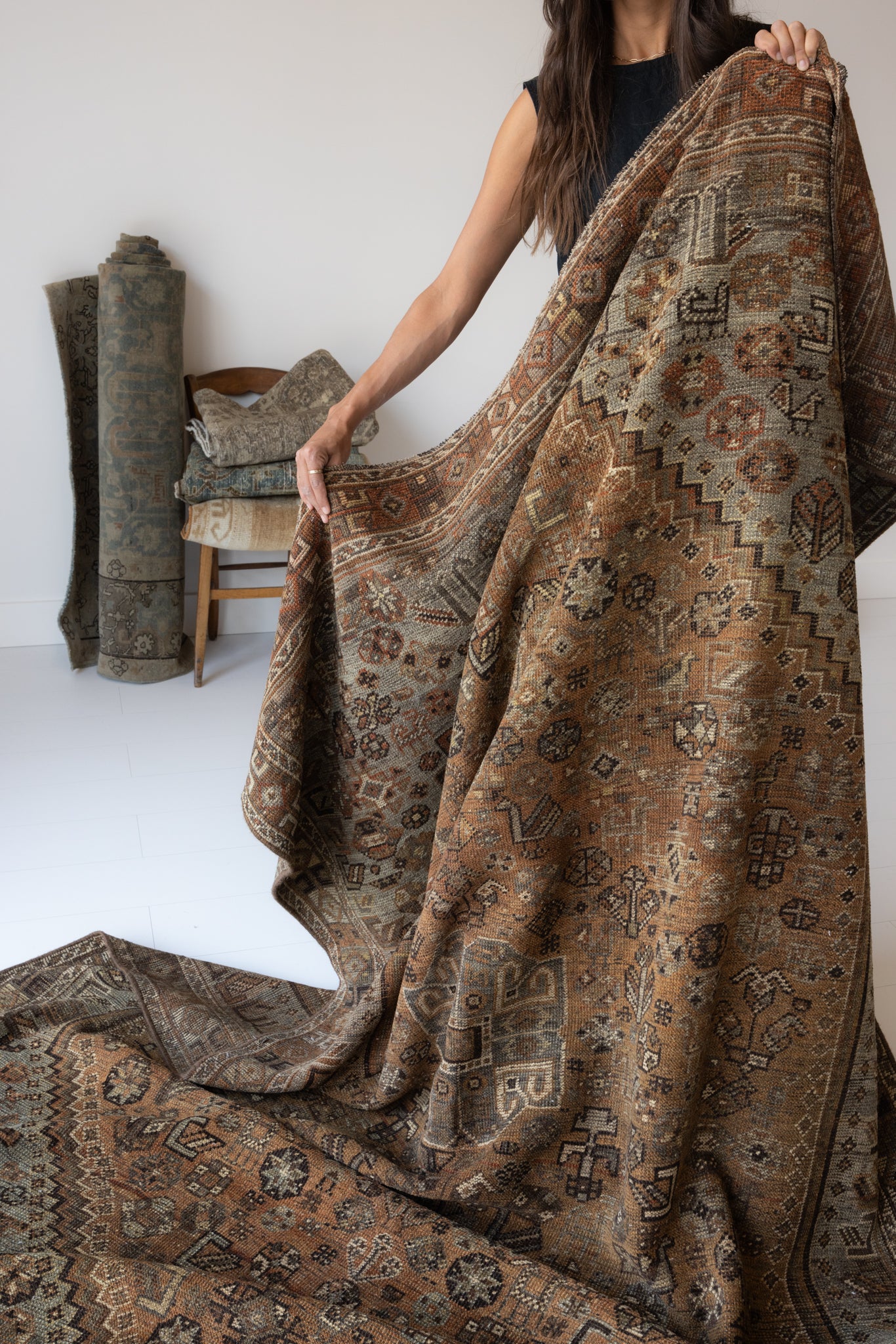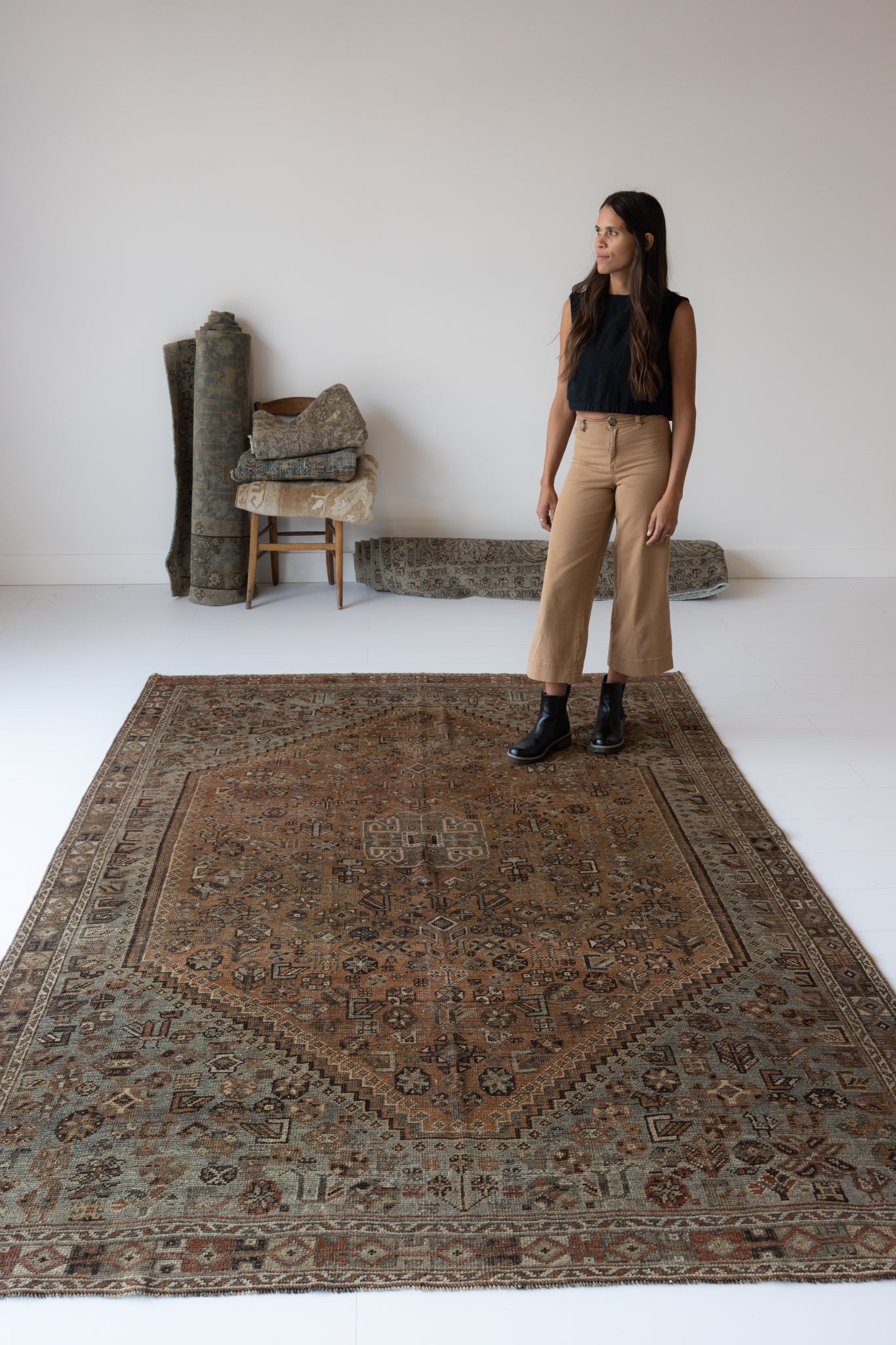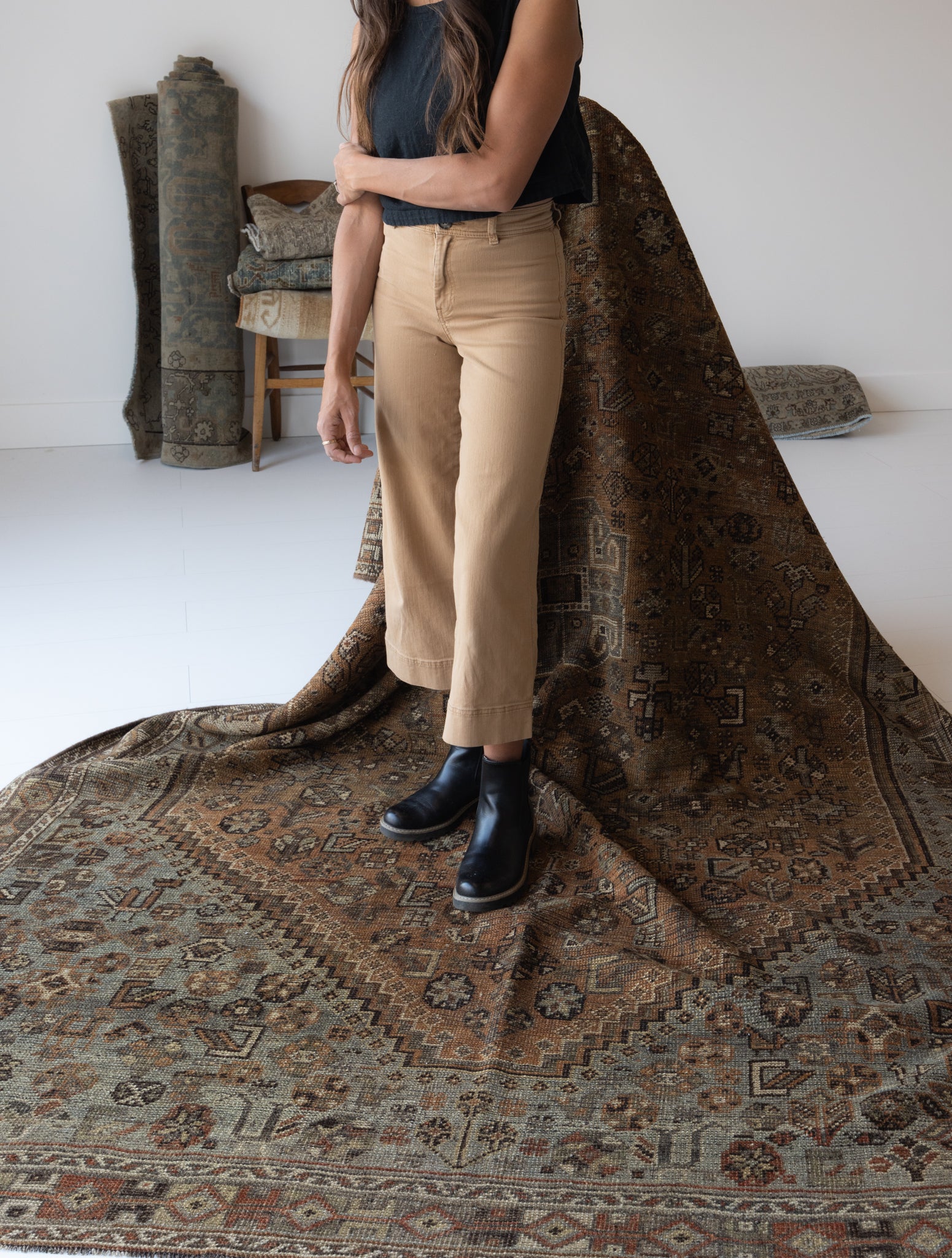 Because of the nature of this item, there may be slight imperfections in its wear, shape, dimensions, and color. Our rugs have been repaired over the years, using various techniques. There might be evidence of these repairs through texture, look and feel. This is all part of the rich history and story of each artistic piece. These markings are not considered defective.