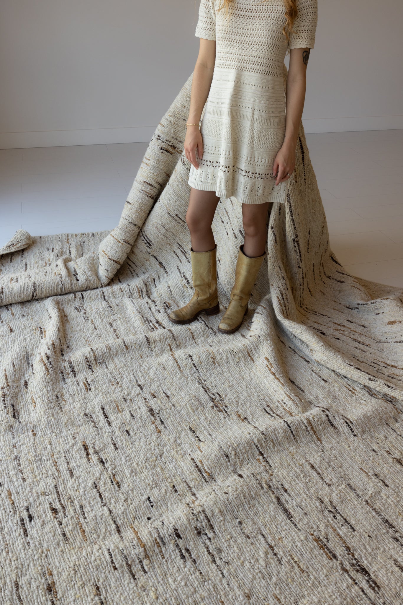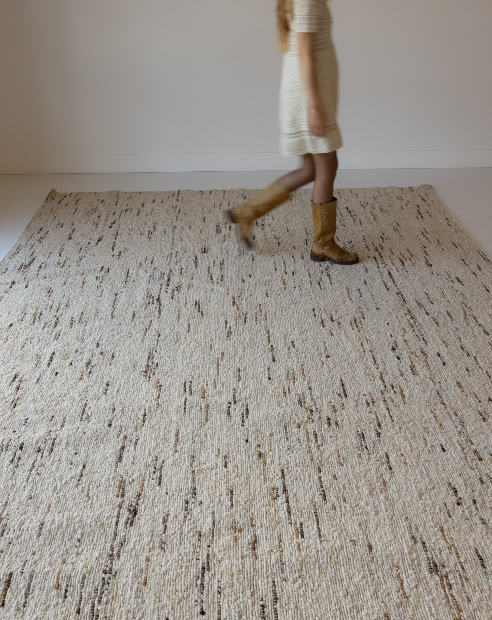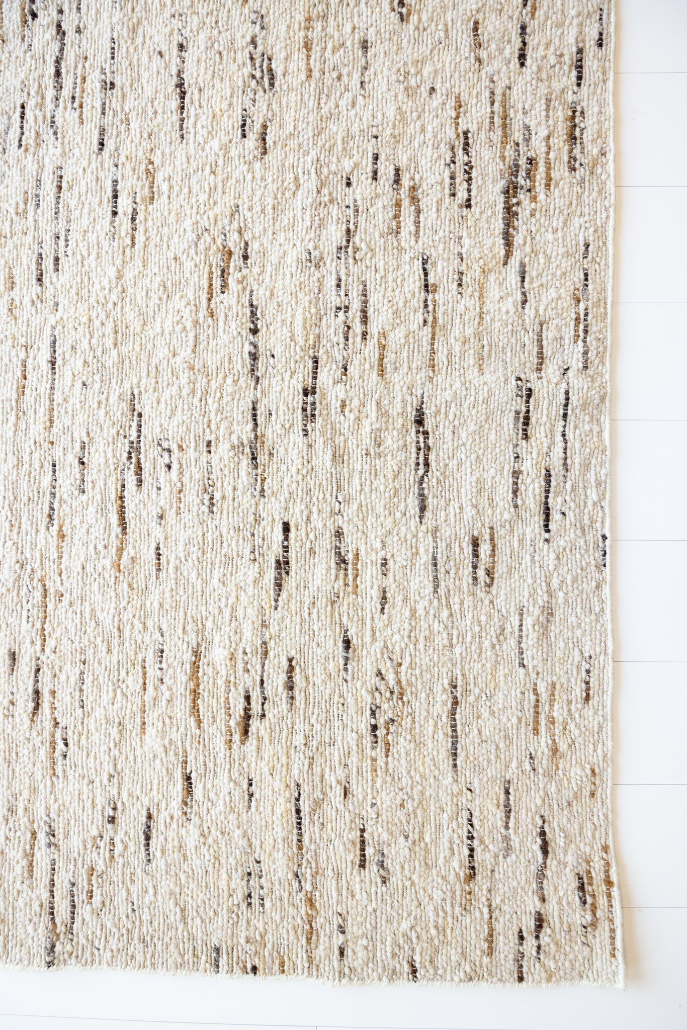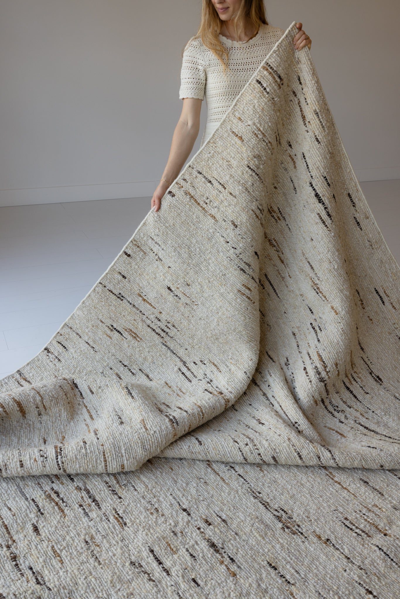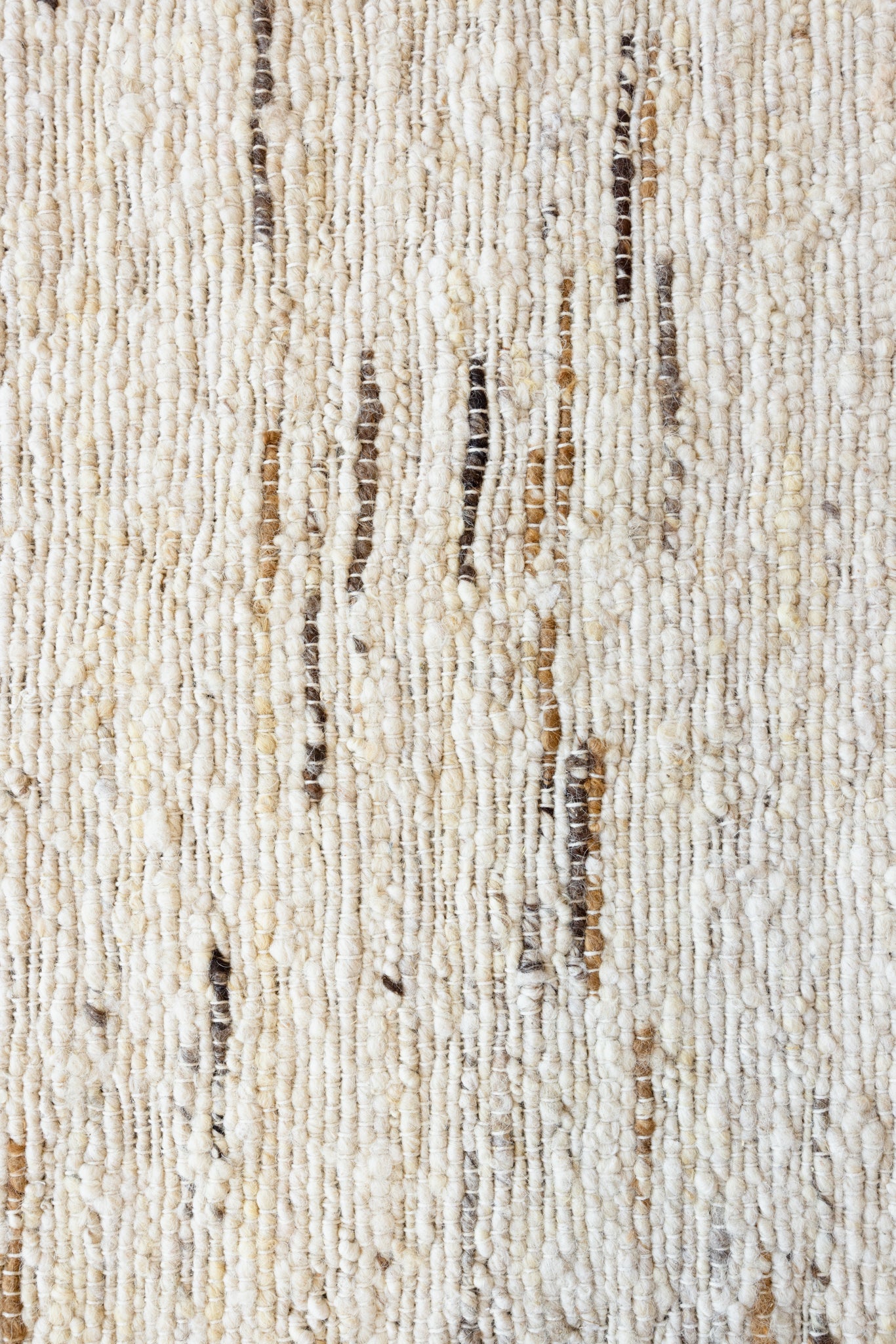 This updated version of the Nadia rug features a few subtle changes from the original: a light oat-colored background, and more stripes in varying shades of brown (no black). The stripes are now oriented lengthwise.