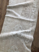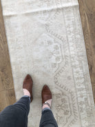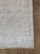 Colors: Ivory and linen base colors with portions of muted walnut detailing throughout the rug.