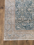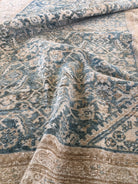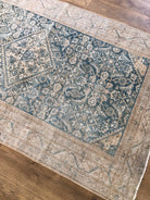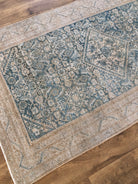 Colors: Oat and faded cobalt blue base colors, with muted honey detailing and outlining throughout the rug.