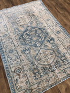 Colors: Ivory and chiffon base coloring with faded denim blue and coffee brown detailing throughout the rug.