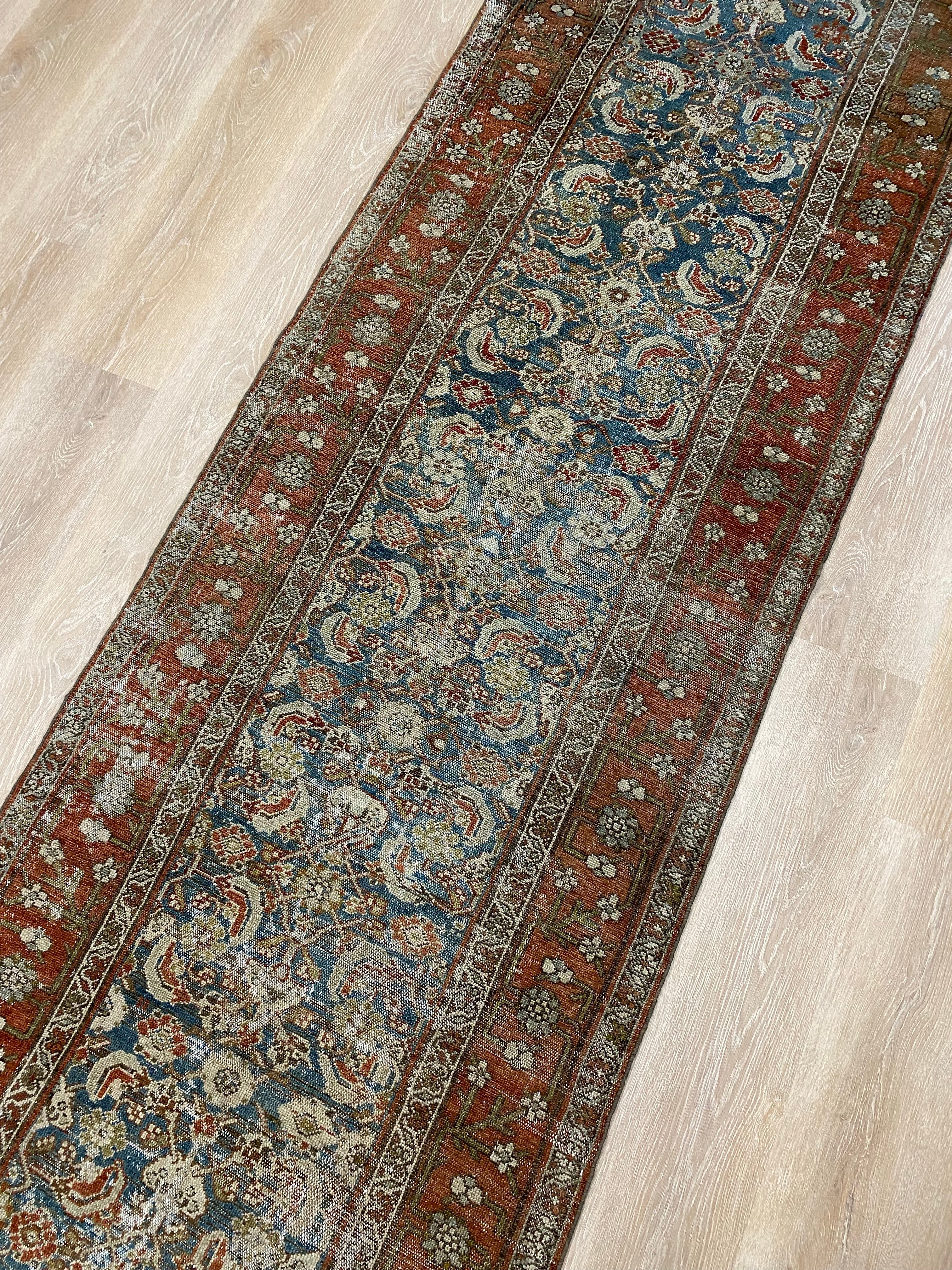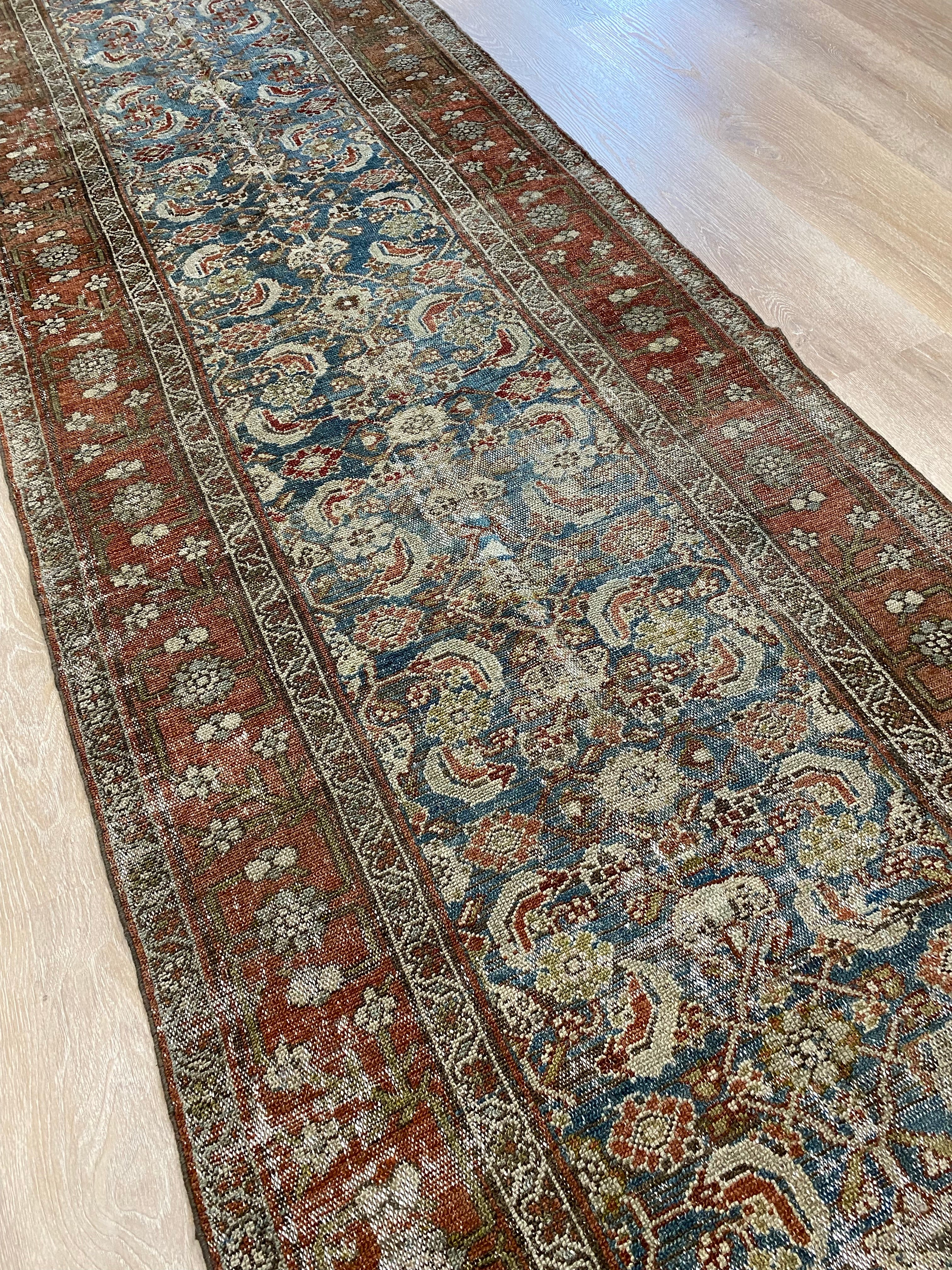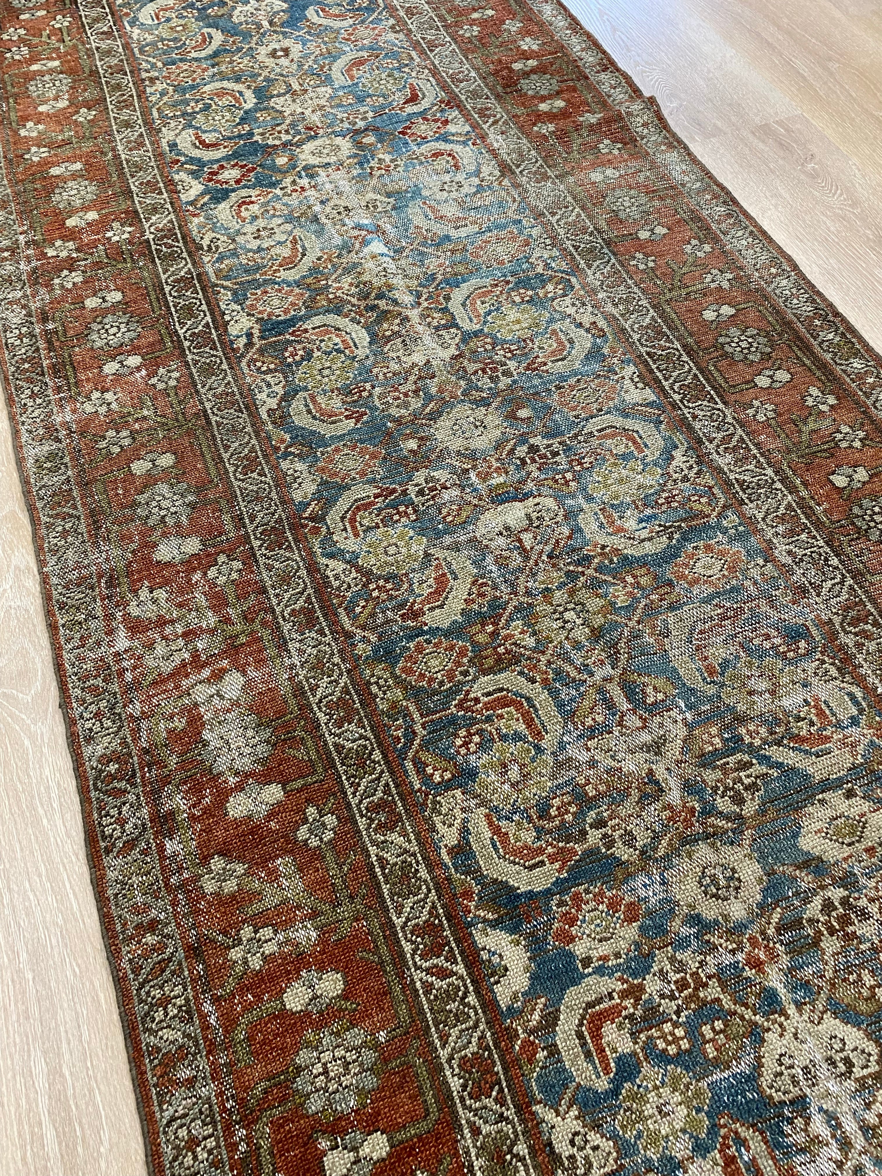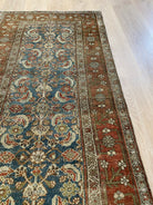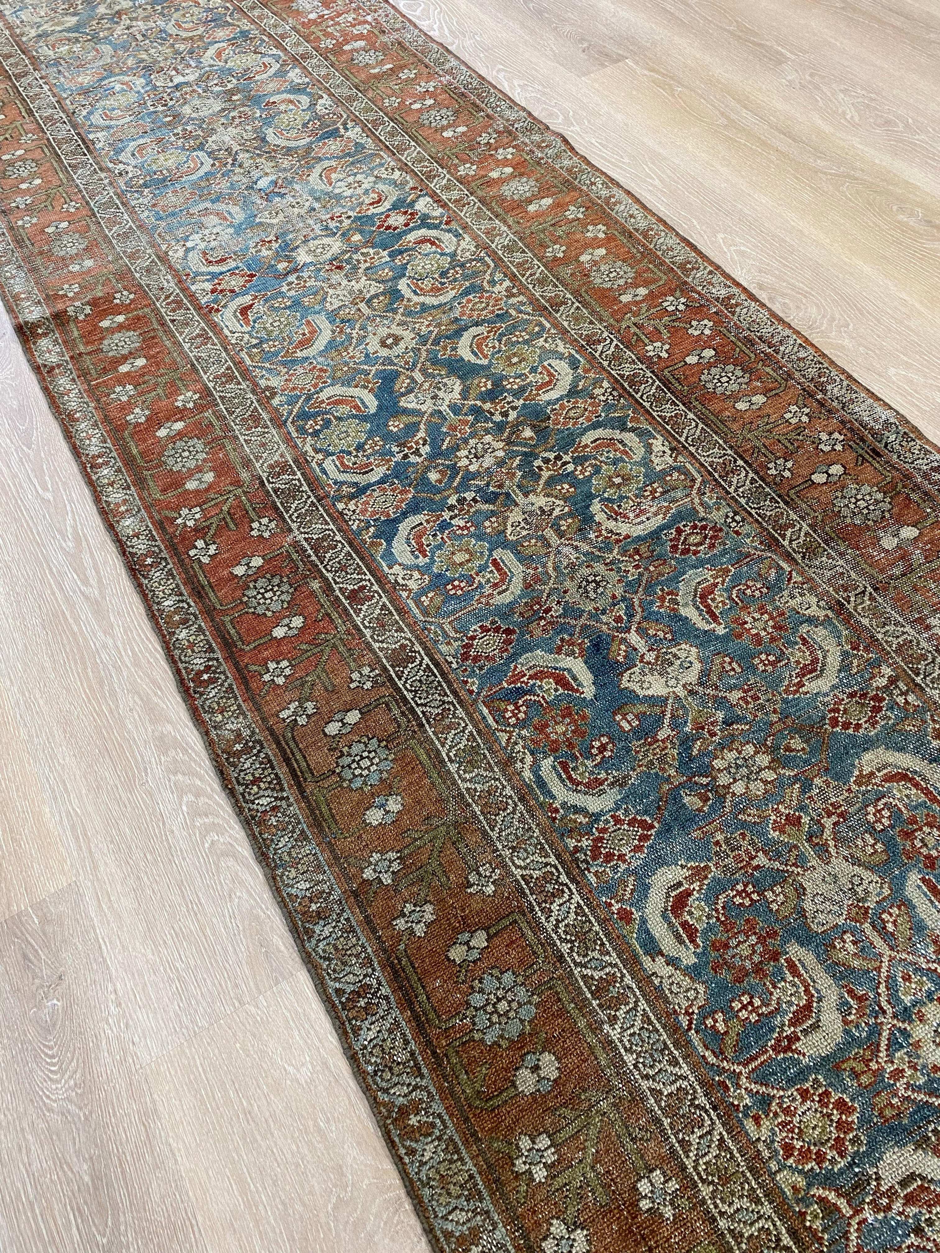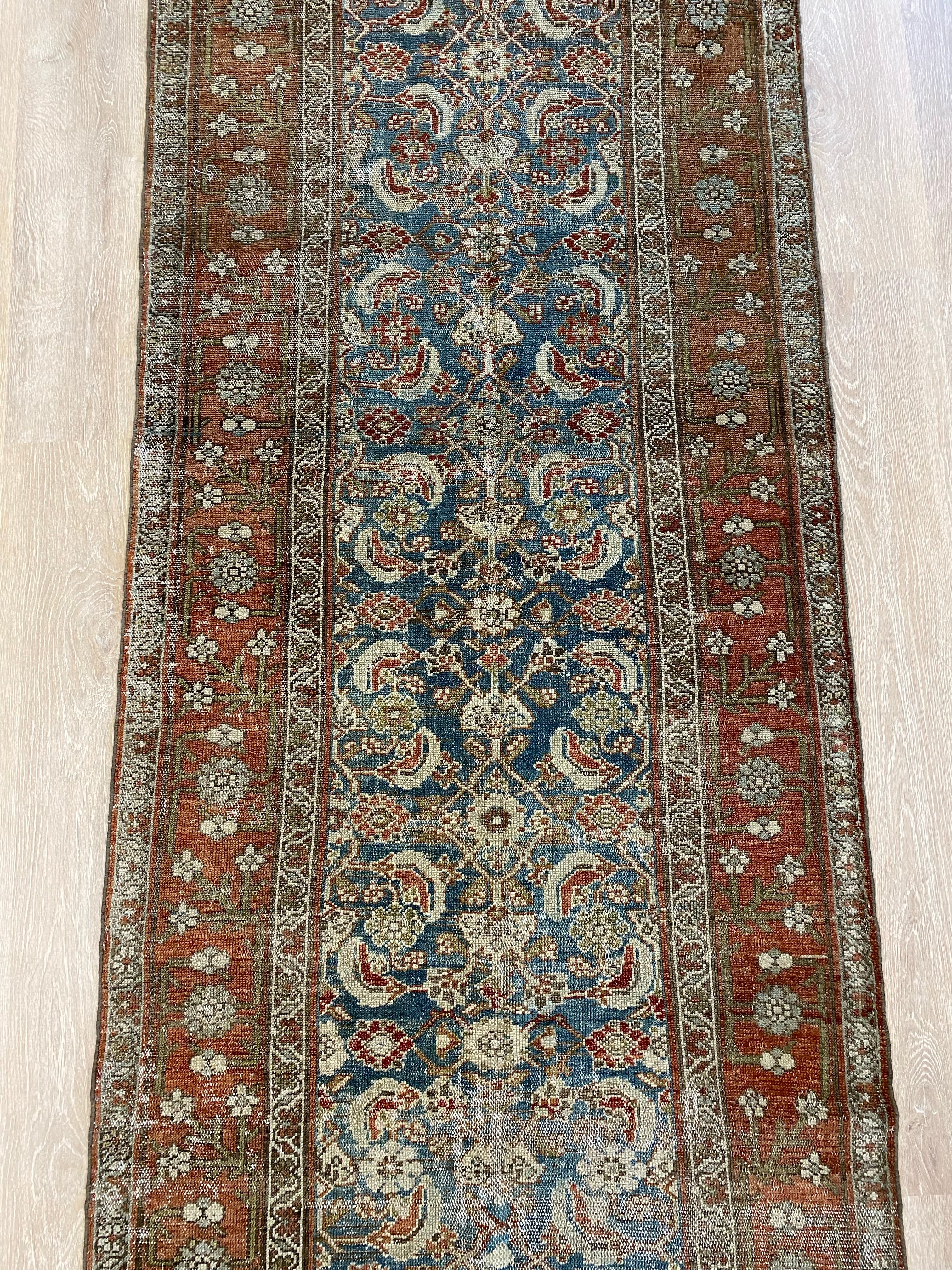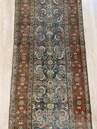 Colors: deep rust/red border and accents throughout the runner. The field is rich denim blue. Olive green and taupe detailing throughout