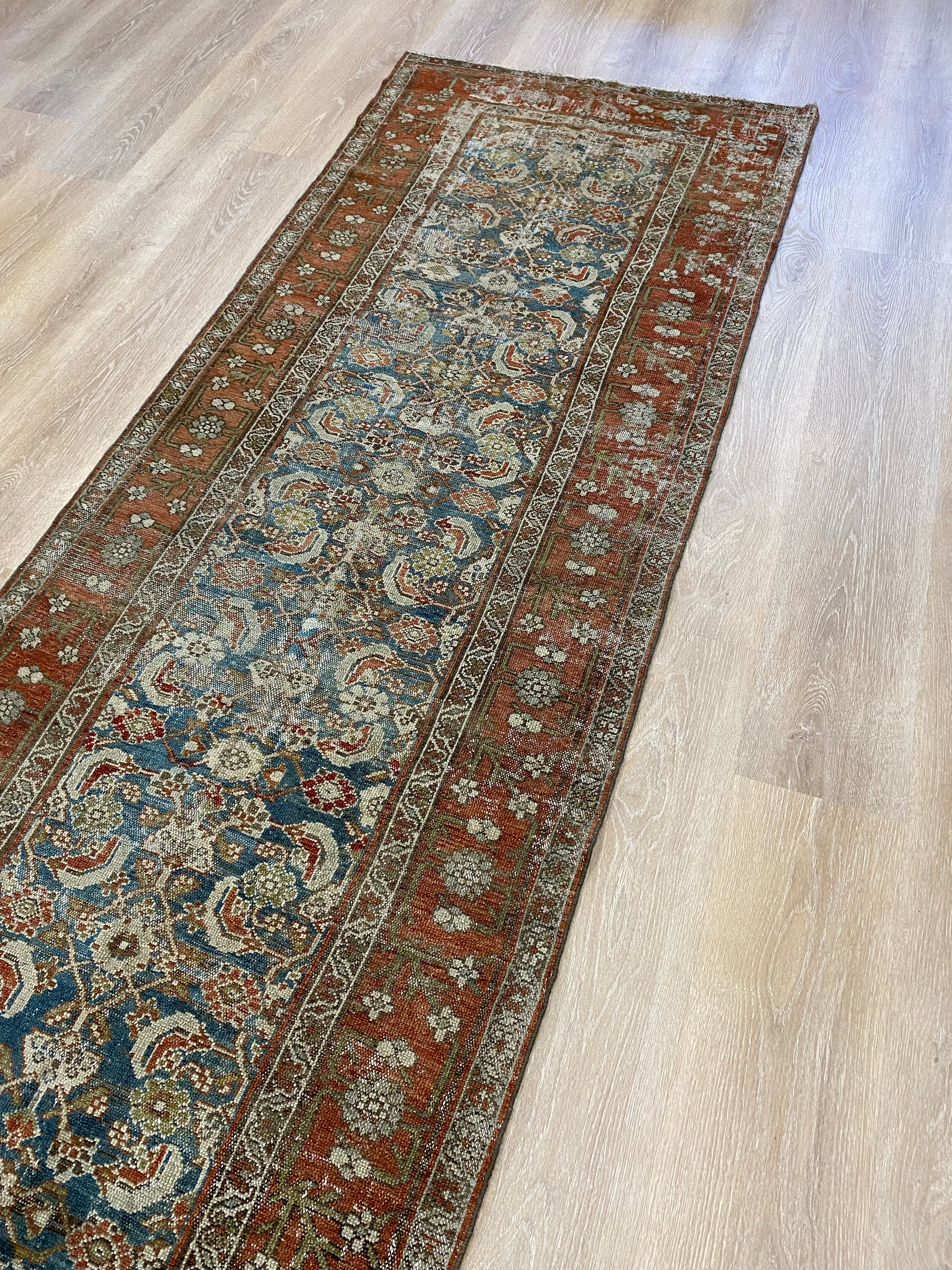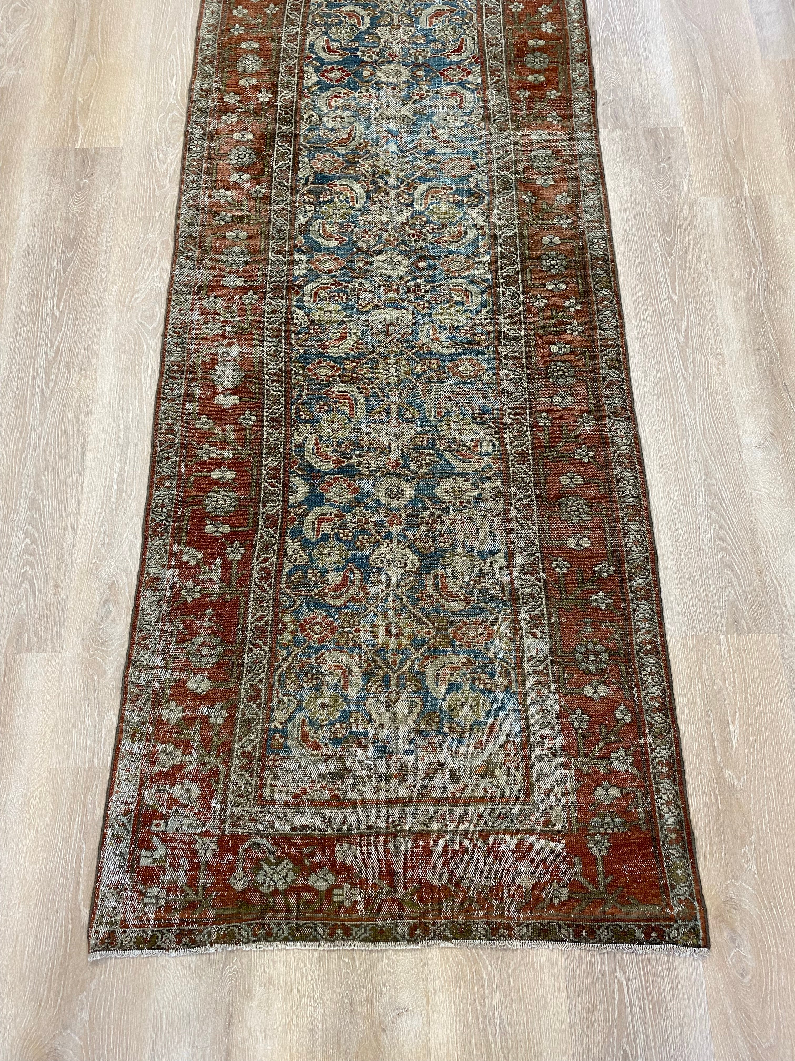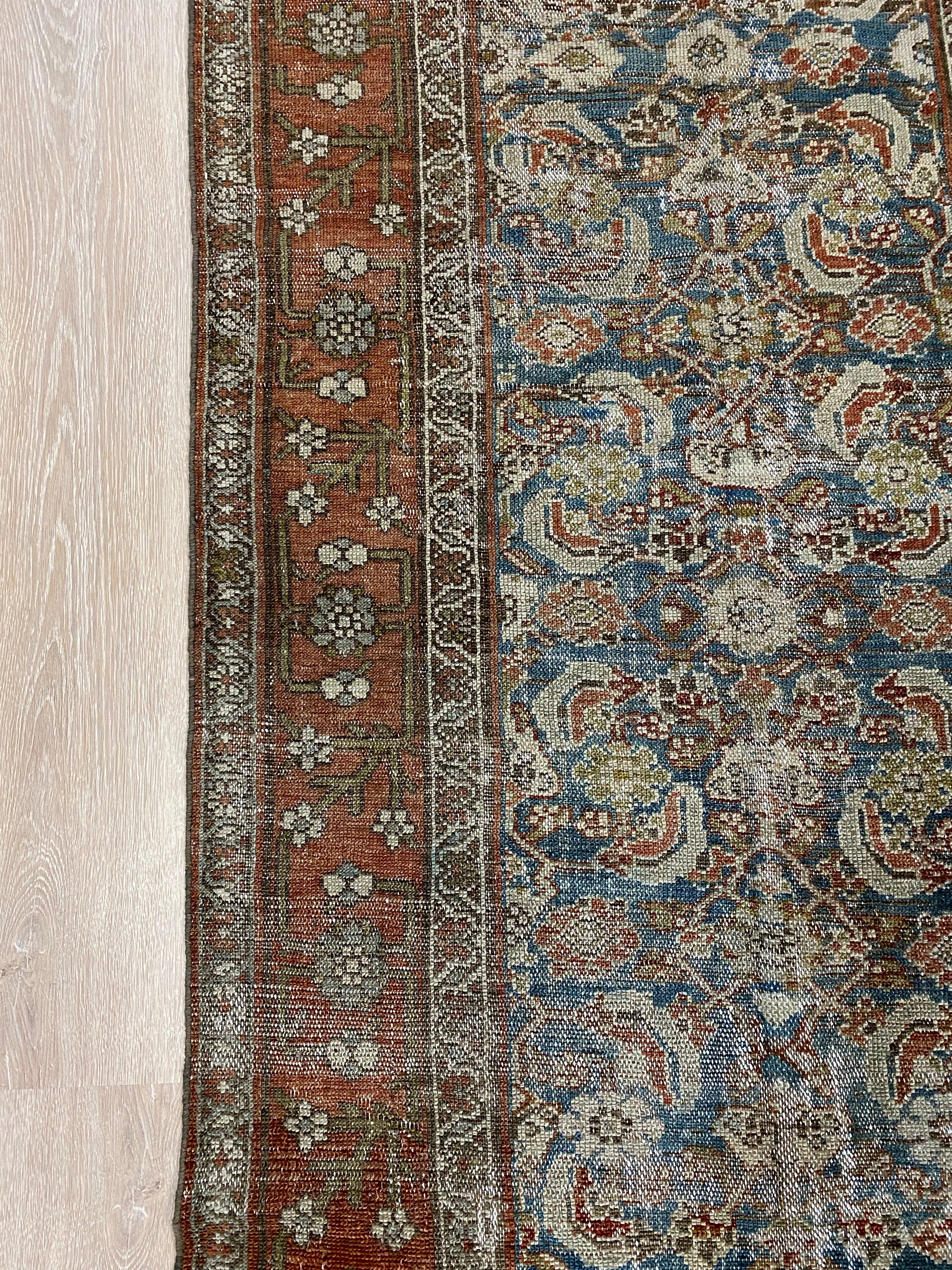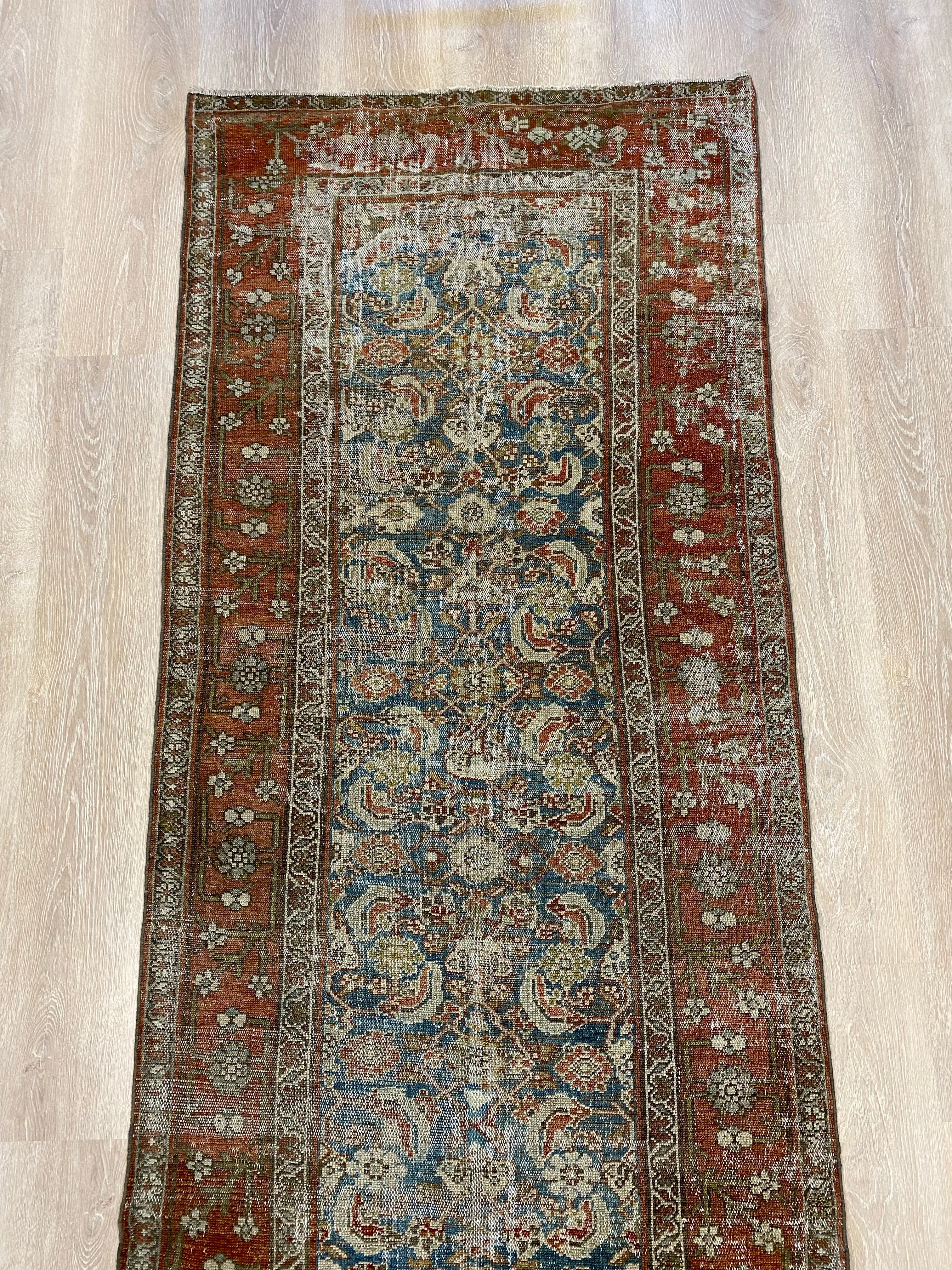 Colors: deep rust/red border and accents throughout the runner. The field is rich denim blue. Olive green and taupe detailing throughout