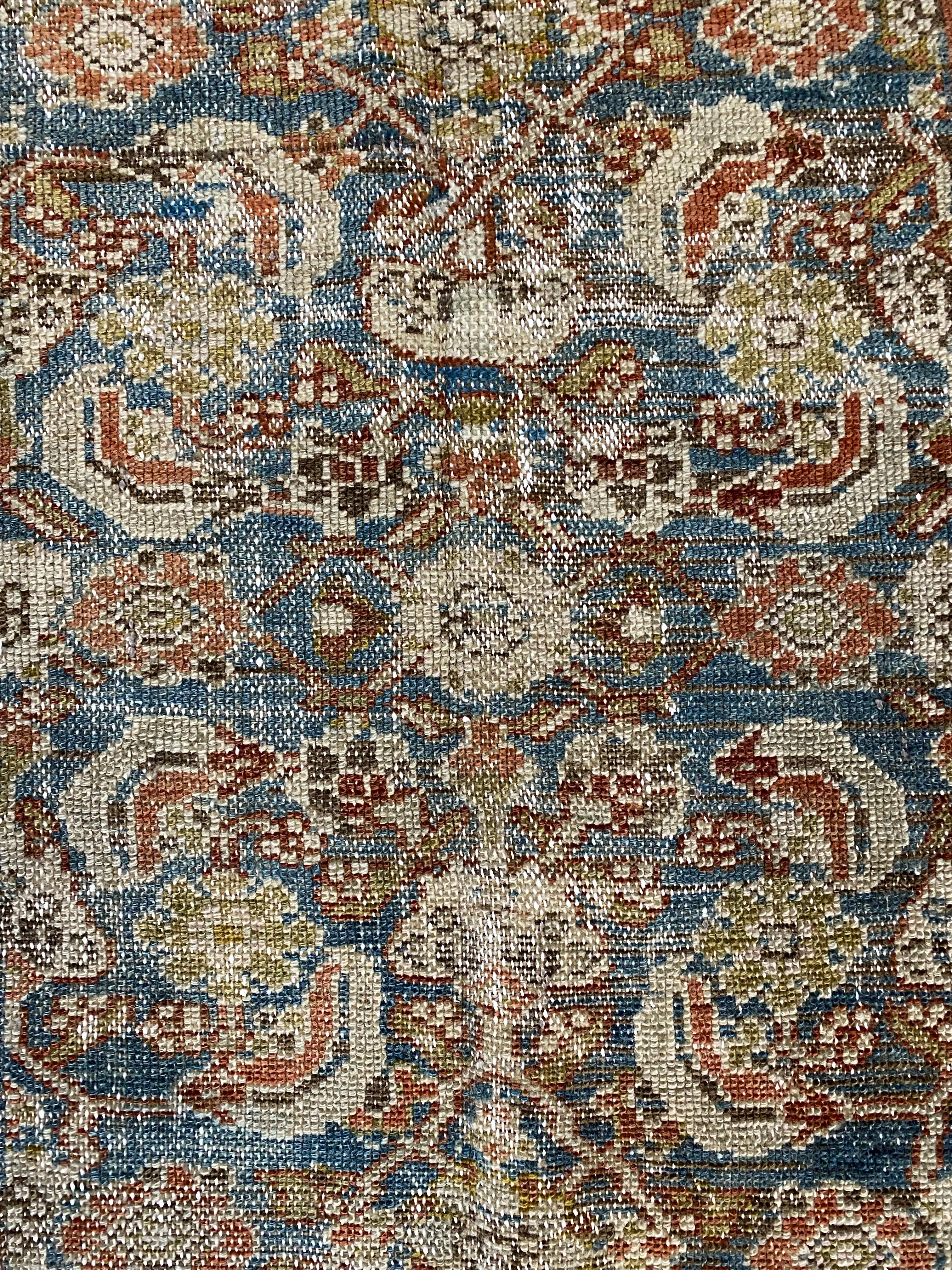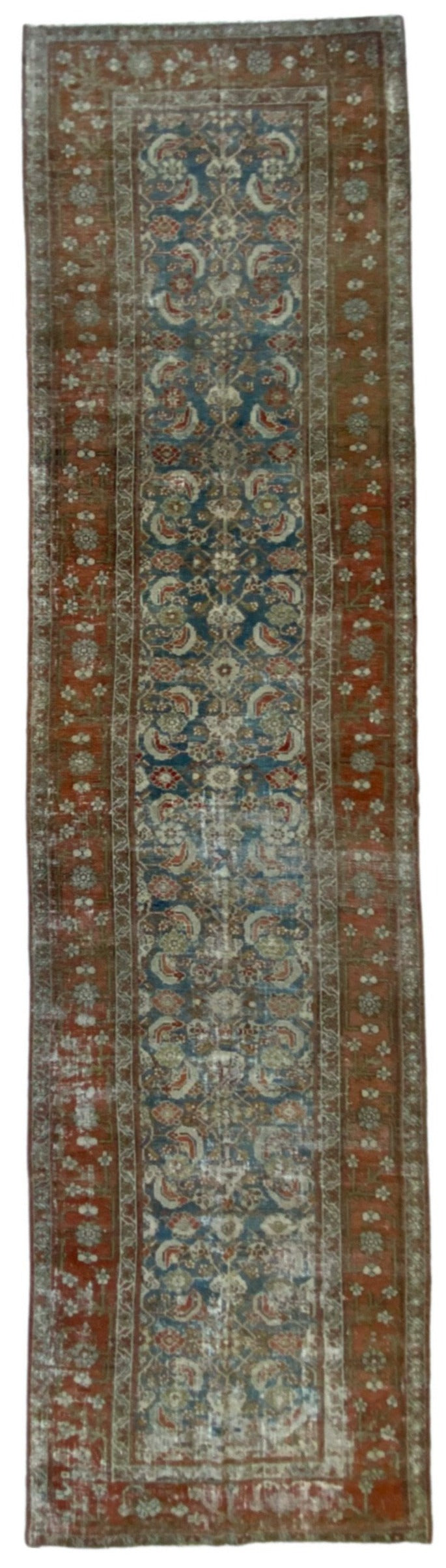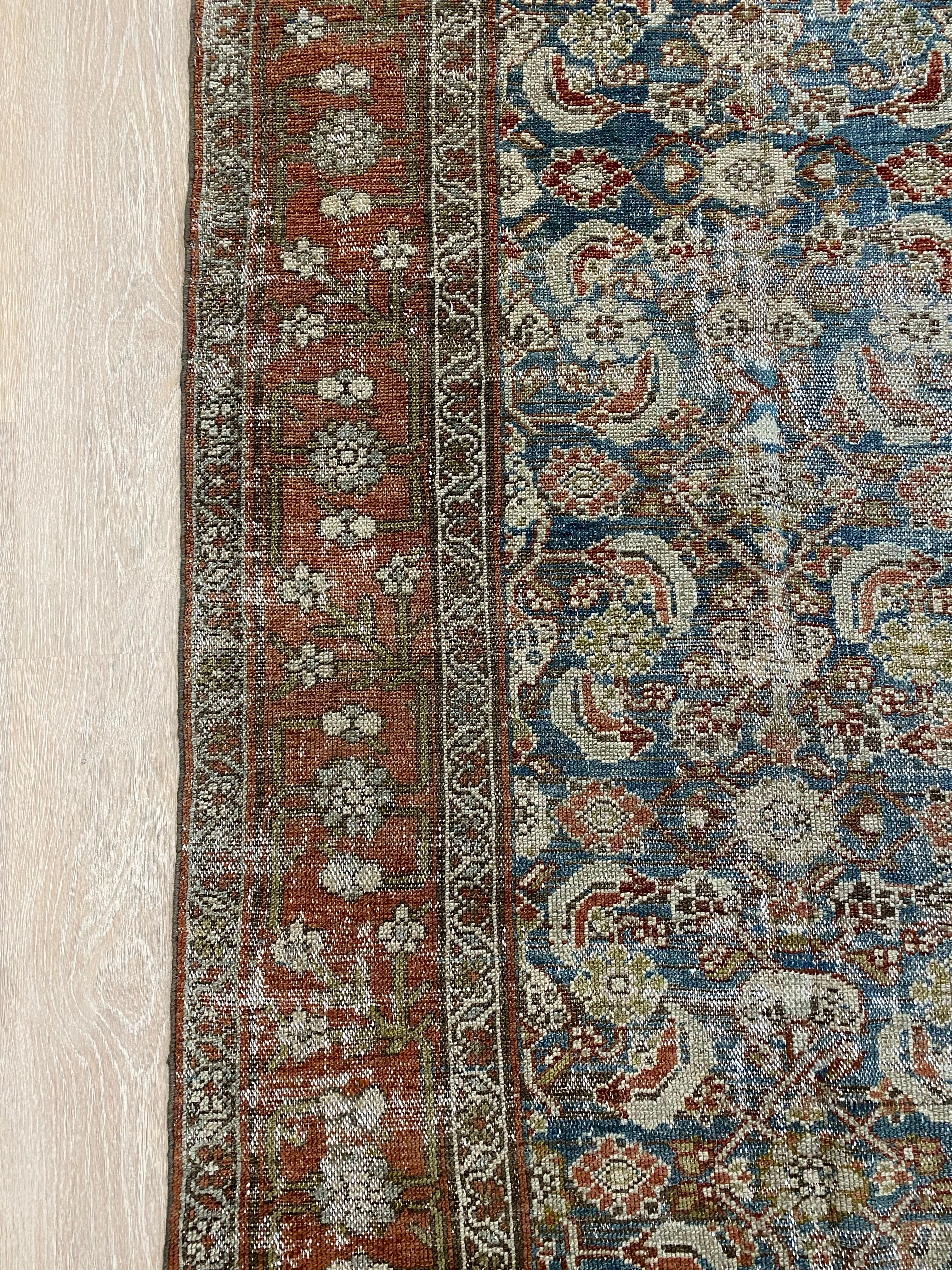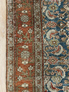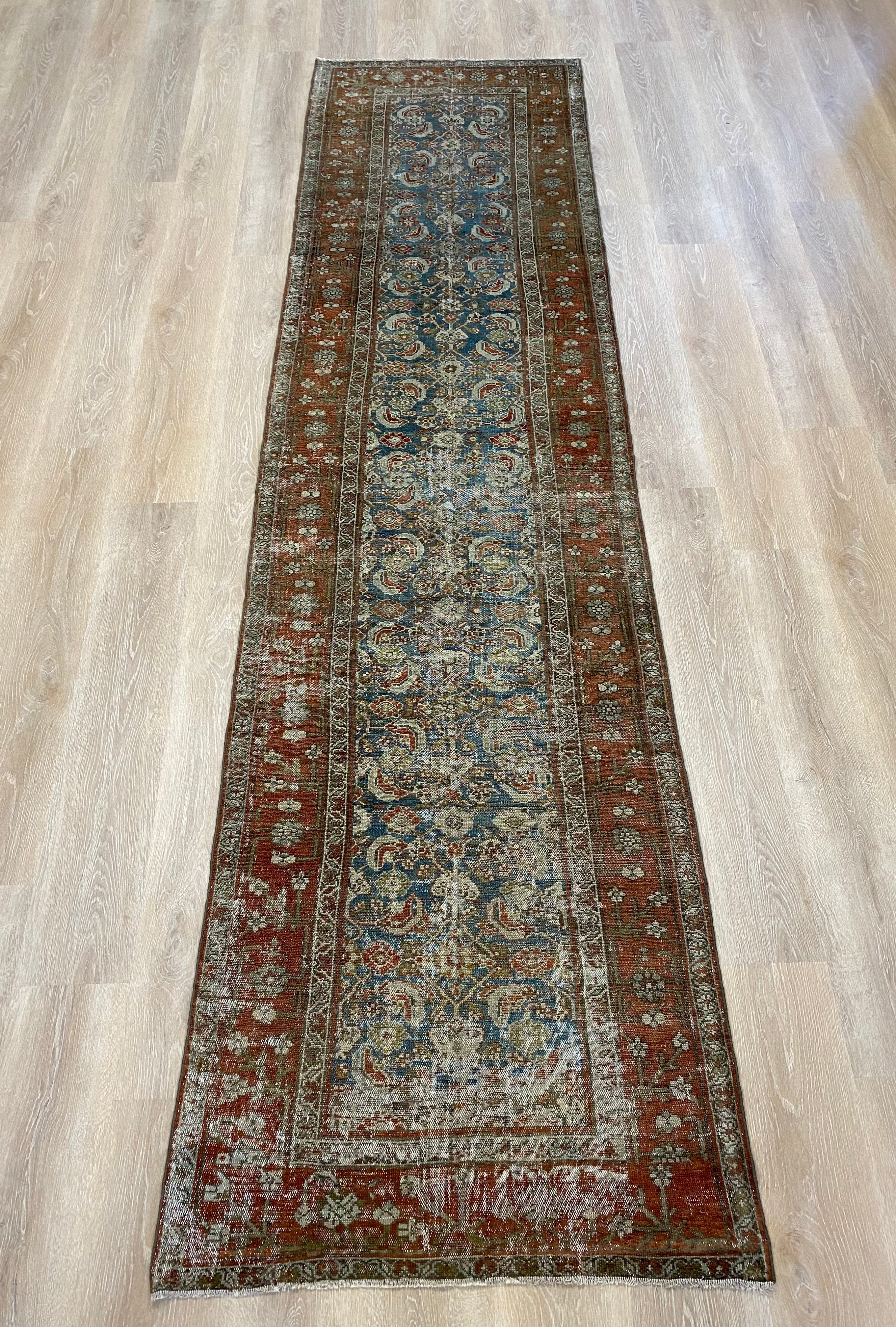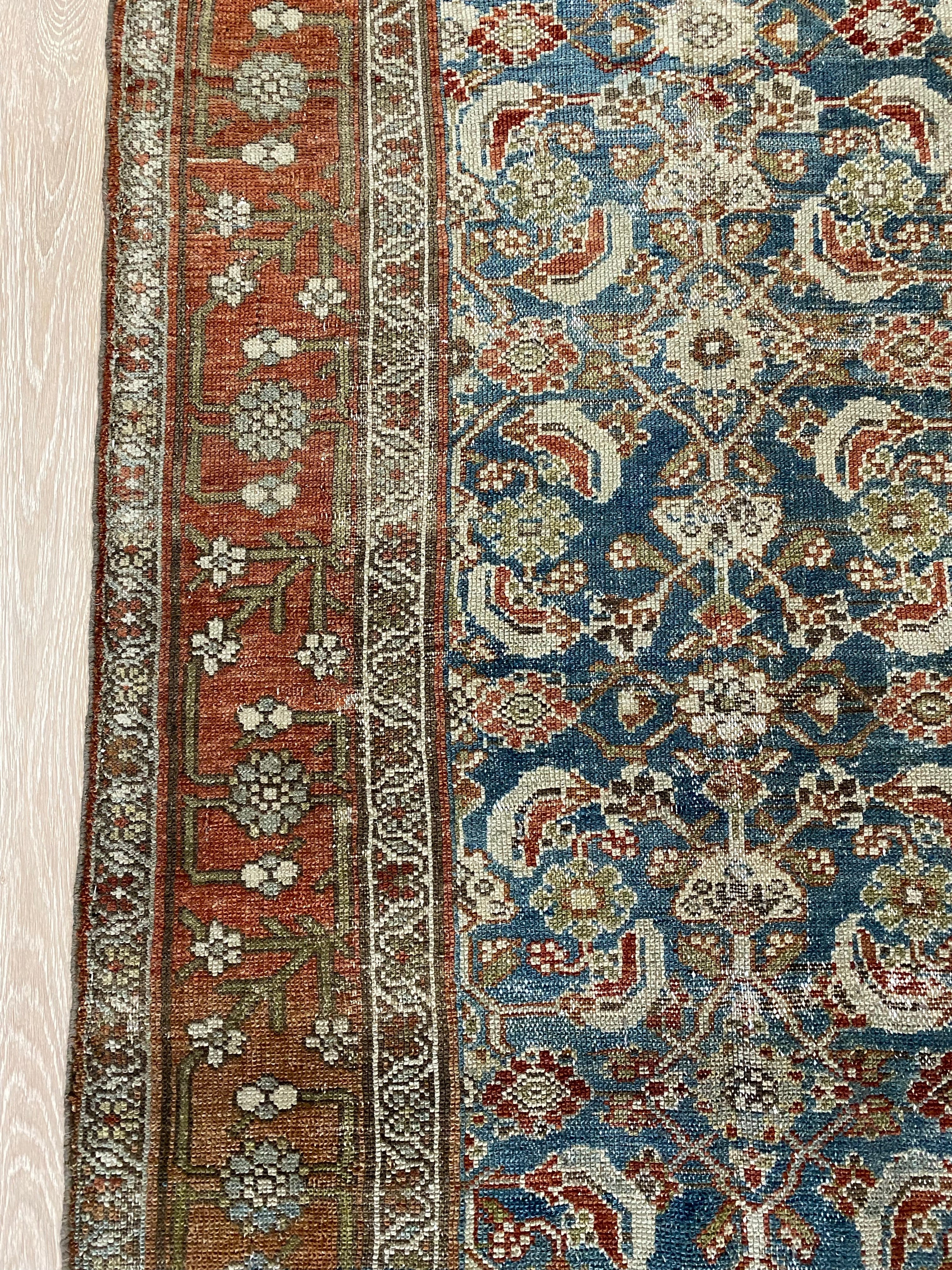 Colors: deep rust/red border and accents throughout the runner. The field is rich denim blue. Olive green and taupe detailing throughout