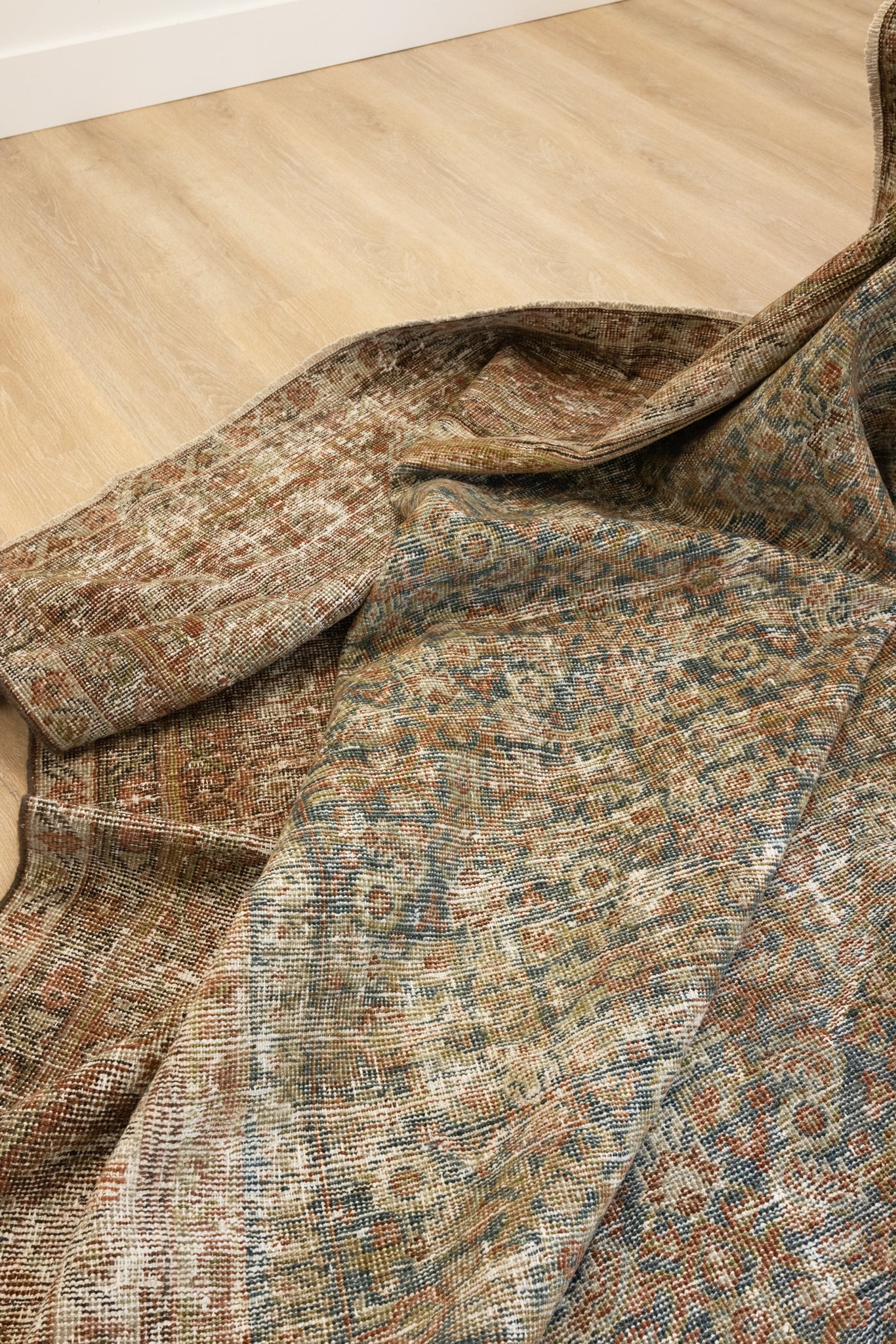 This rug has been professionally cleaned. Spot clean using the blotting technique, using a damp cloth. Take to a professional cleaner if the rug requires a deeper clean.