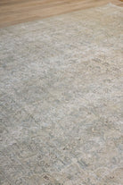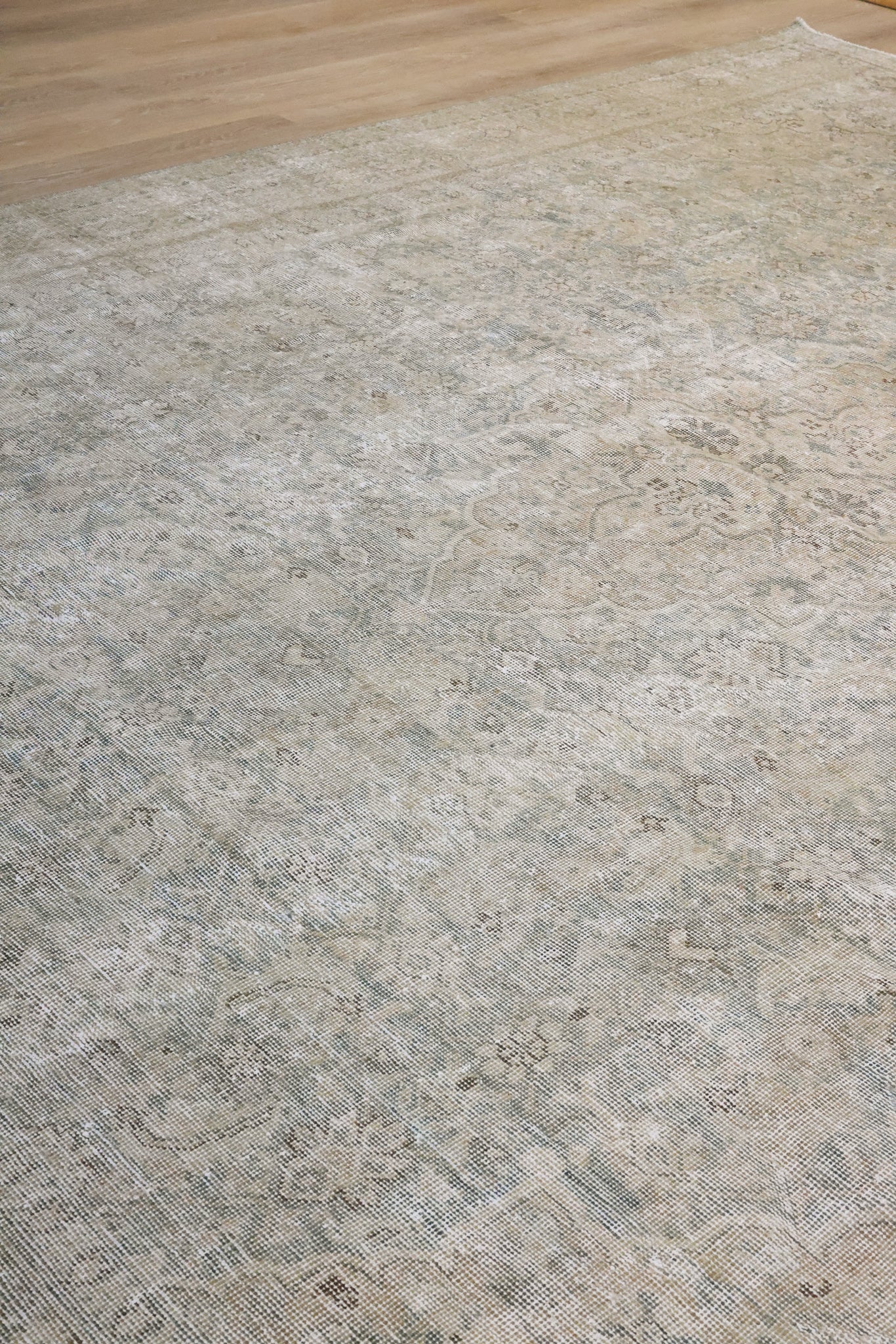 Colors: light oat with muted seafoam throughout the rug, accents of chocolate brown throughout