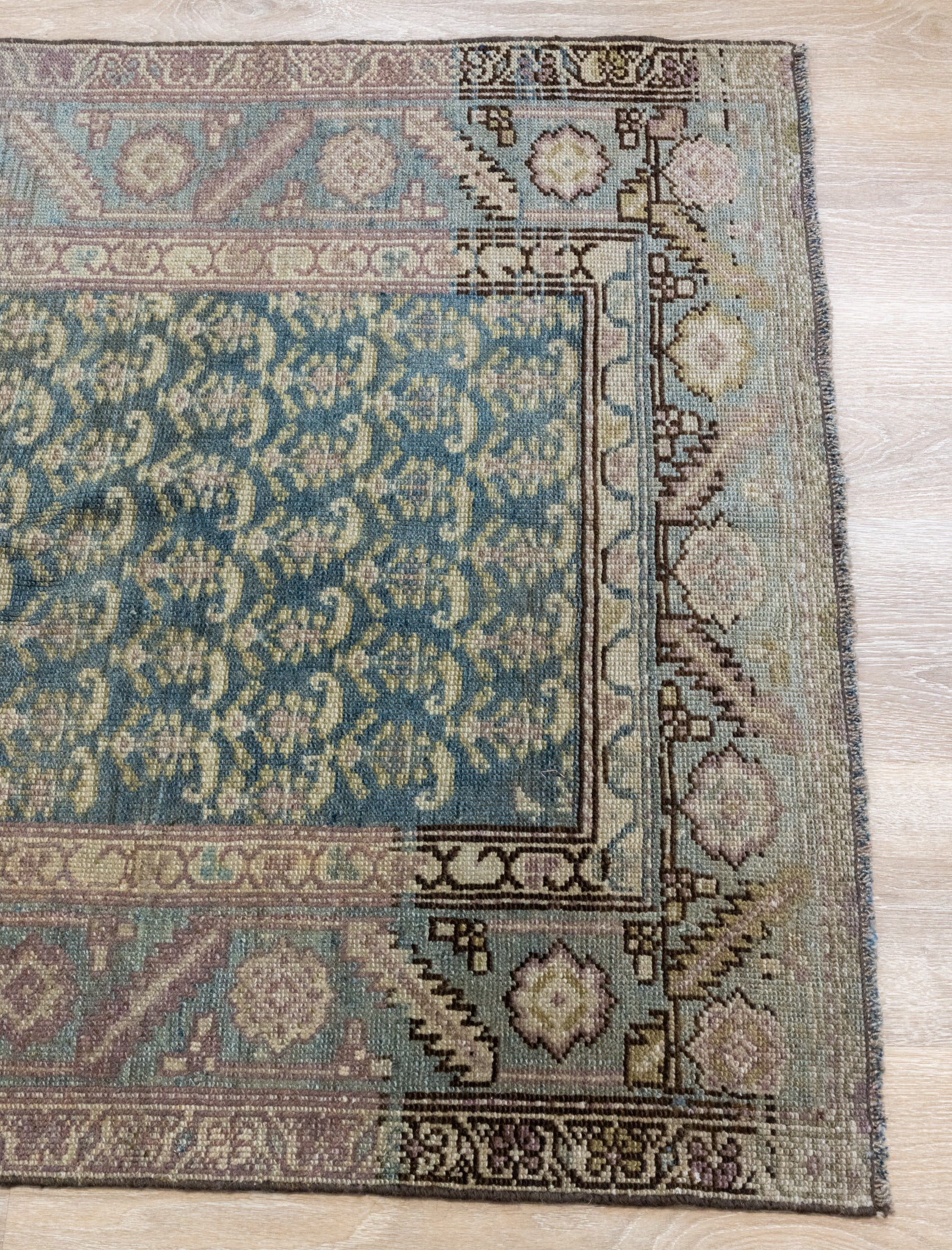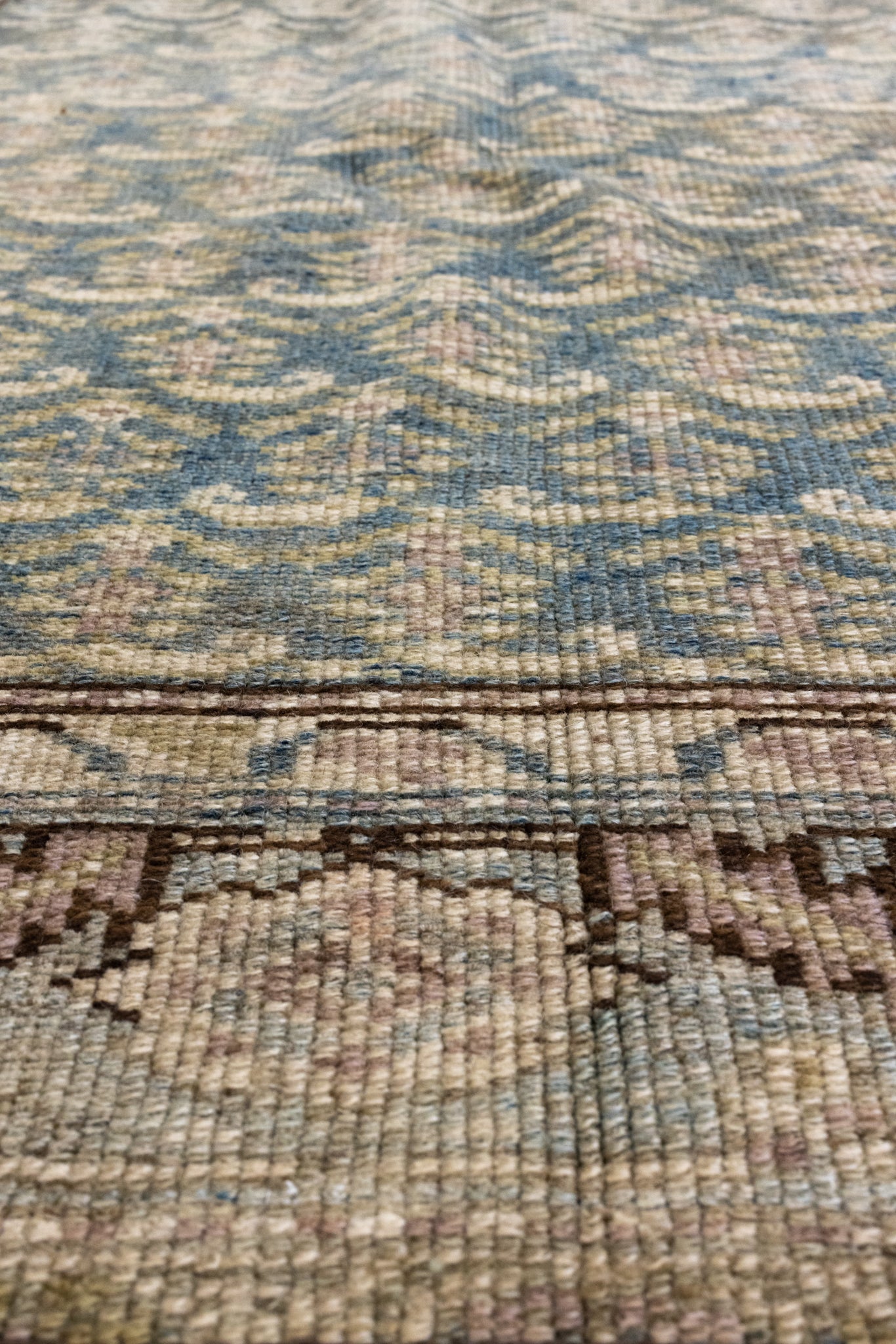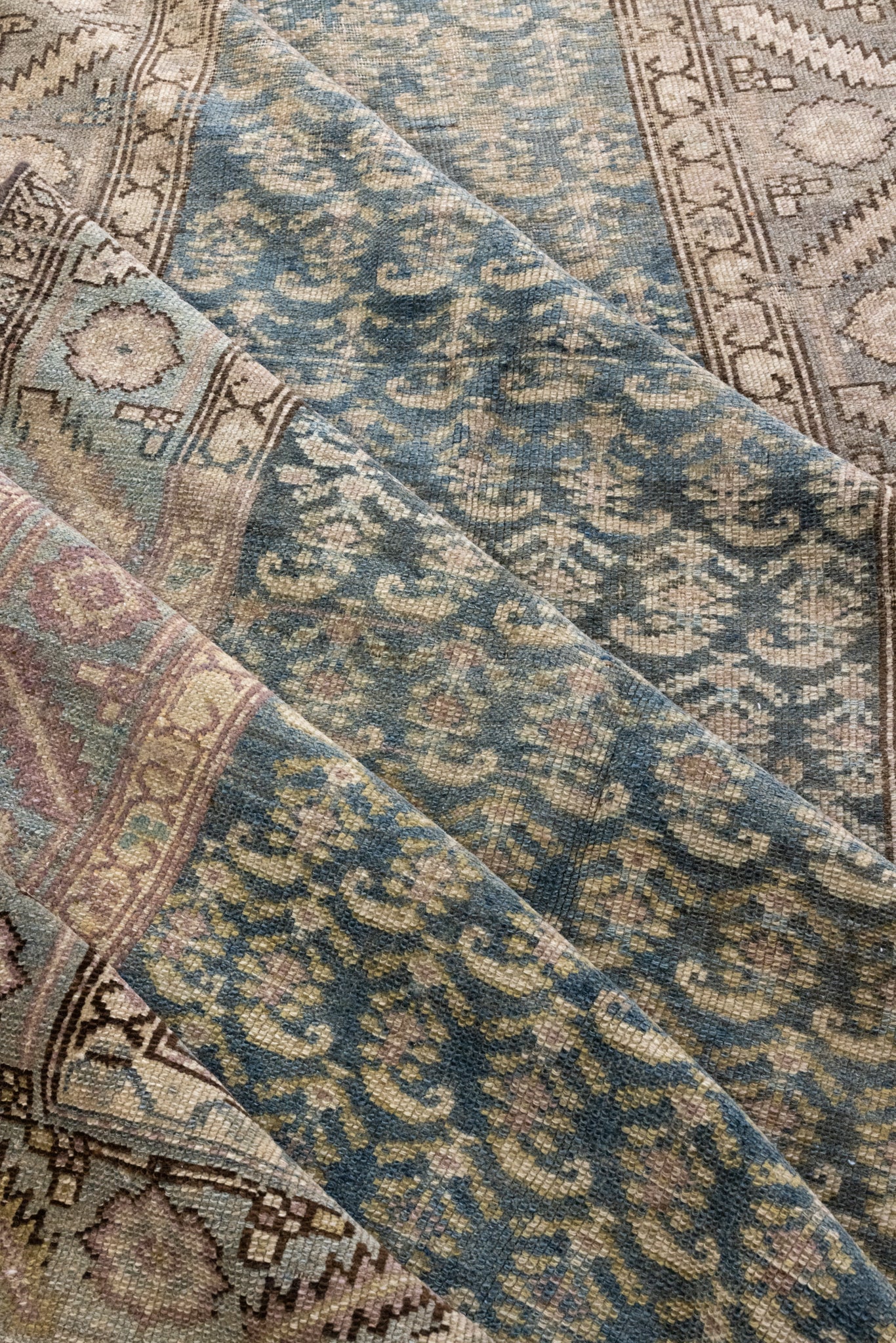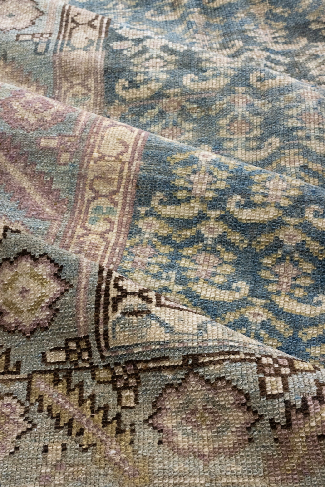 Colors: deep ocean blue, deep aegean blue, light steel blue, lavender detailing on the boarder of one end of the rug, olive green, hazel, chocolate brown, gray taupe