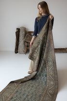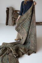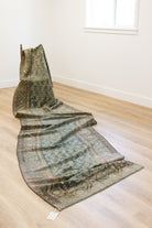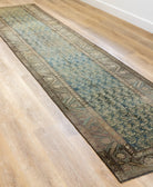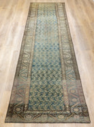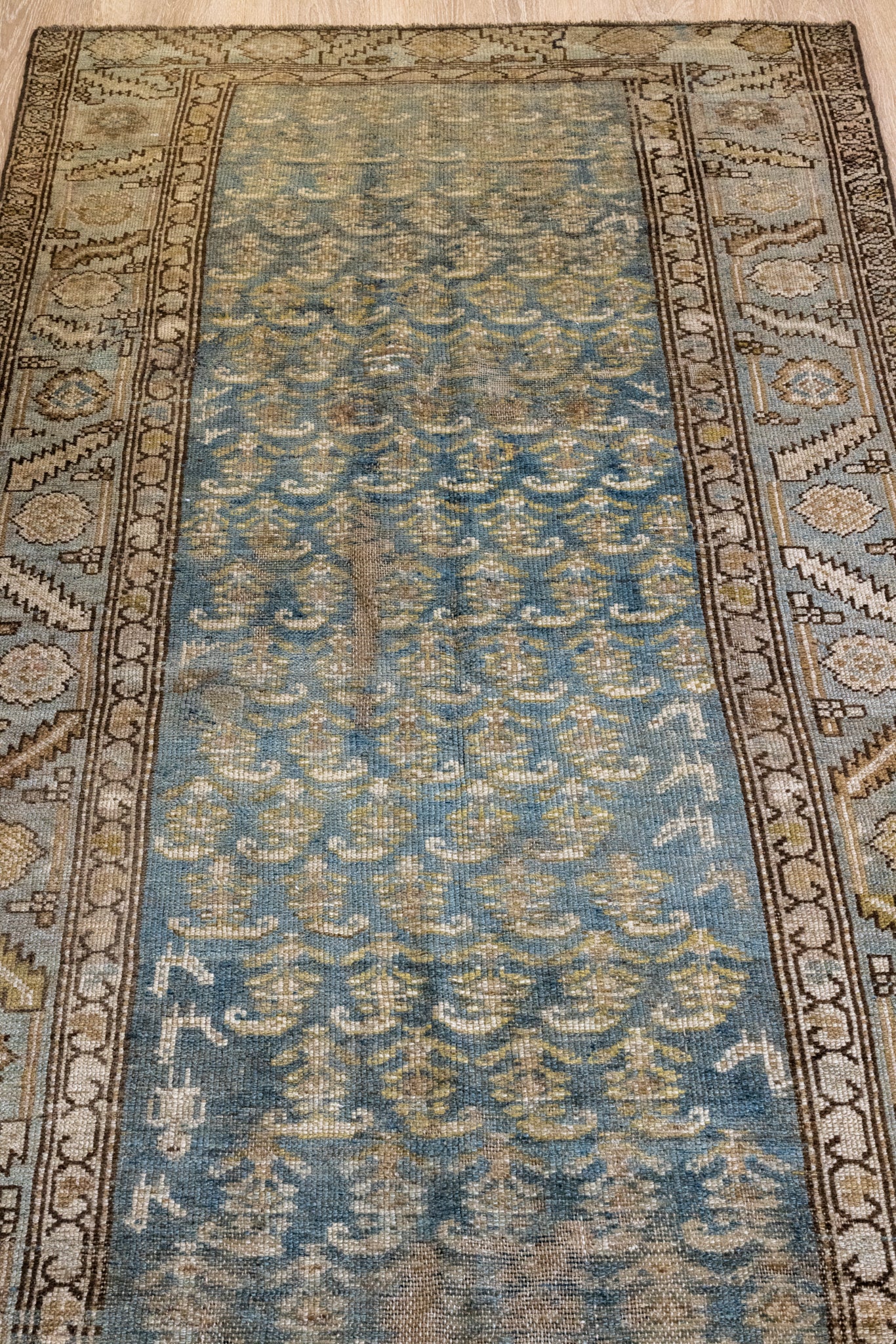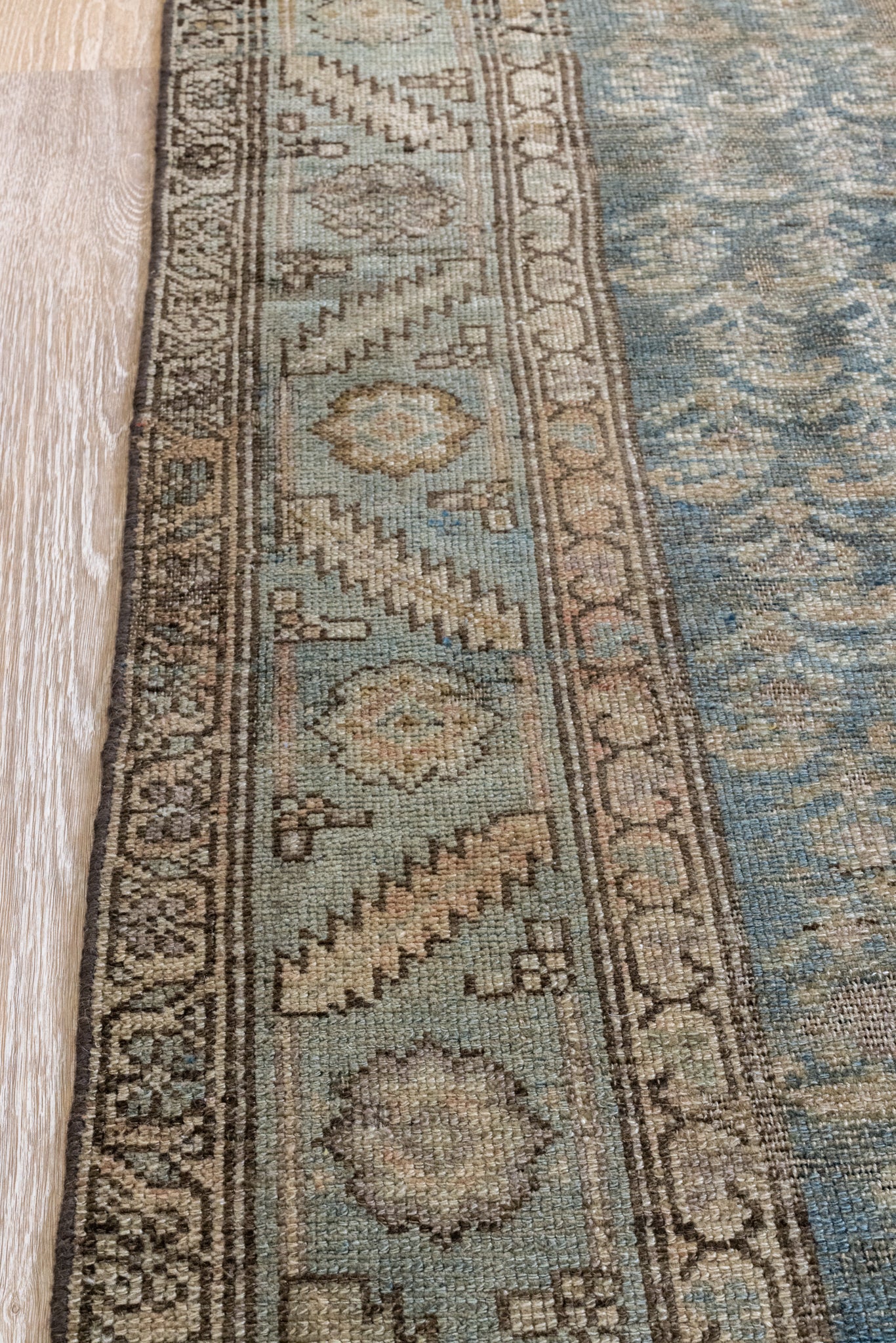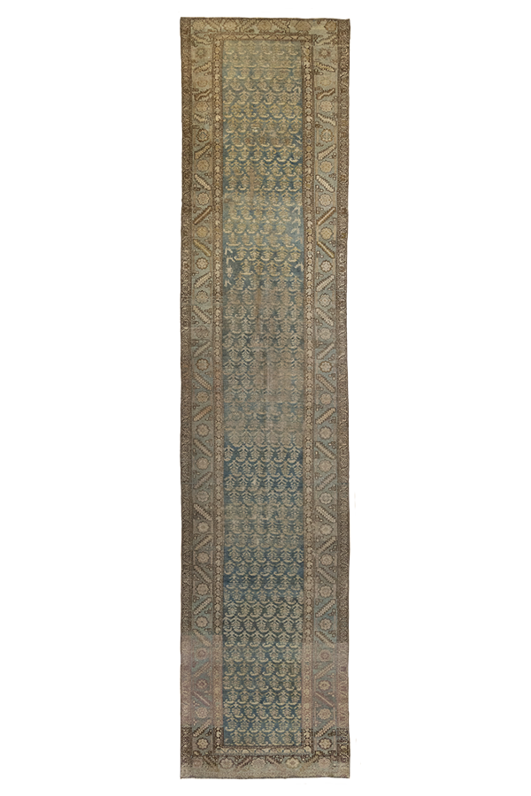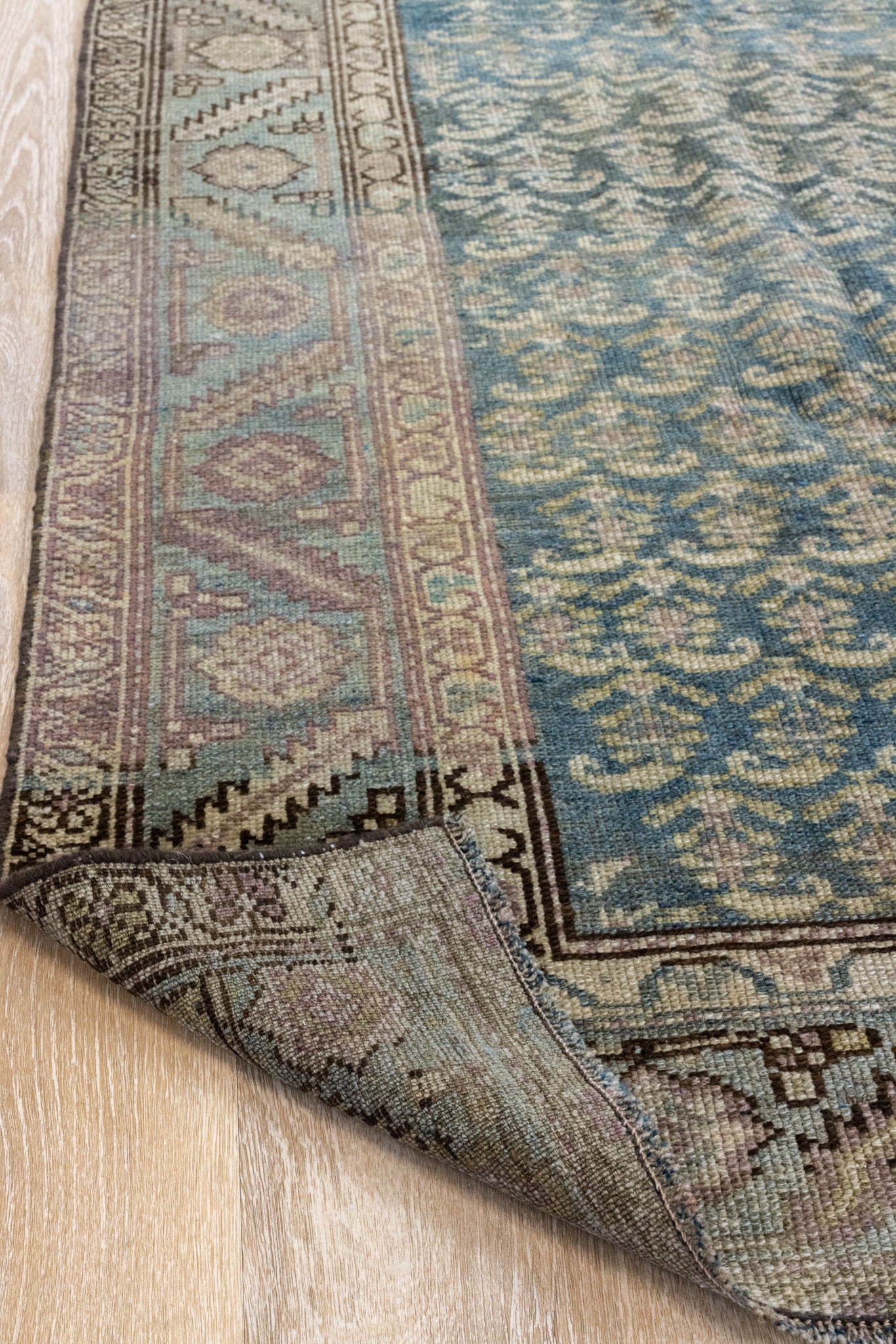 Colors: deep ocean blue, deep aegean blue, light steel blue, lavender detailing on the boarder of one end of the rug, olive green, hazel, chocolate brown, gray taupe
