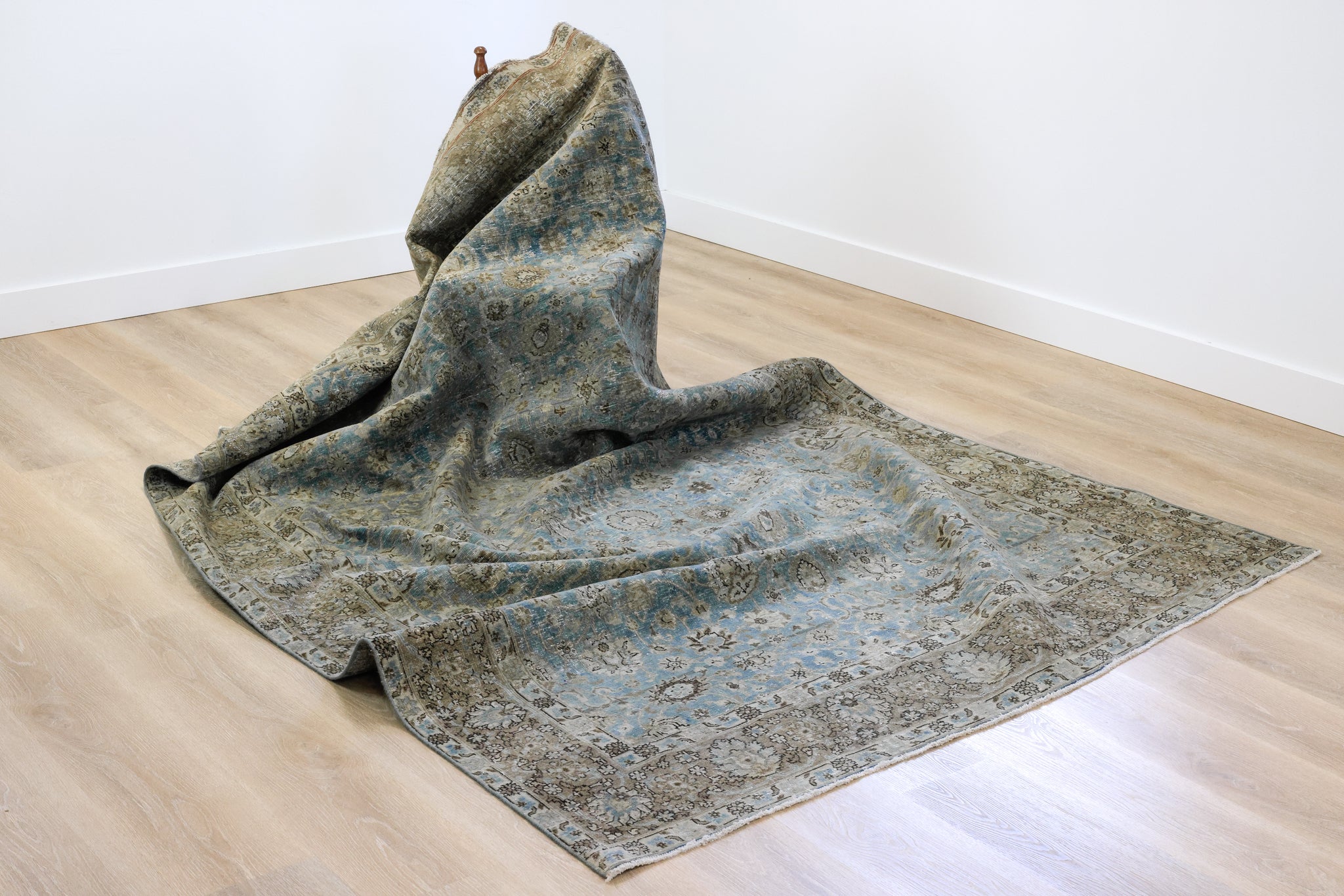 This rug has been professionally cleaned. Spot clean using the blotting technique, using a damp cloth. Take to a professional cleaner if the rug requires a deeper clean.