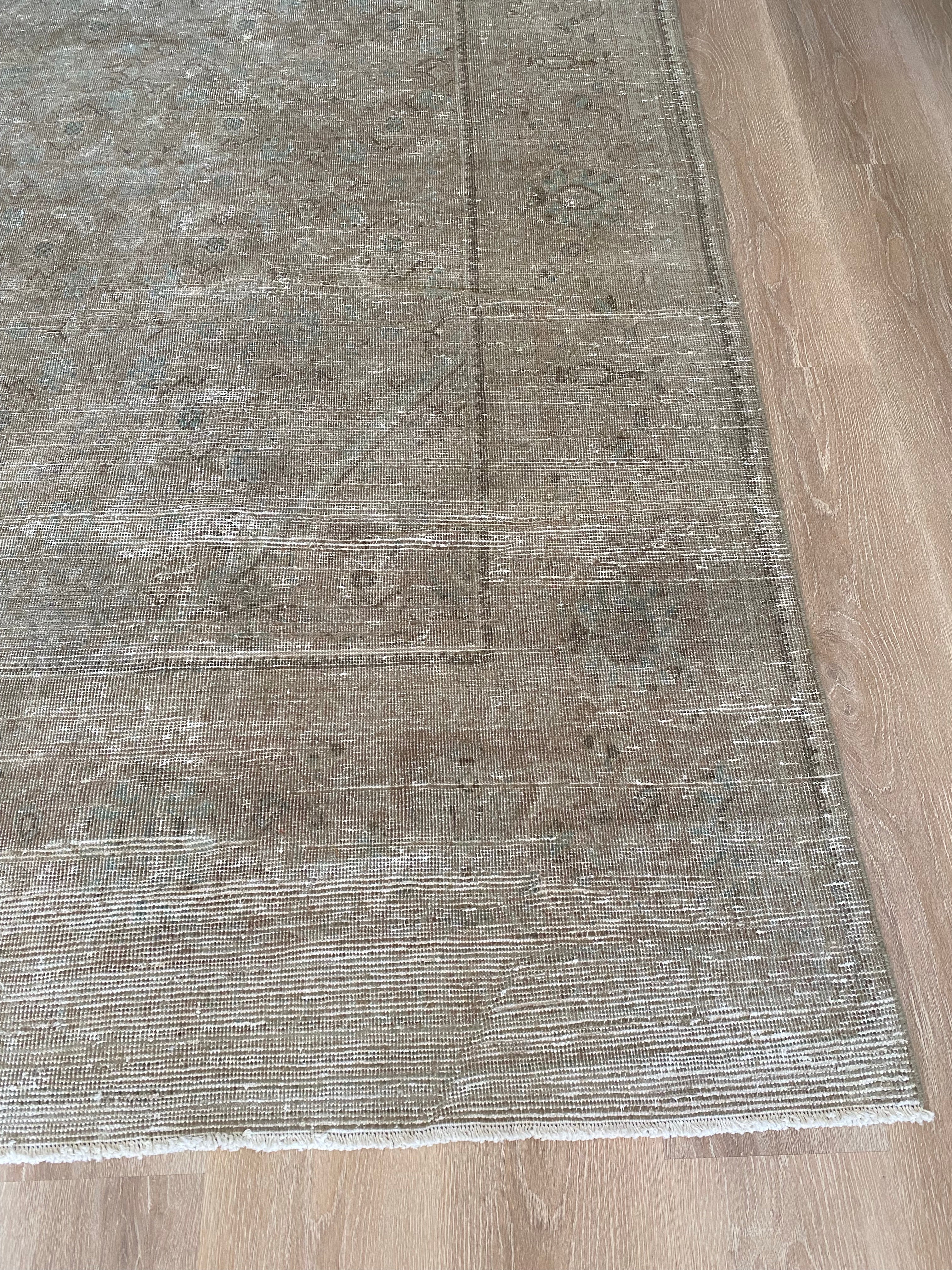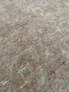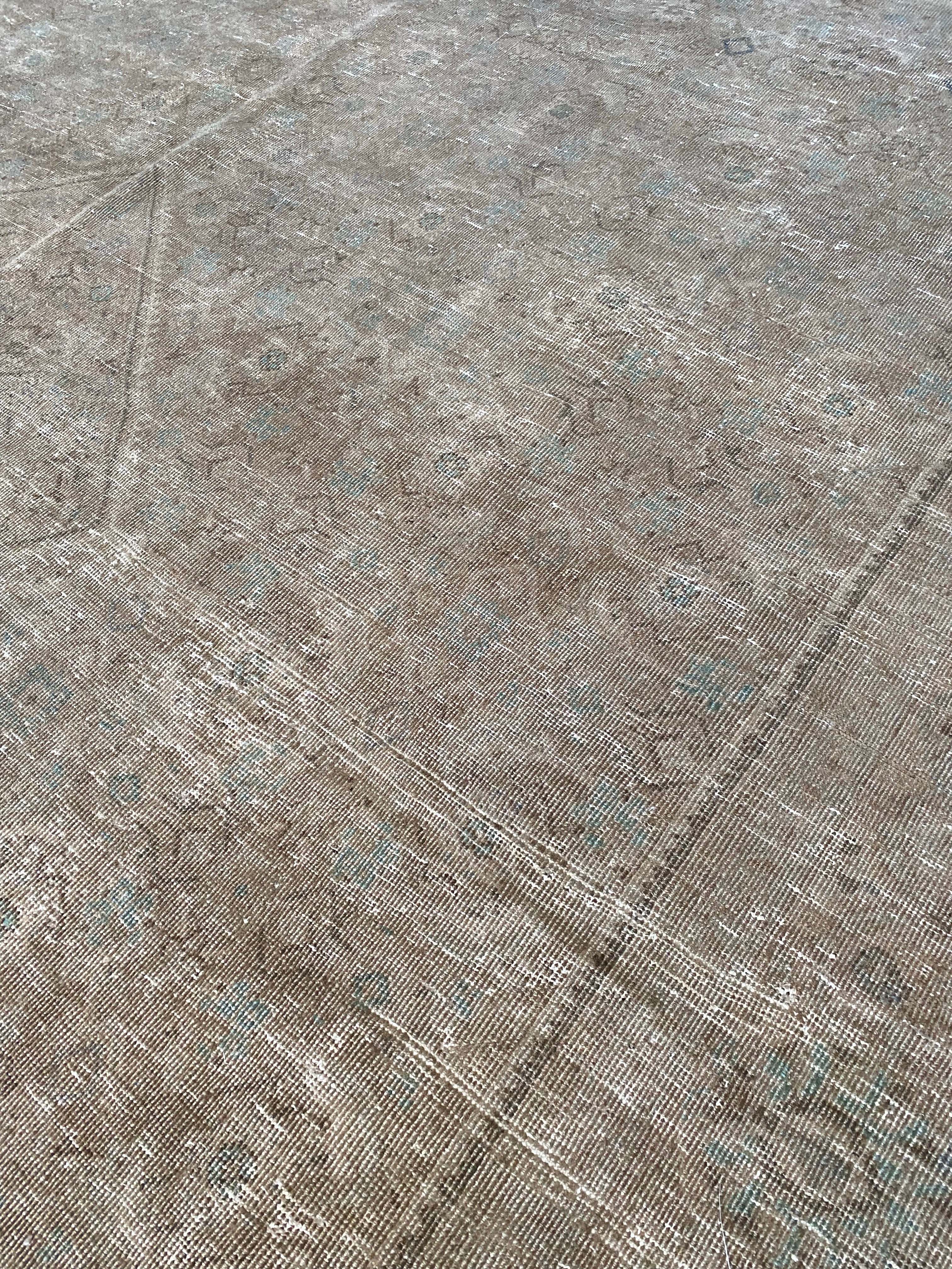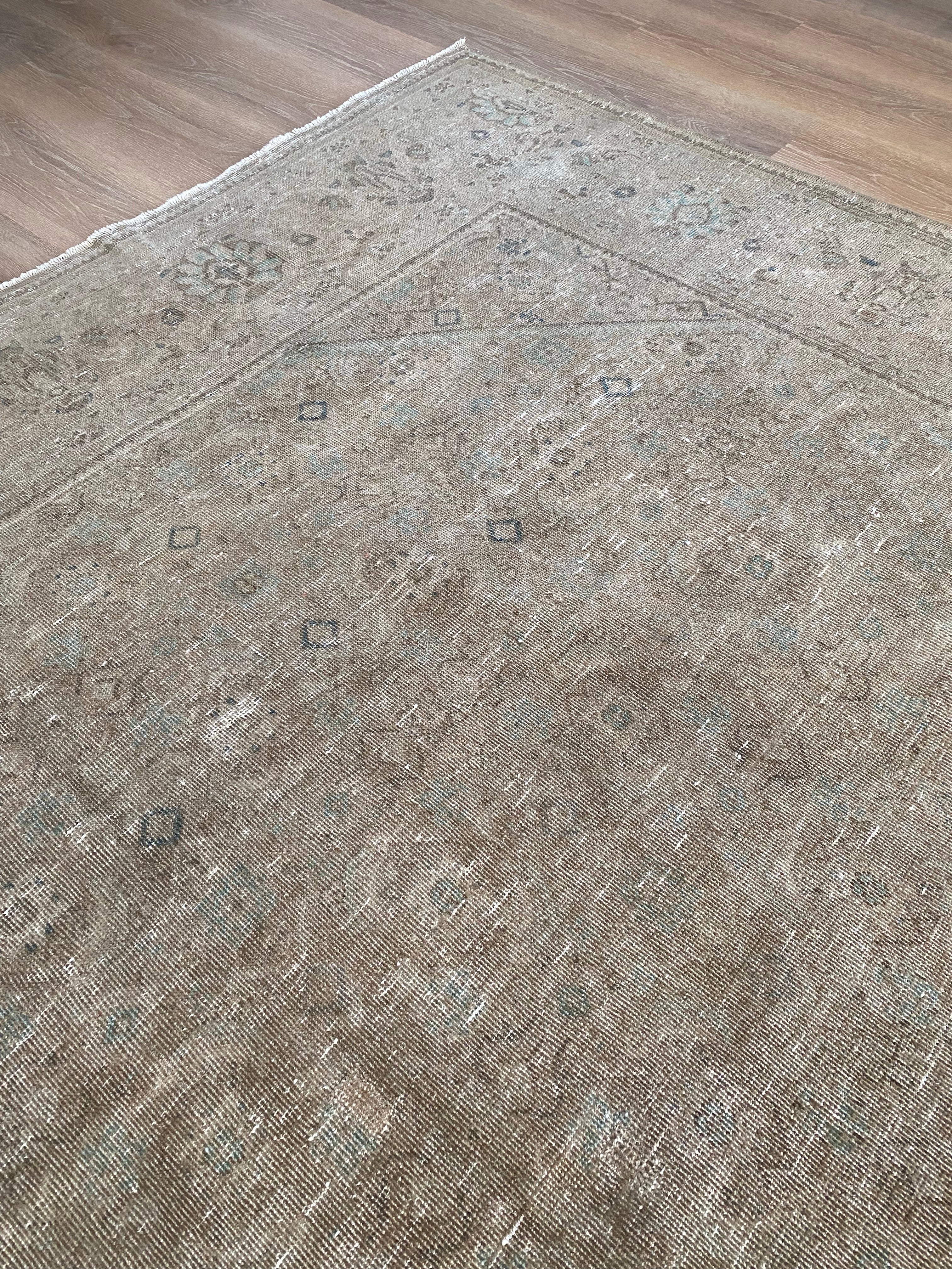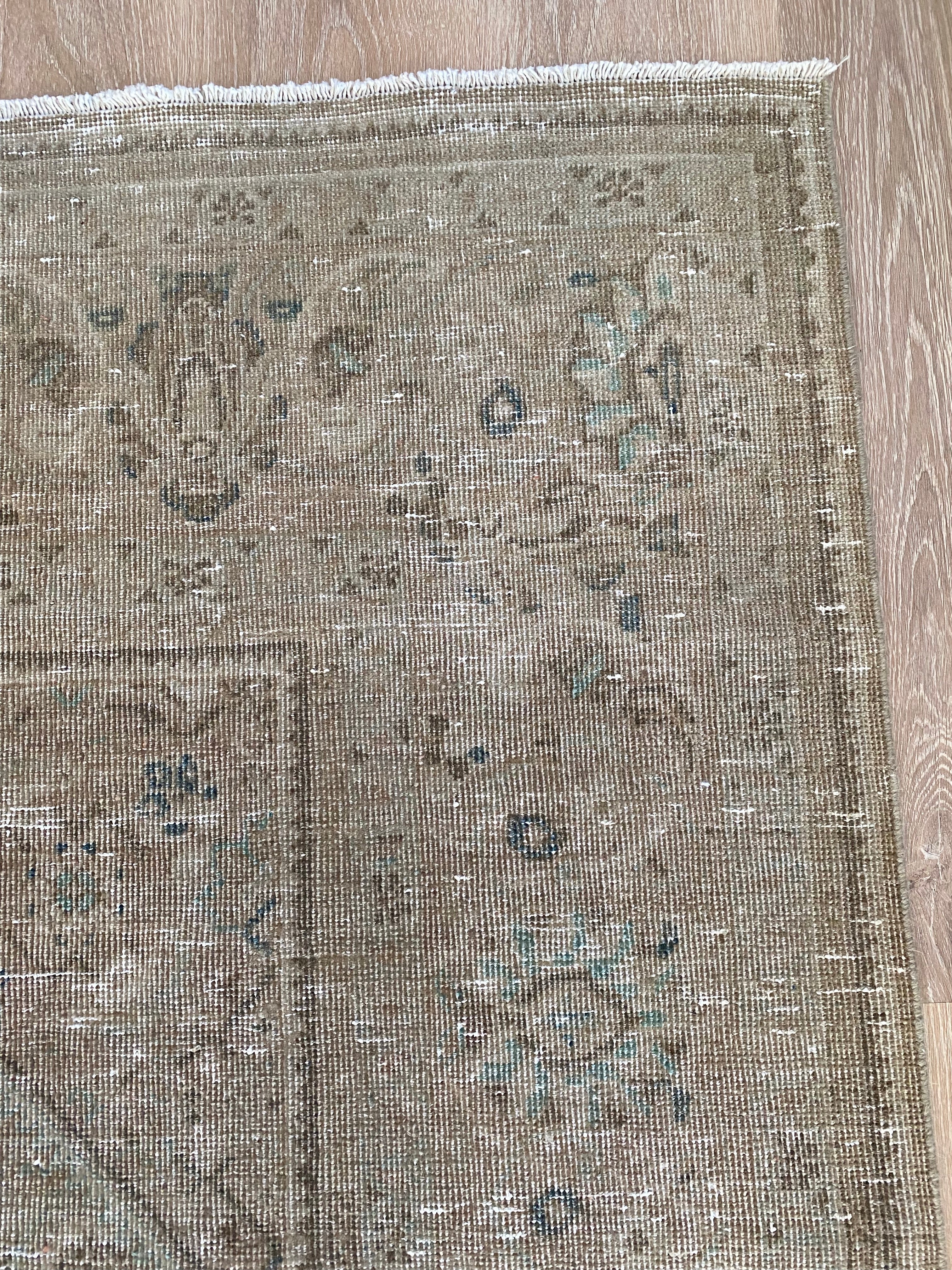 This rug has an all-over taupe/cool sandy tone with mocha detailing. There are muted aqua floral motifs throughout, and more prominent navy geometric patterns on one end of the rug.