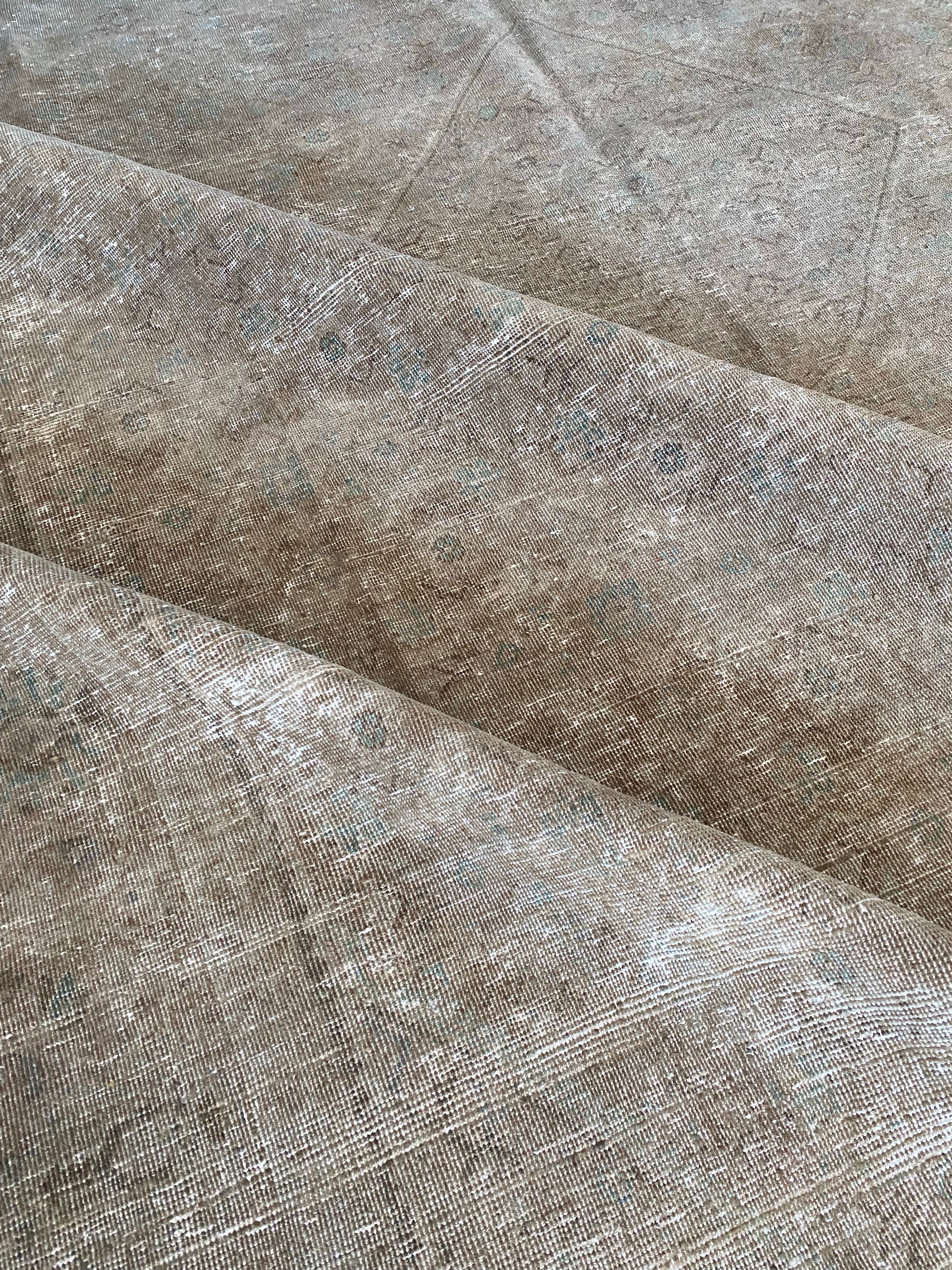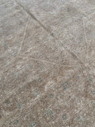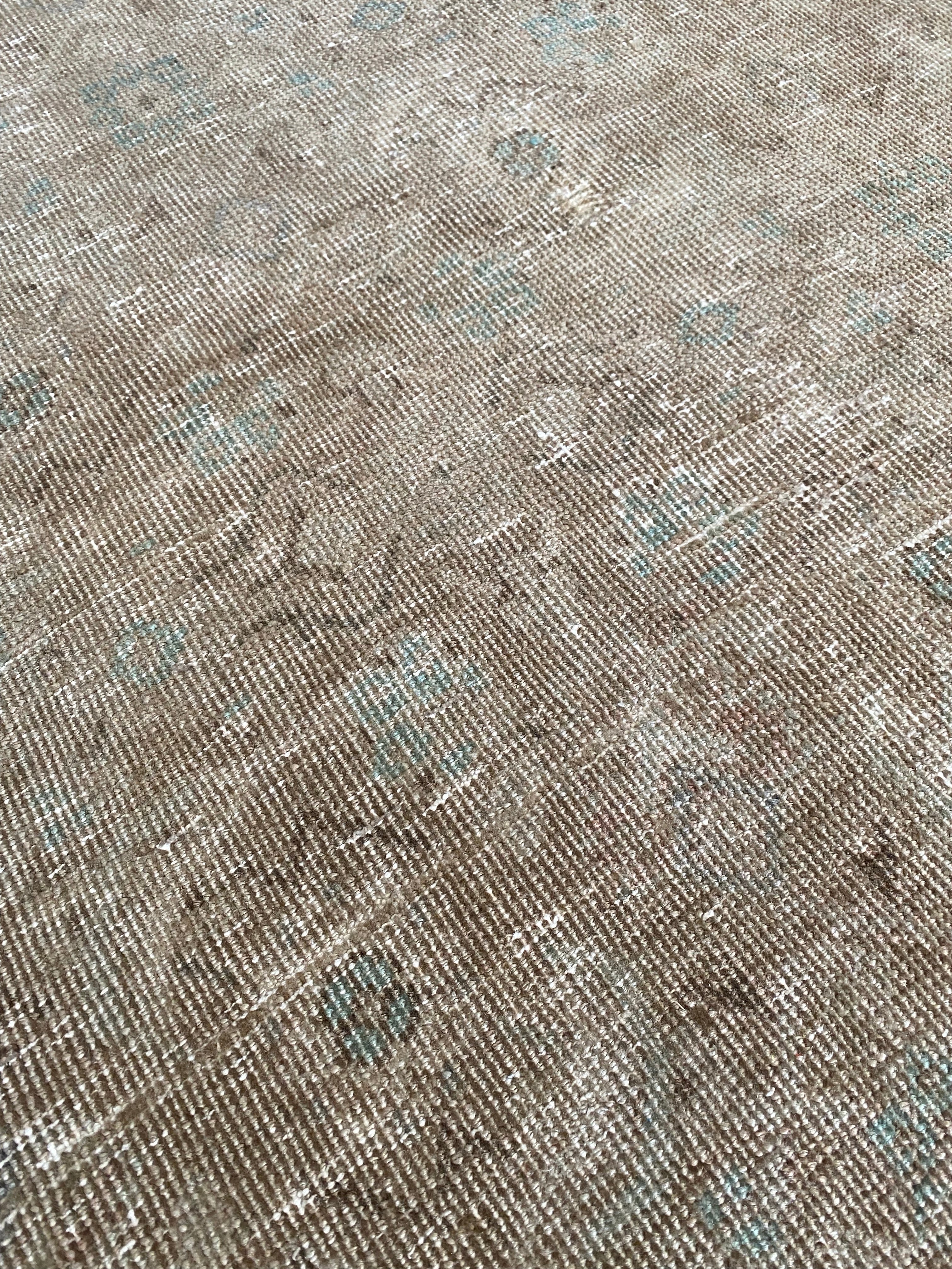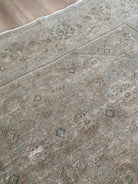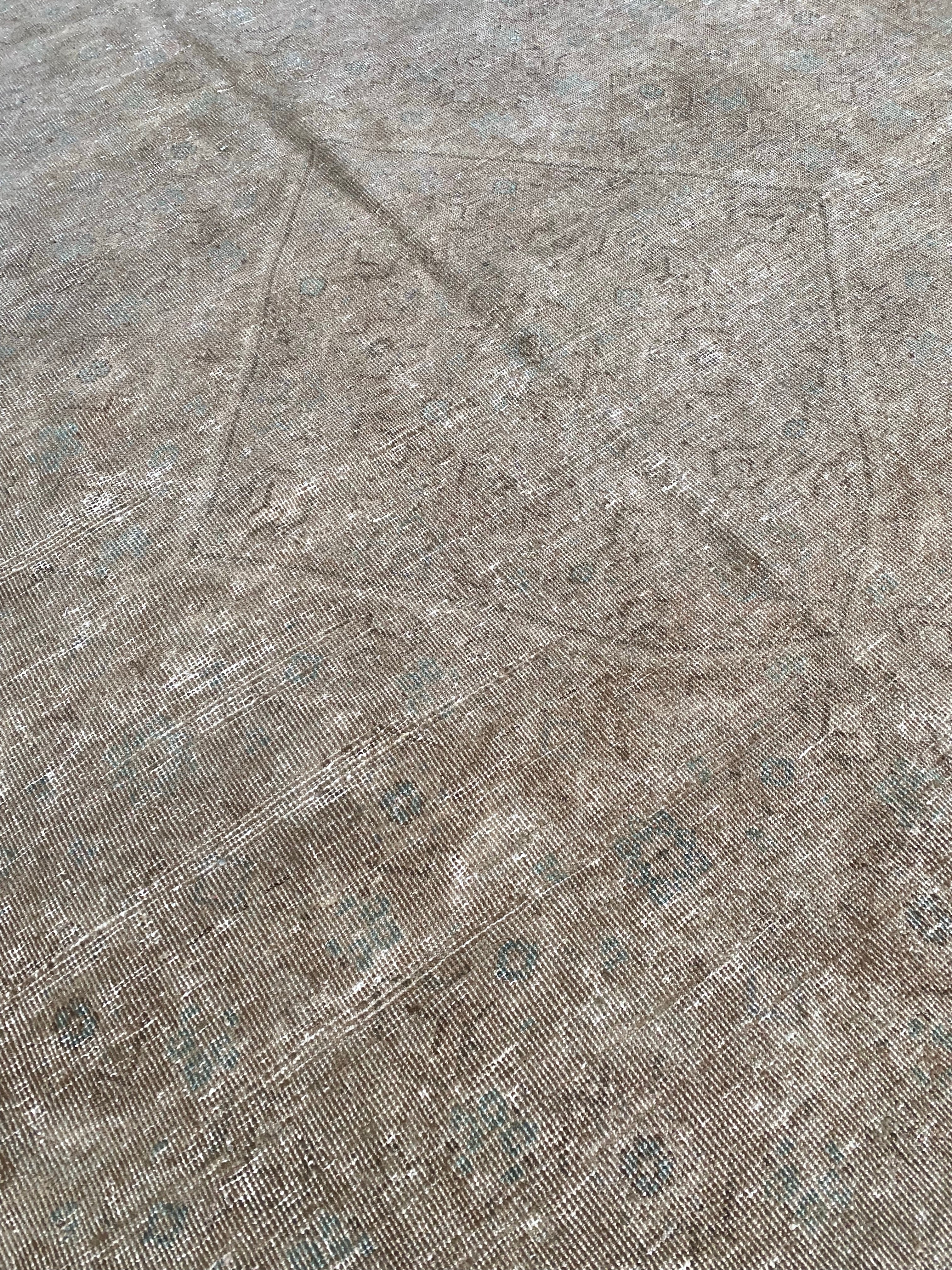 This rug has an all-over taupe/cool sandy tone with mocha detailing. There are muted aqua floral motifs throughout, and more prominent navy geometric patterns on one end of the rug.