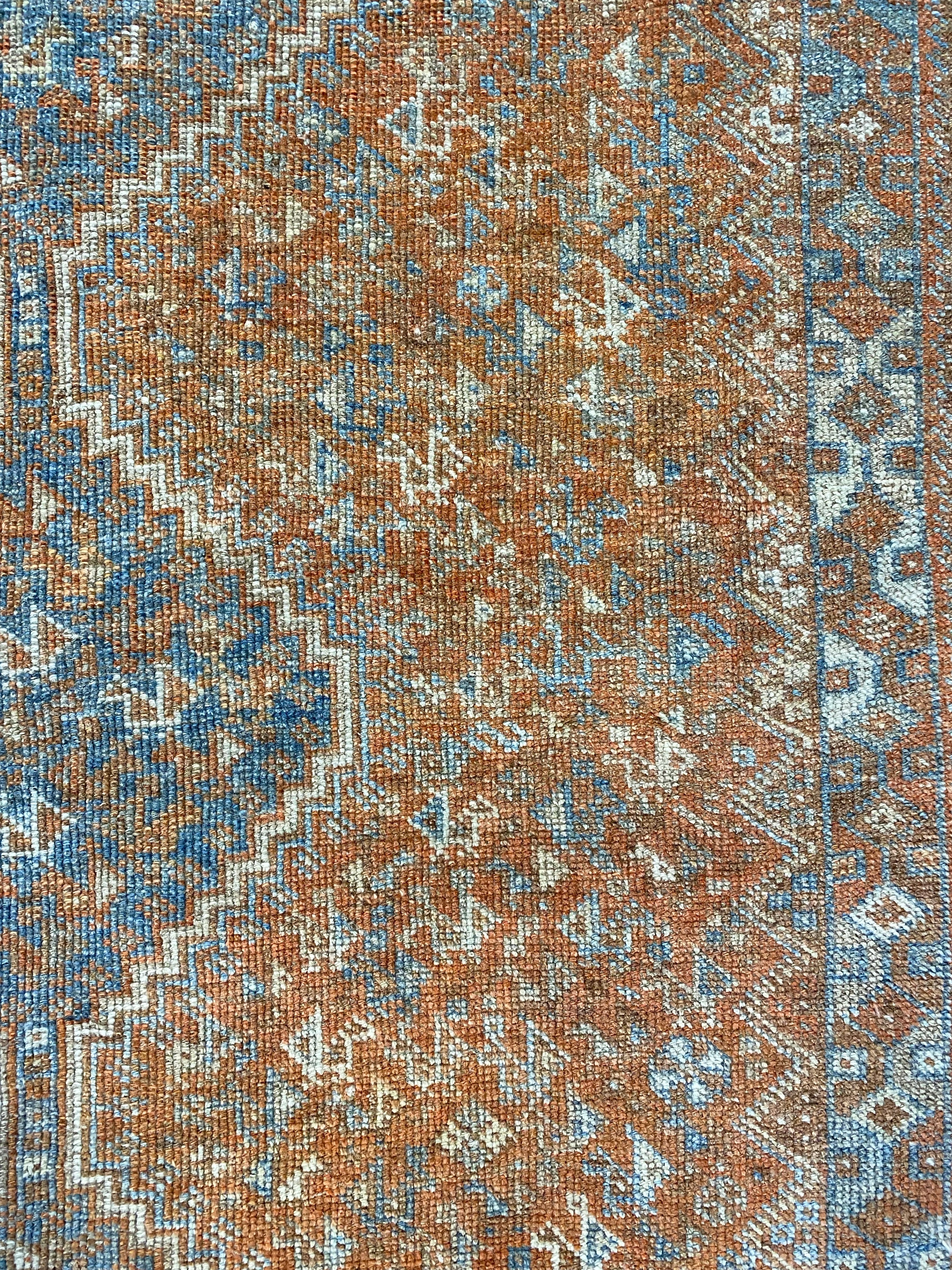 Colors: Rust field with accents of denim blue through the center, with lighter baby blue detailing throughout.
