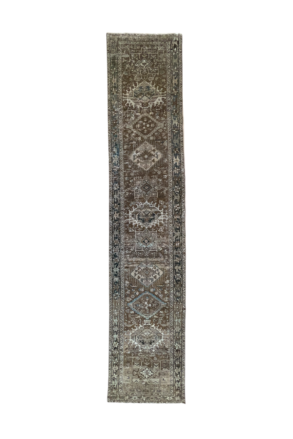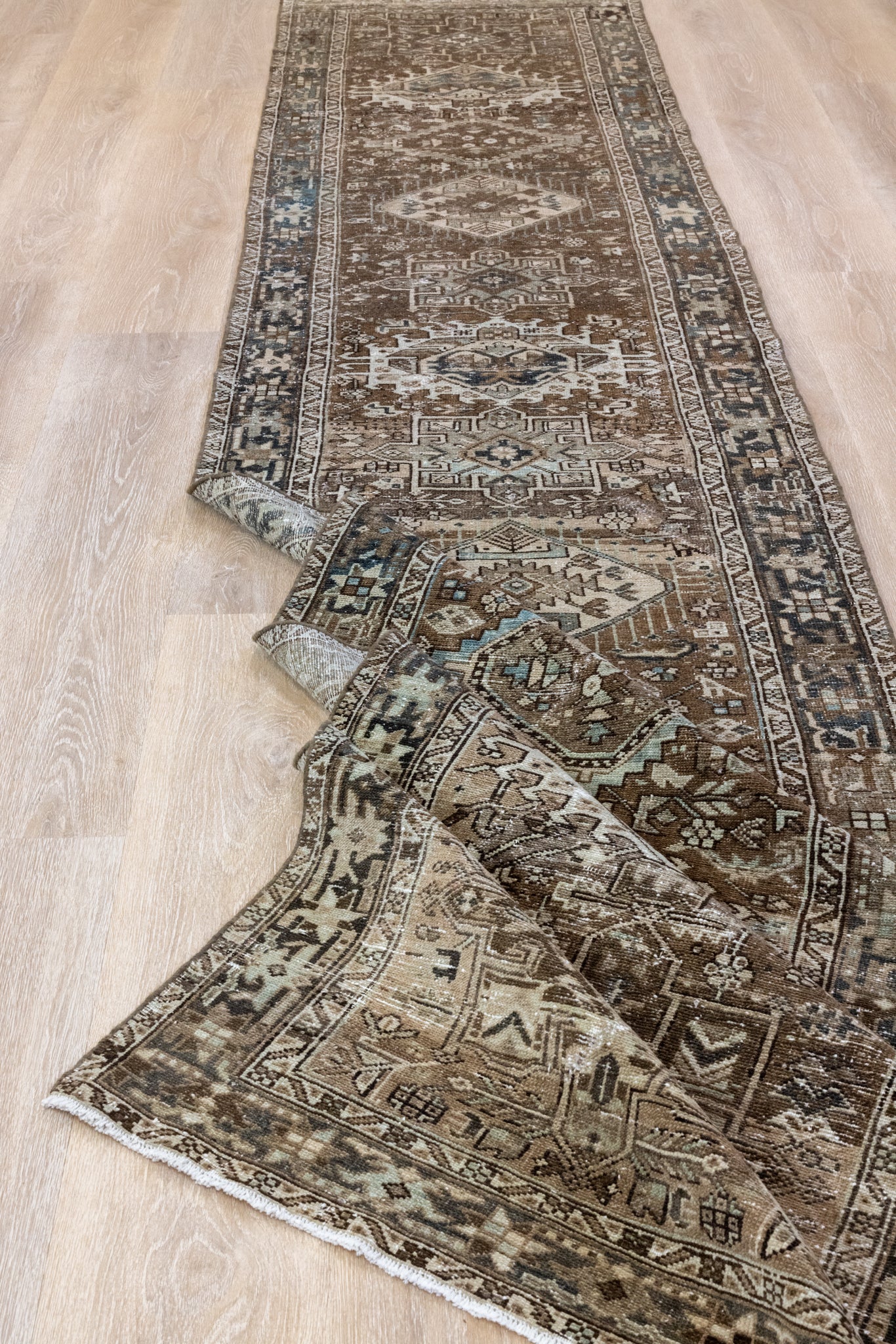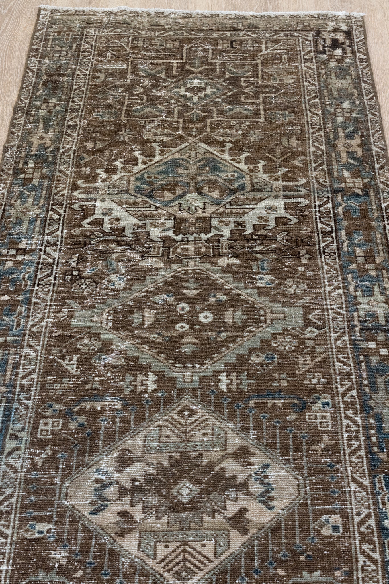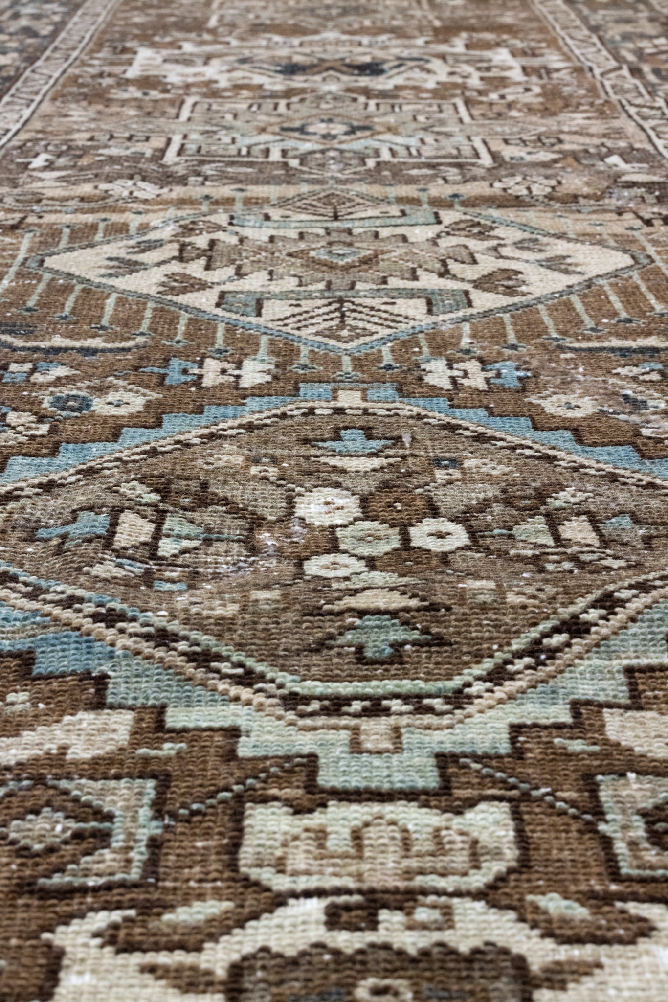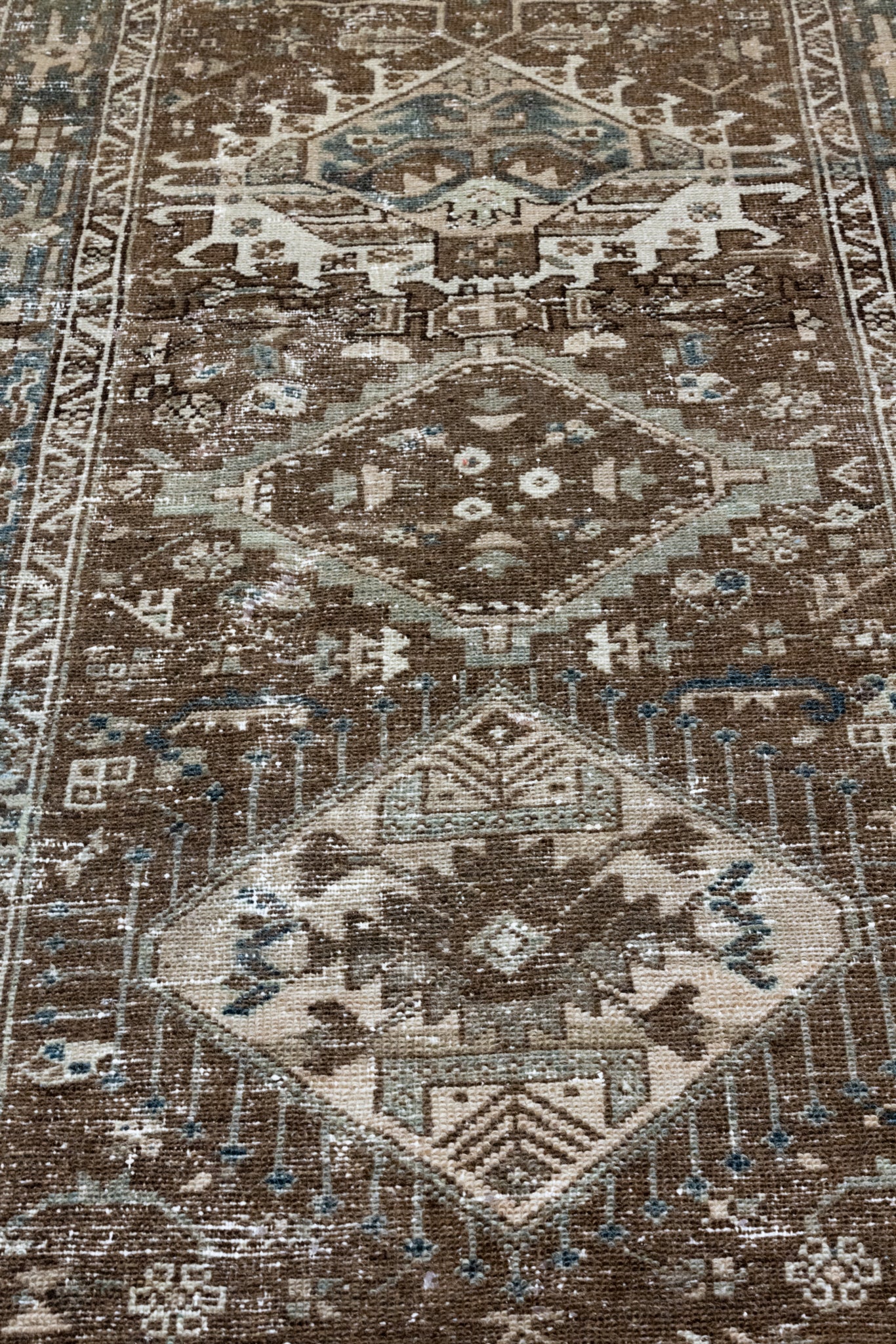 Please note that because this is a vintage rug, there may be slight imperfections in its wear, dimensions, and color. Our rugs have been repaired over the years, using various techniques. There might be evidence of these repairs through texture, look and feel. This is all part of the rich history and story of each artistic piece. These markings are not considered defective.