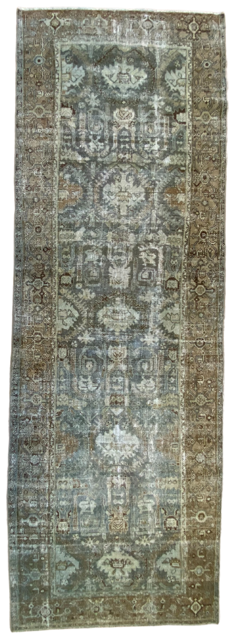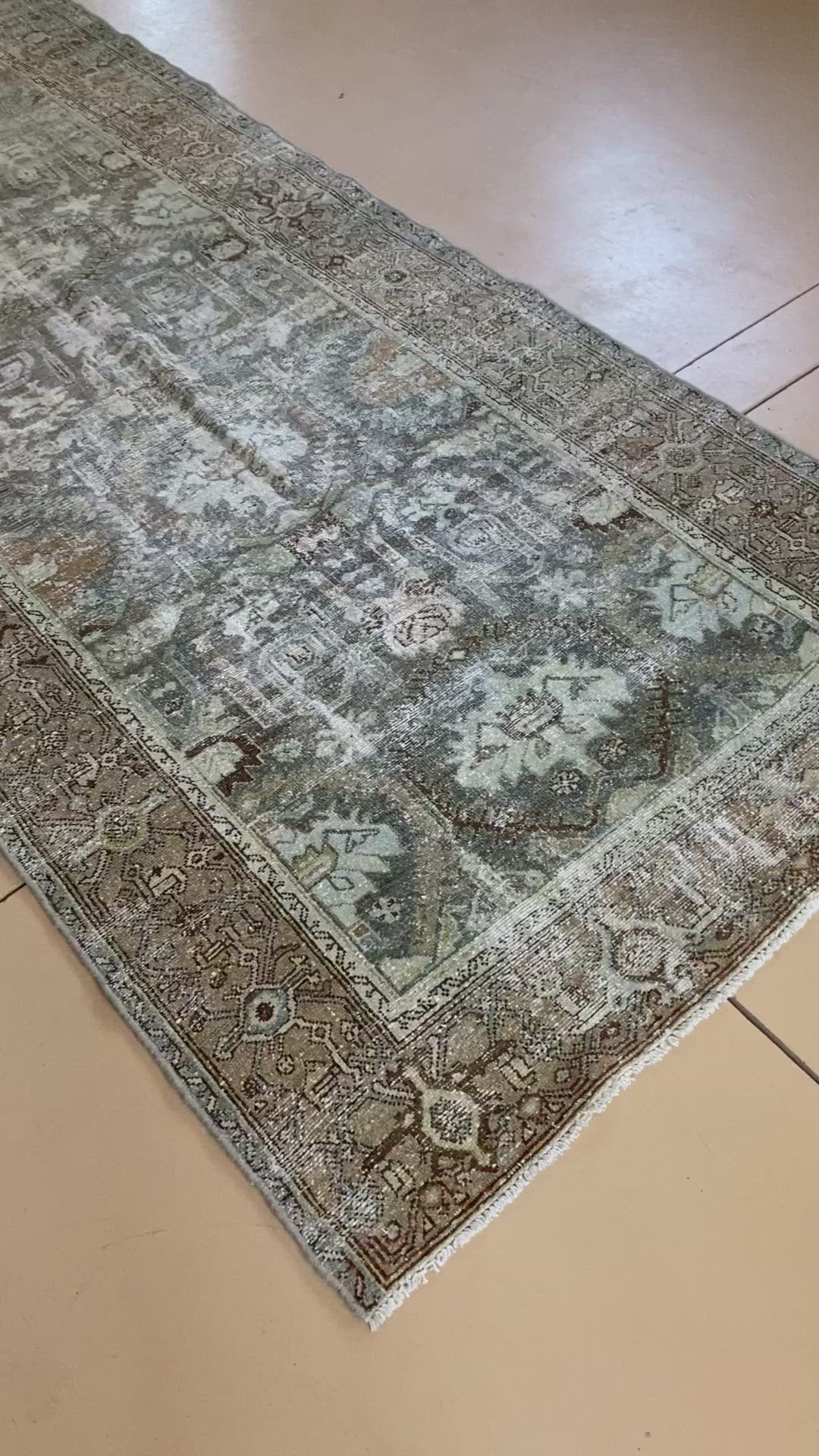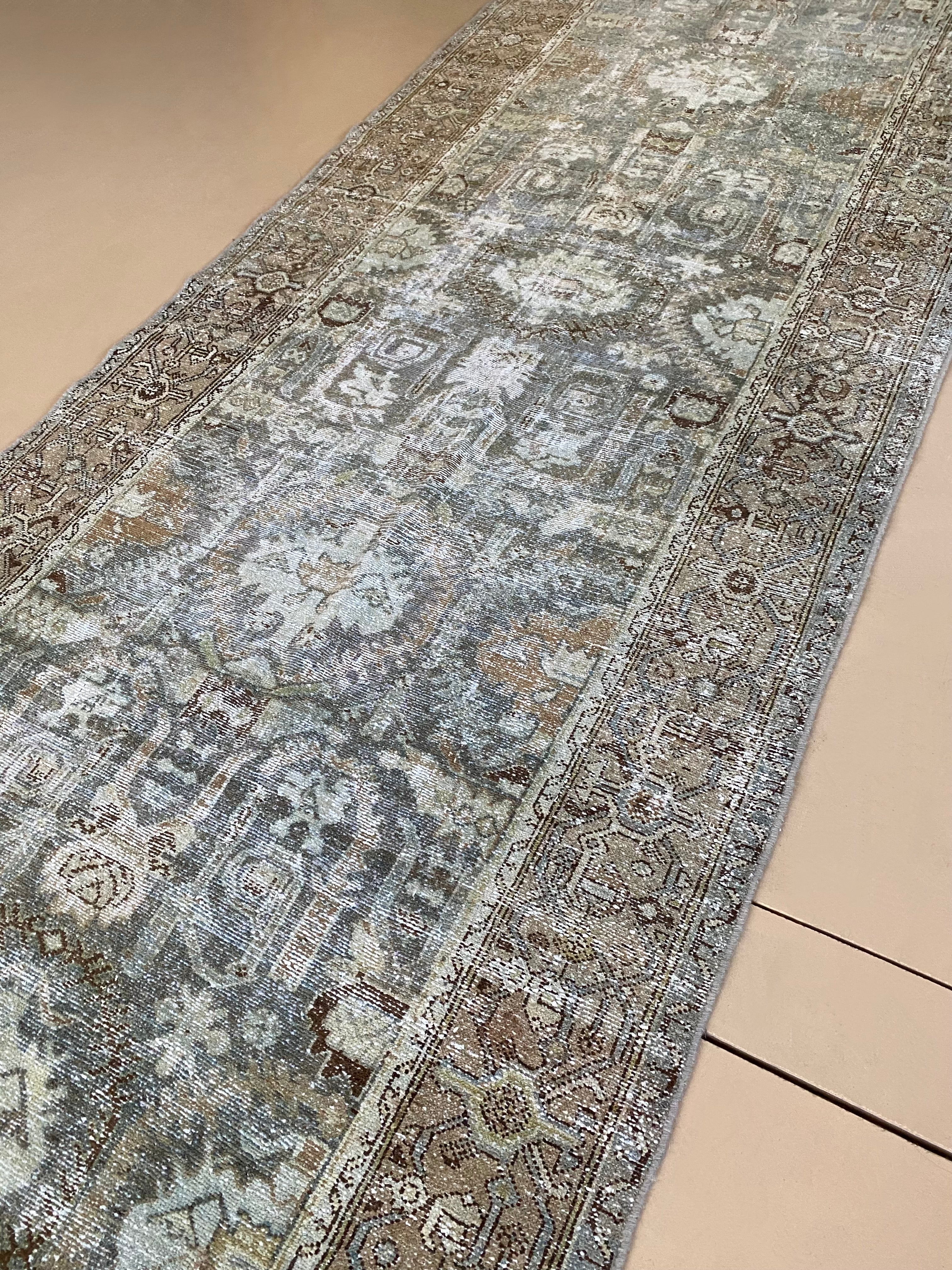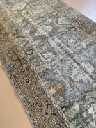 Colors: deep seafoam blue field with a taupe border. Details of chocolate brown, olive green, camel, sage green, and light aqua throughout the runner
