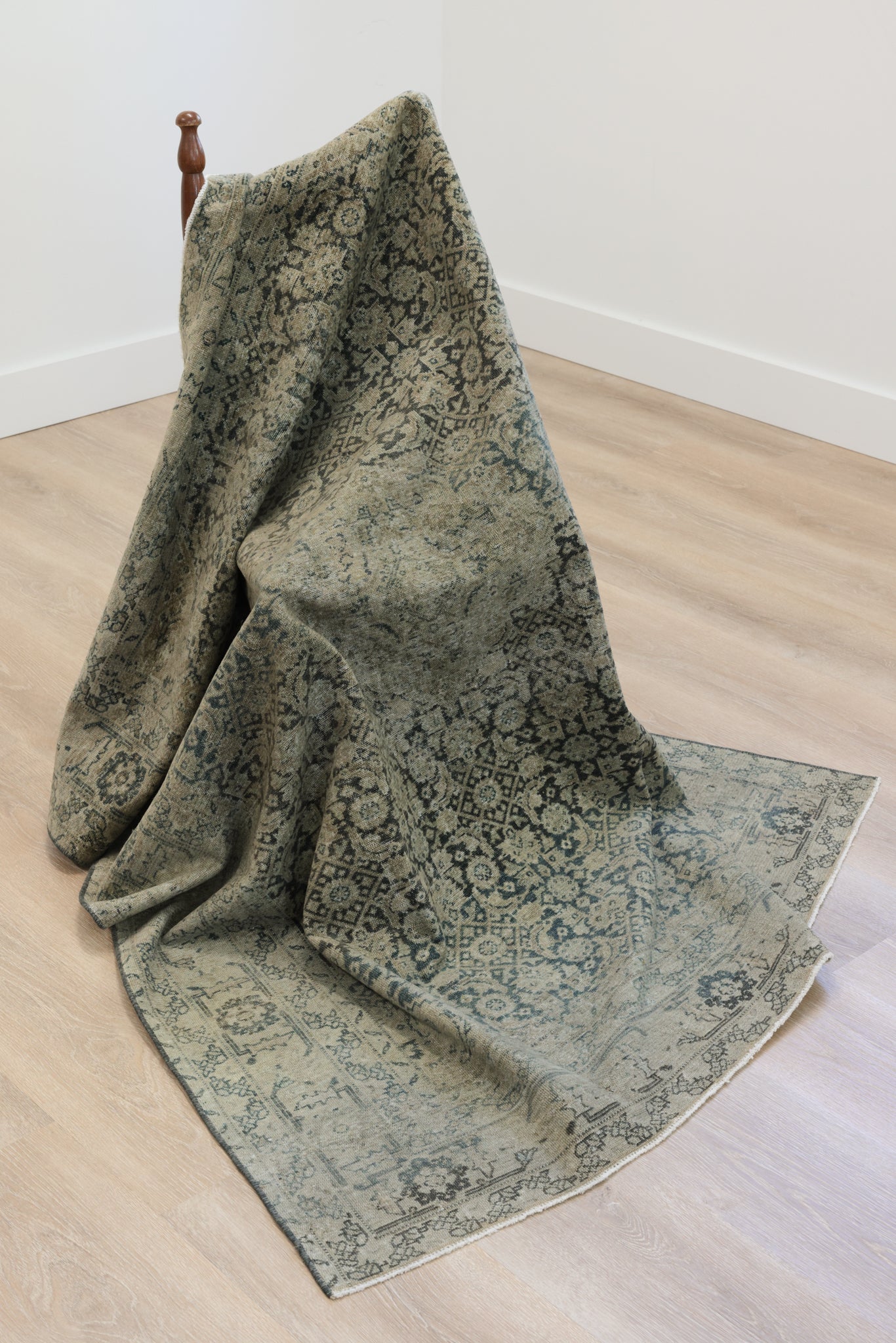 This rug has been professionally cleaned. Spot clean using the blotting technique, using a damp cloth. Take to a professional cleaner if the rug requires a deeper clean.