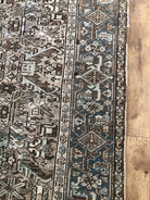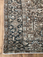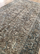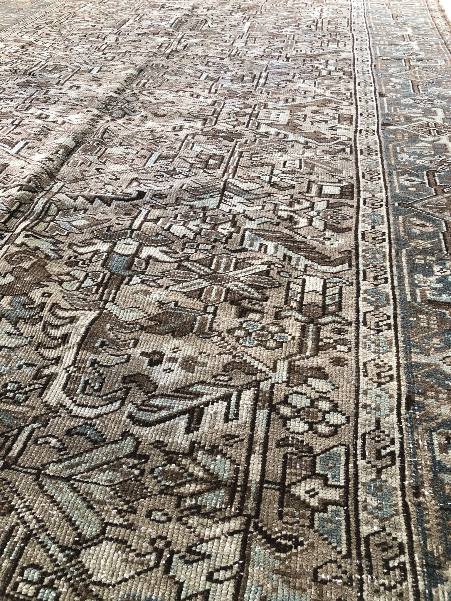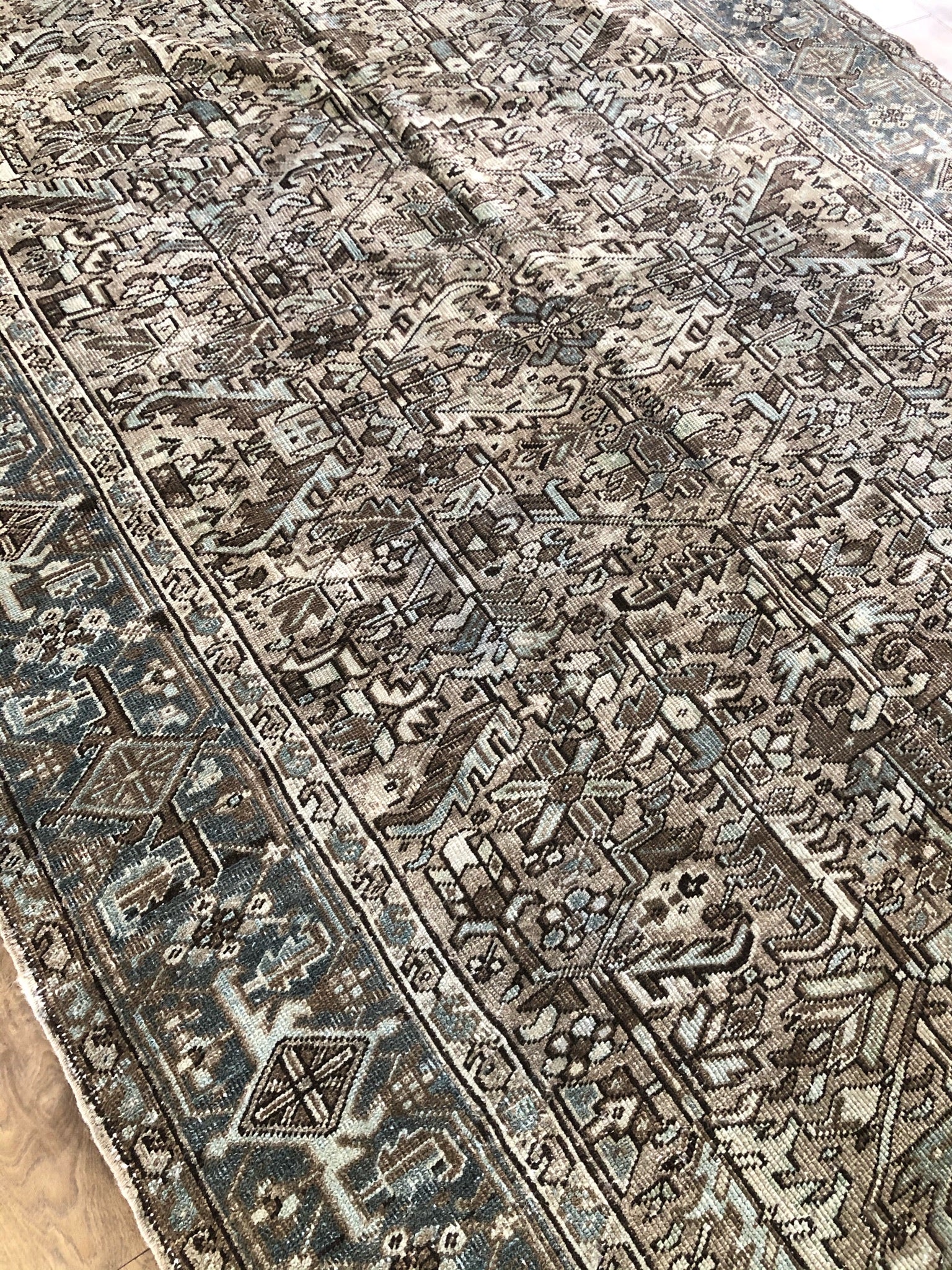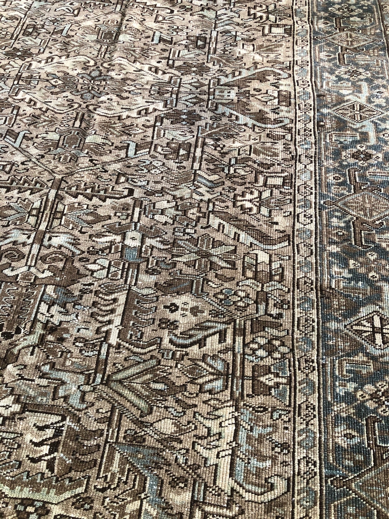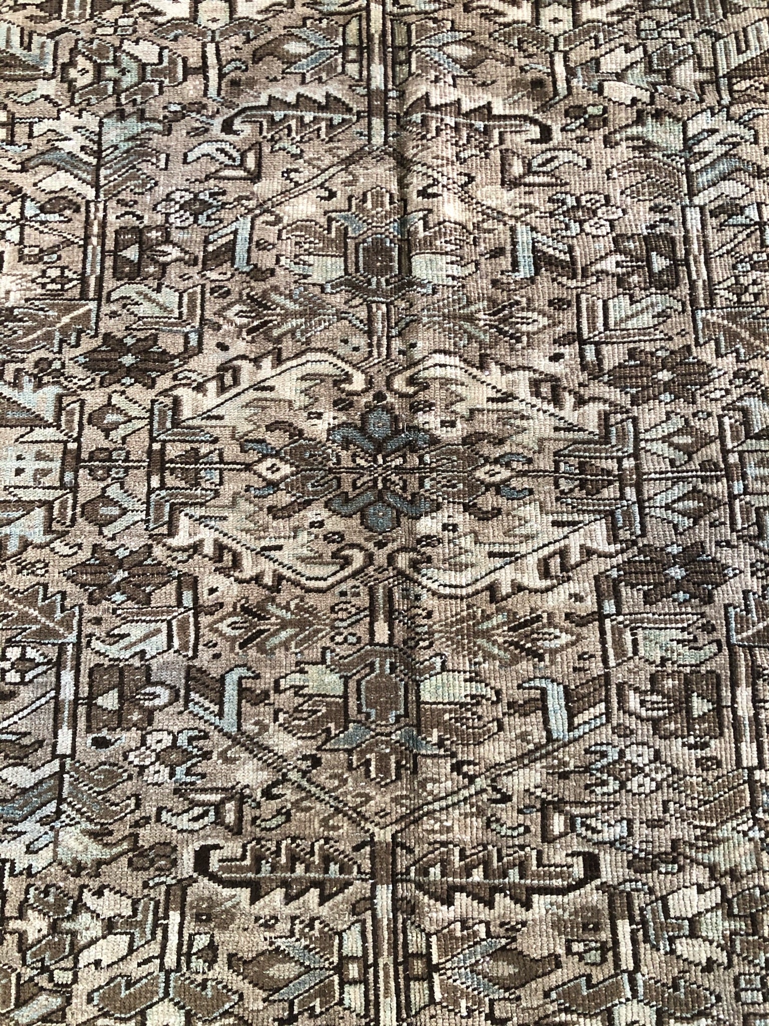 Colors: Deep oat base color with various faded navy, seafoam and teal blue coloring. Additional coffee, mocha and linen detailing with chocolate brown outlining throughout the rug.