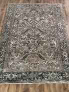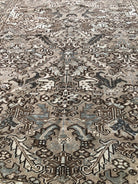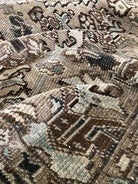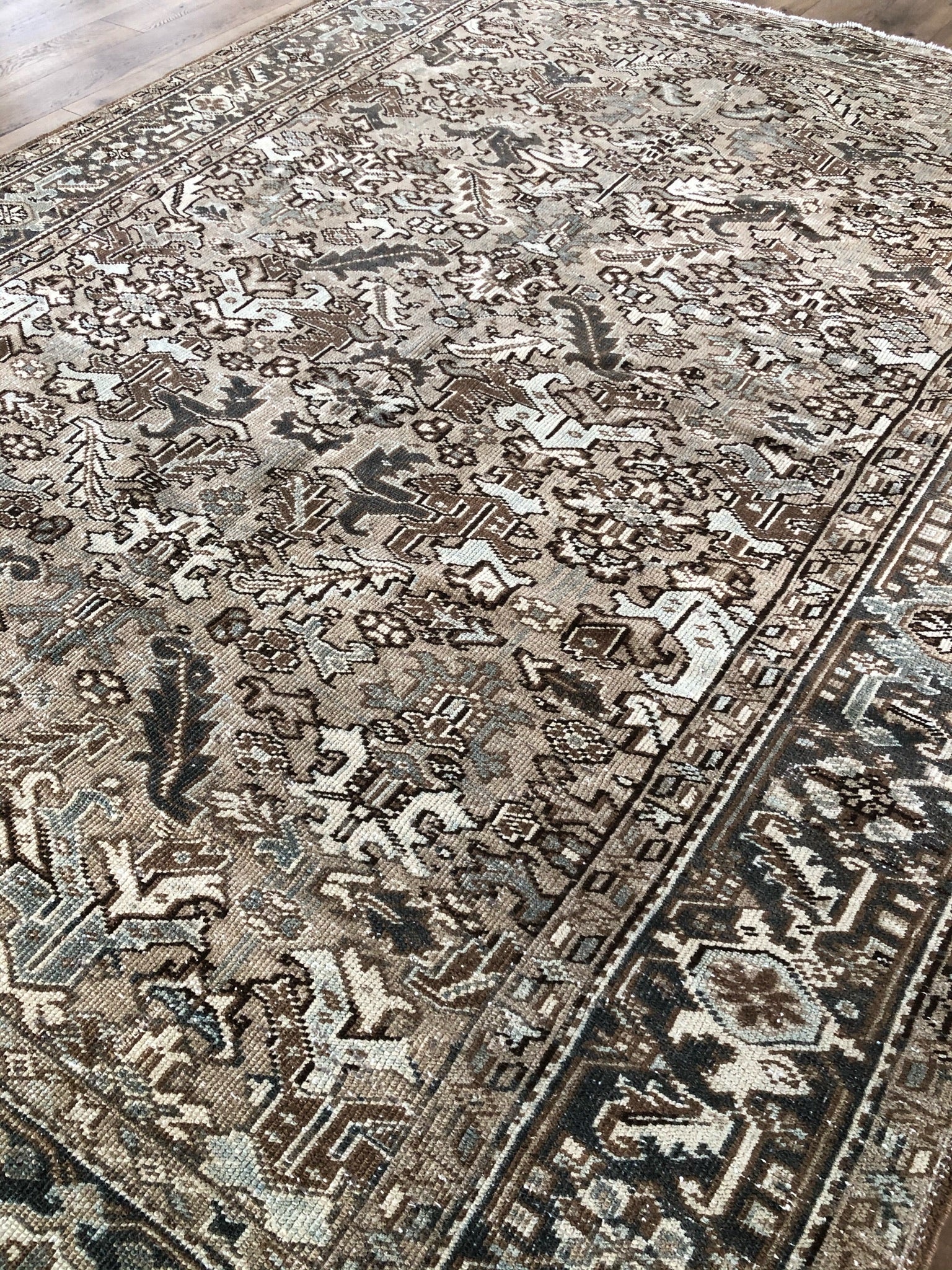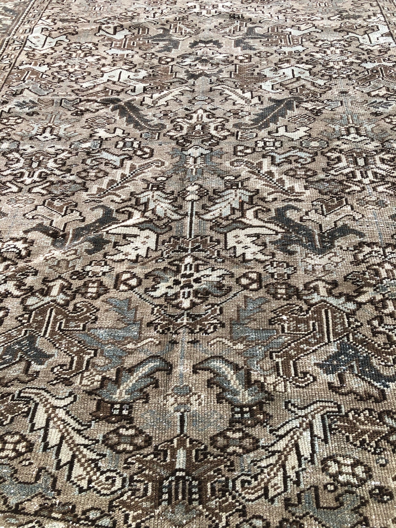Colors: Linen and sand base colors with various faded dark denim and light aegean blue colors. Additional chocolate brown detailing and outlining throughout the rug.
