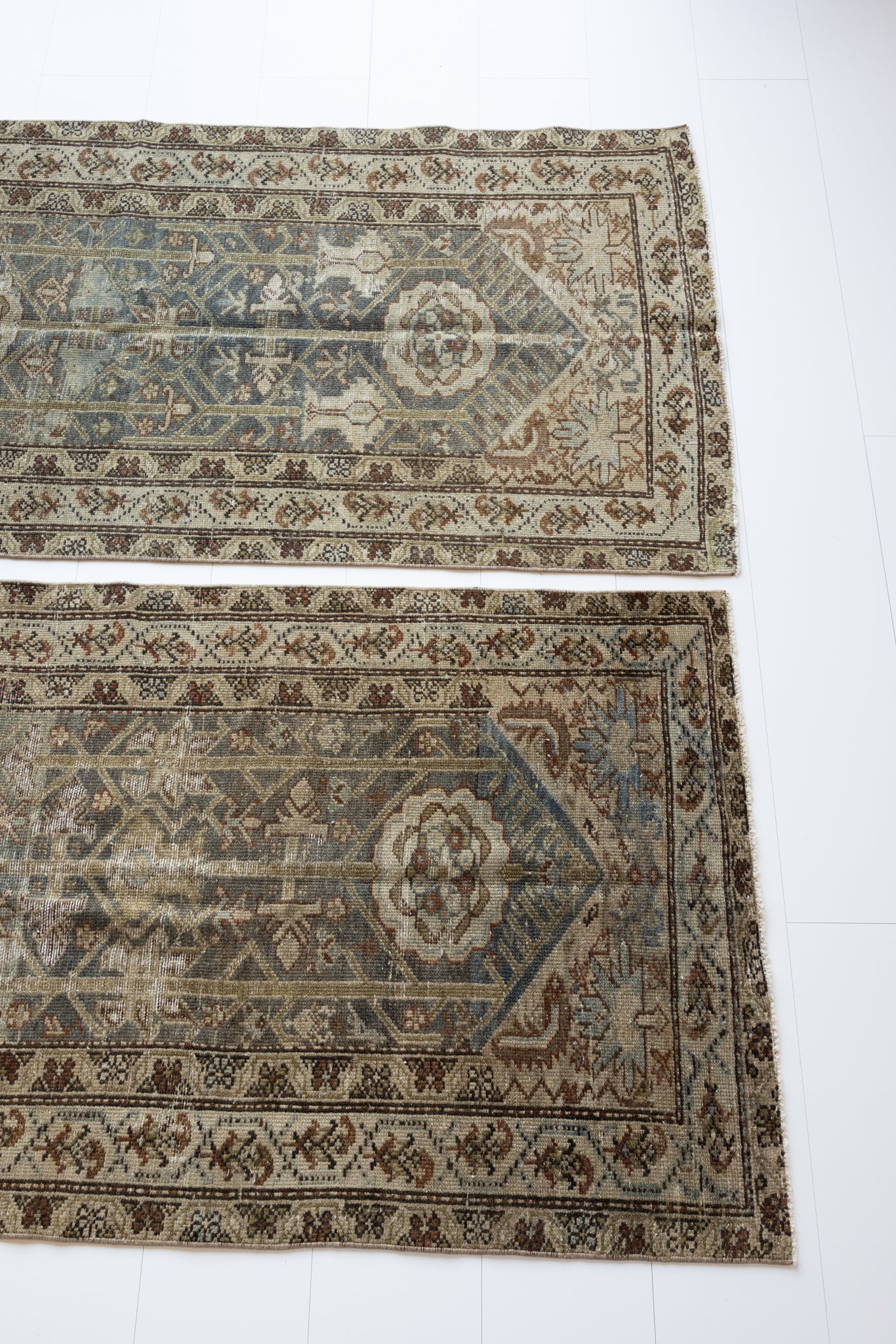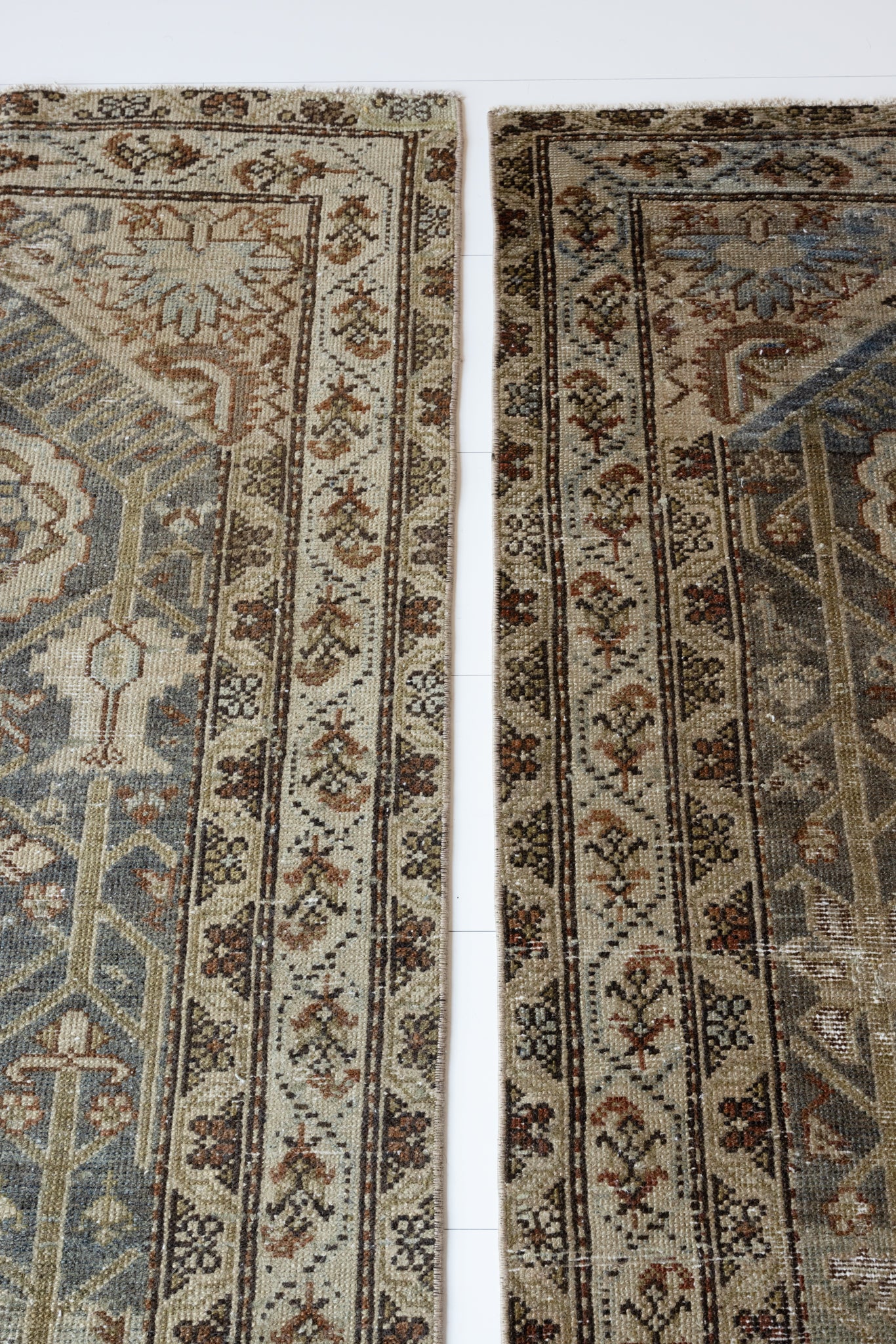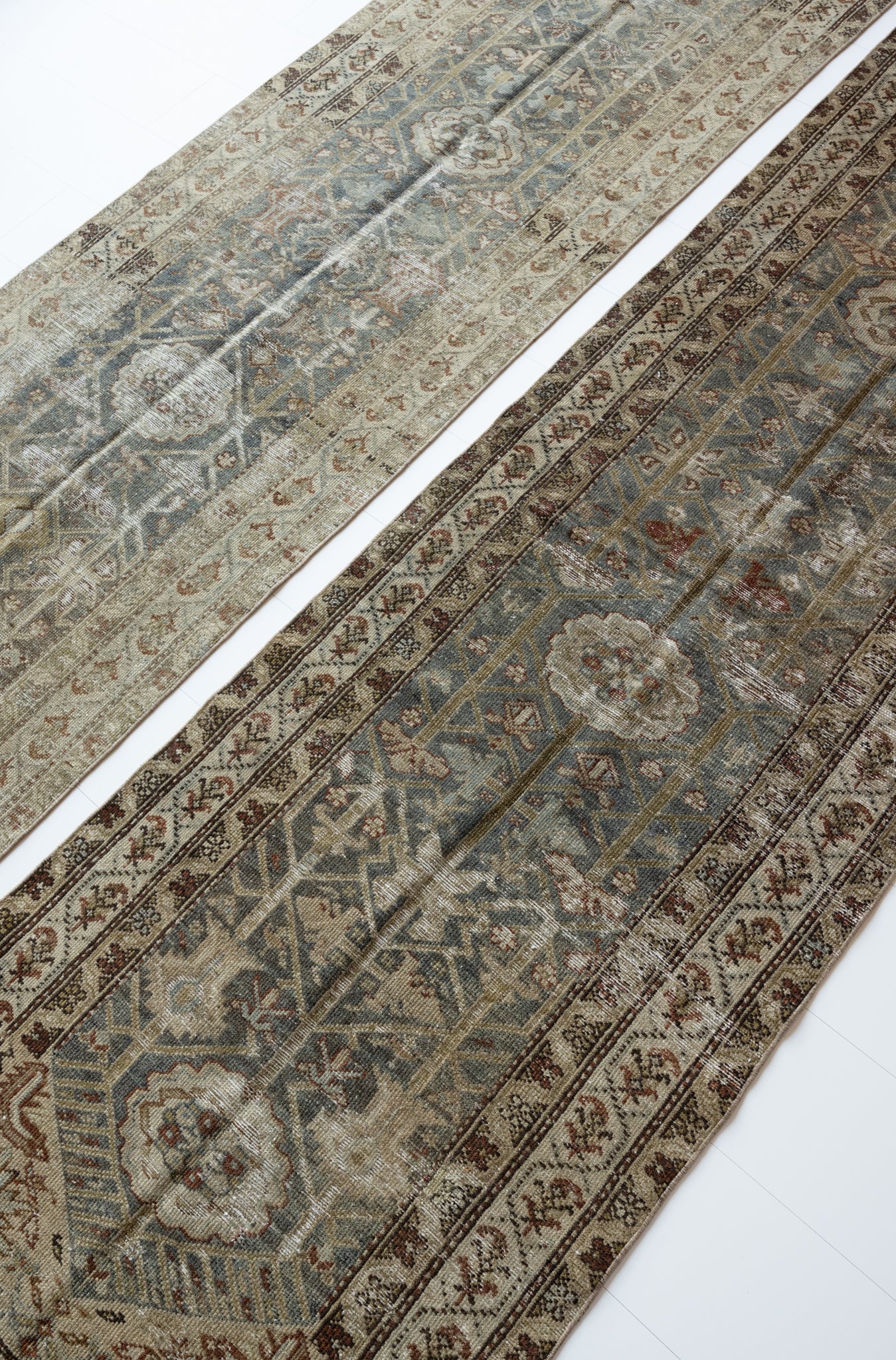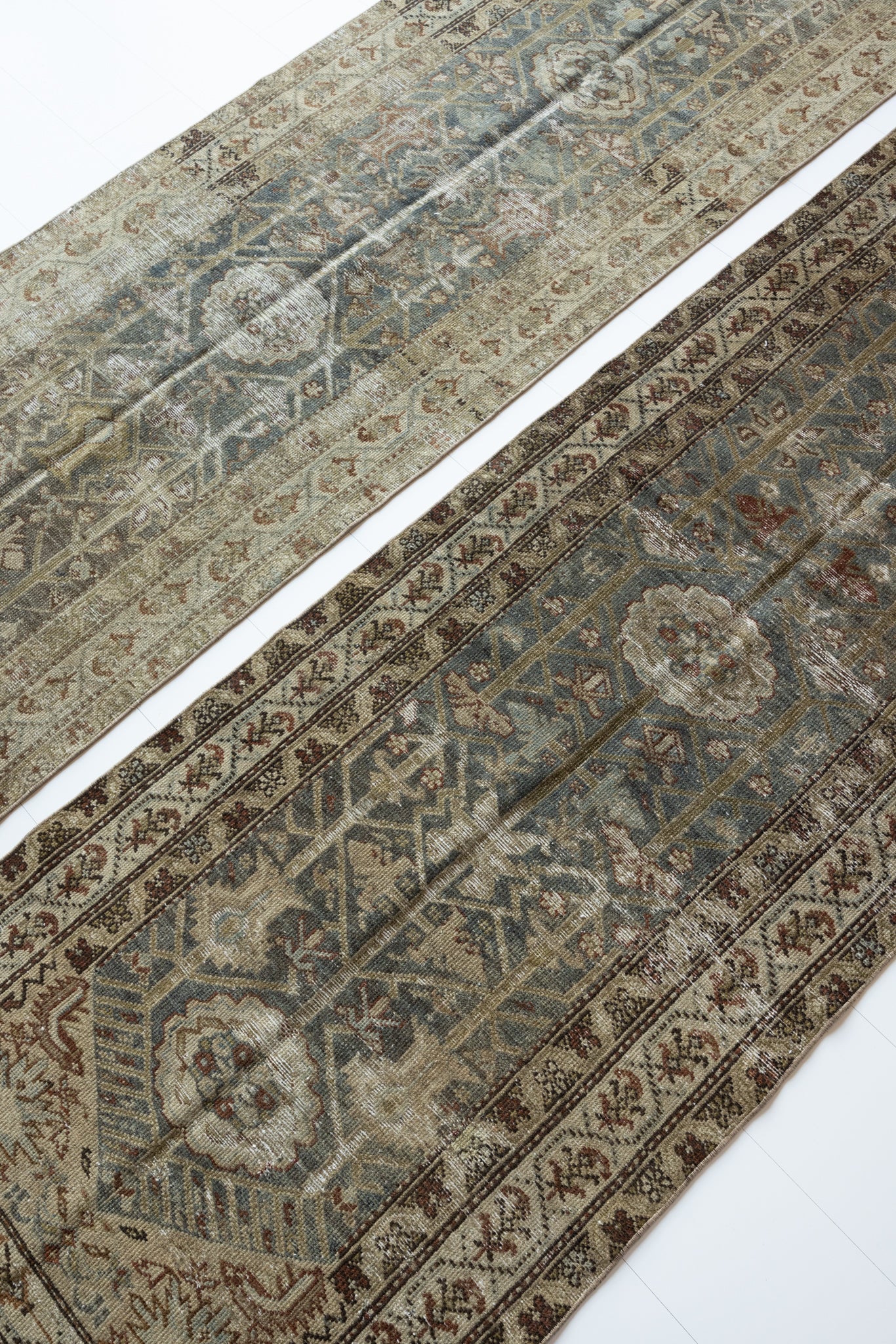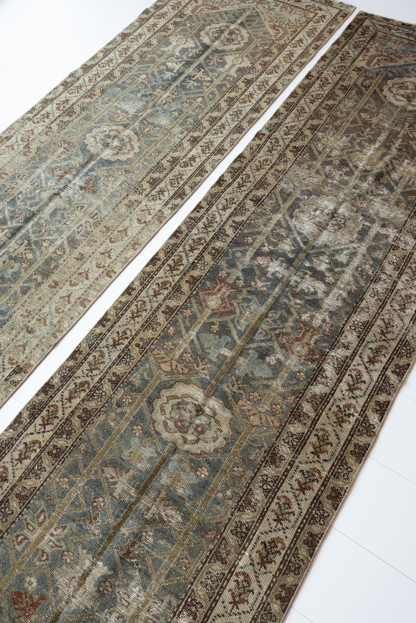 Both rugs have the same color palette, however, Shazia 1 is slightly more faded overall than Shazia 2. The natural light in our studio may make the color saturation difference between the two runners appear more pronounced than it truly is. Please keep in mind that this difference will look less distinct in your home, and the rugs will likely appear more similar in color and saturation