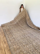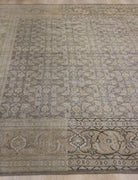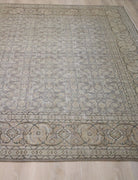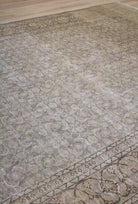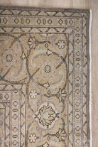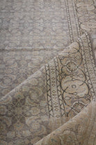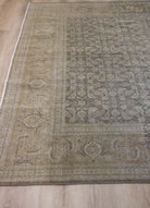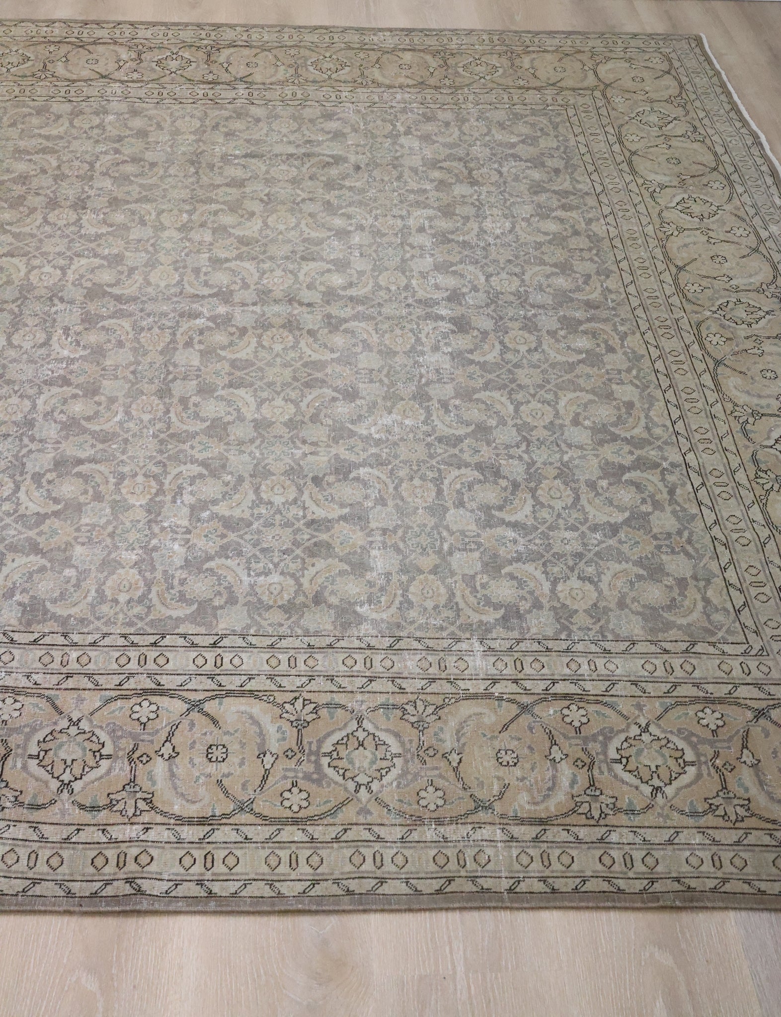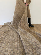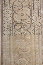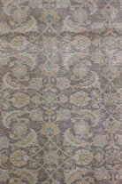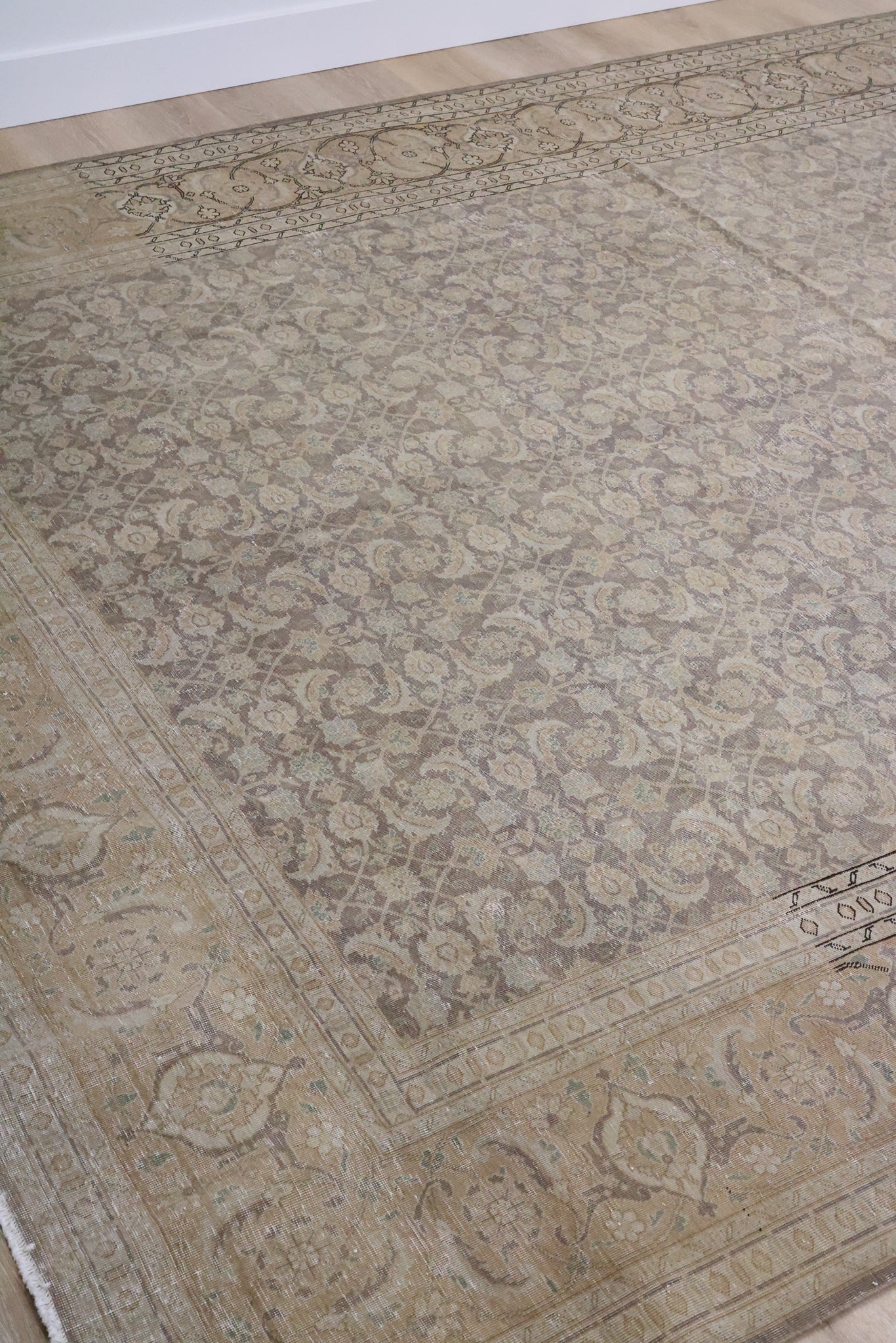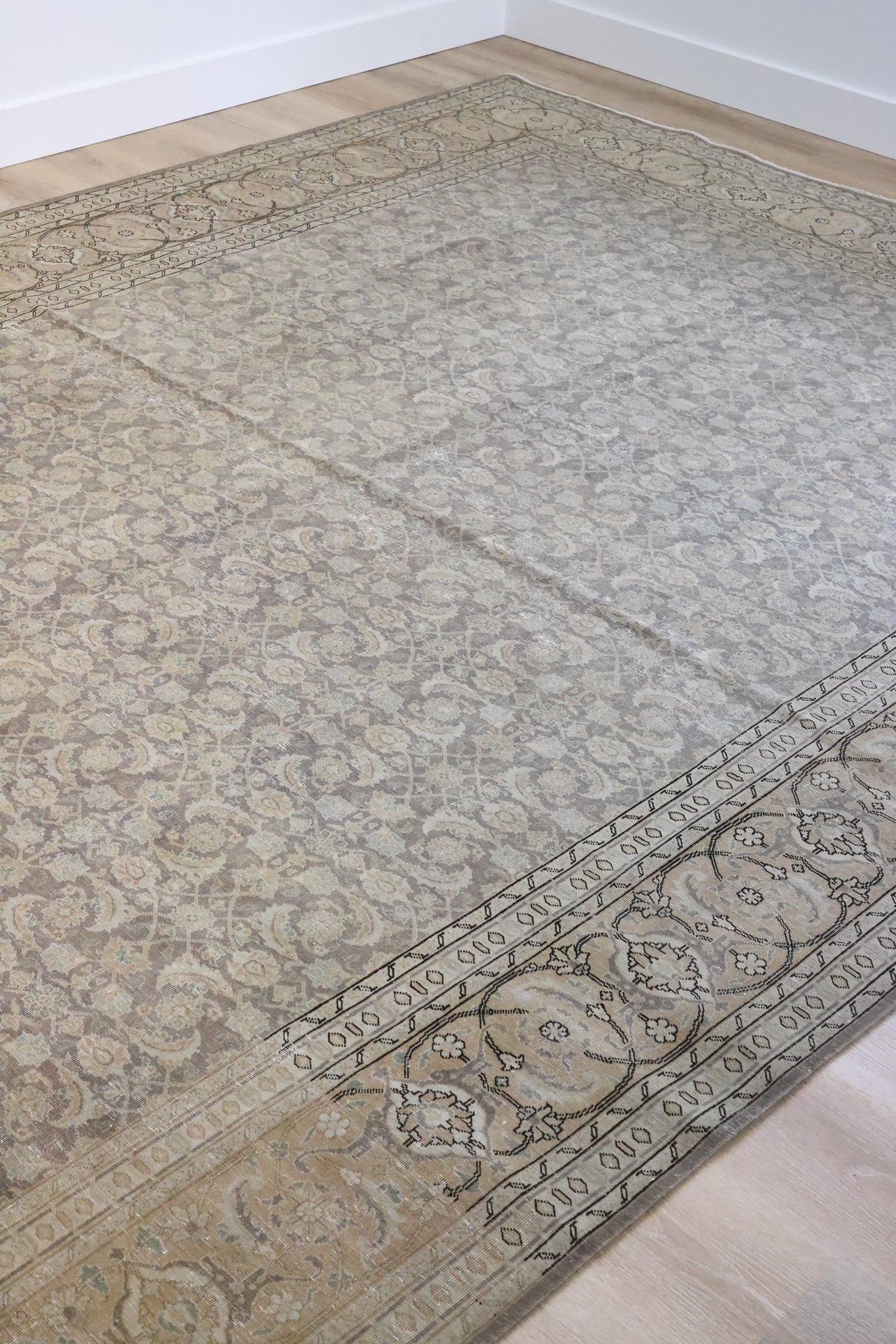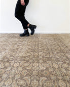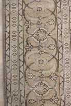 Colors: dark khaki, light khaki, seafoam green, lavender/gray, with espresso detailing. The border design fades on one end of the rug.