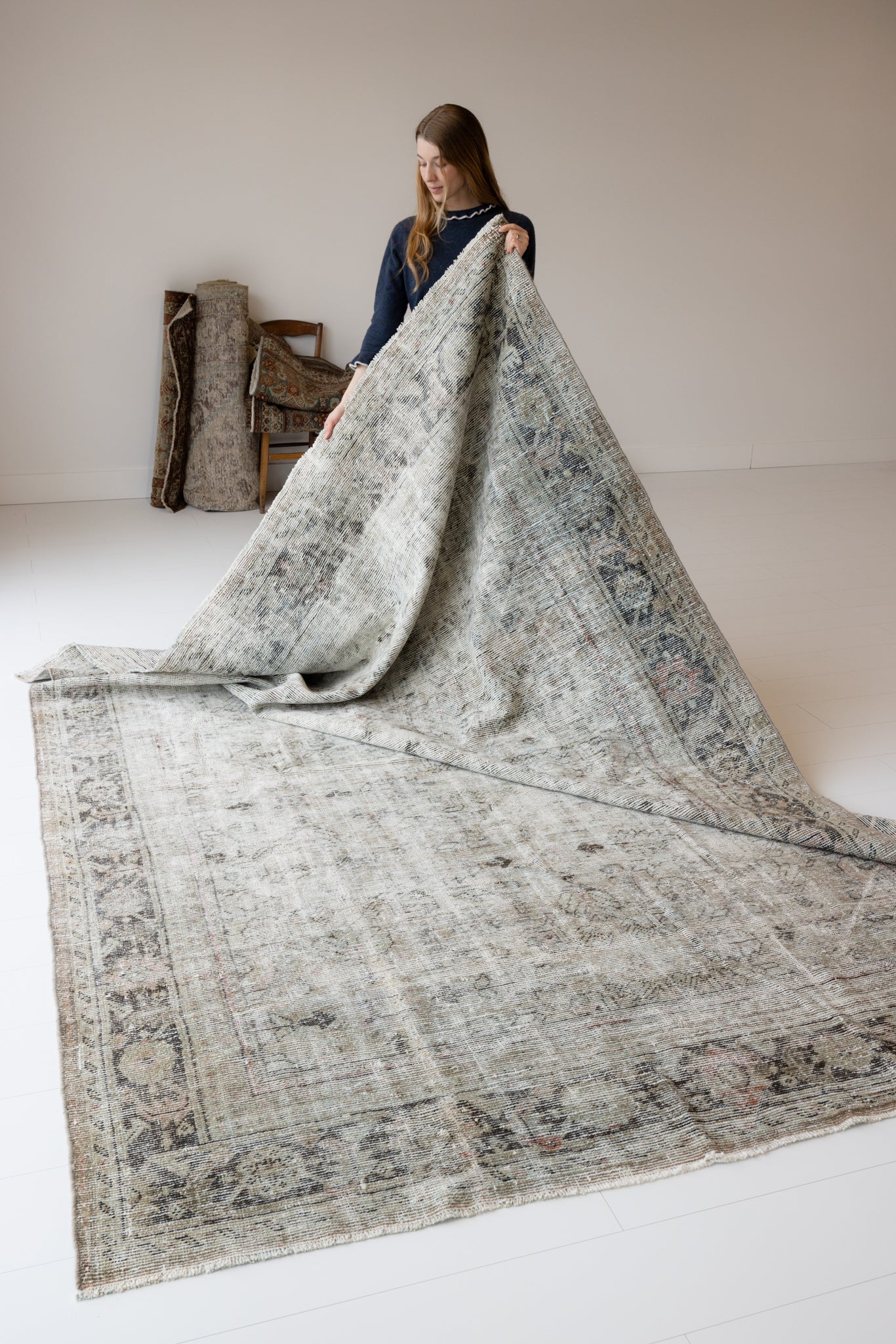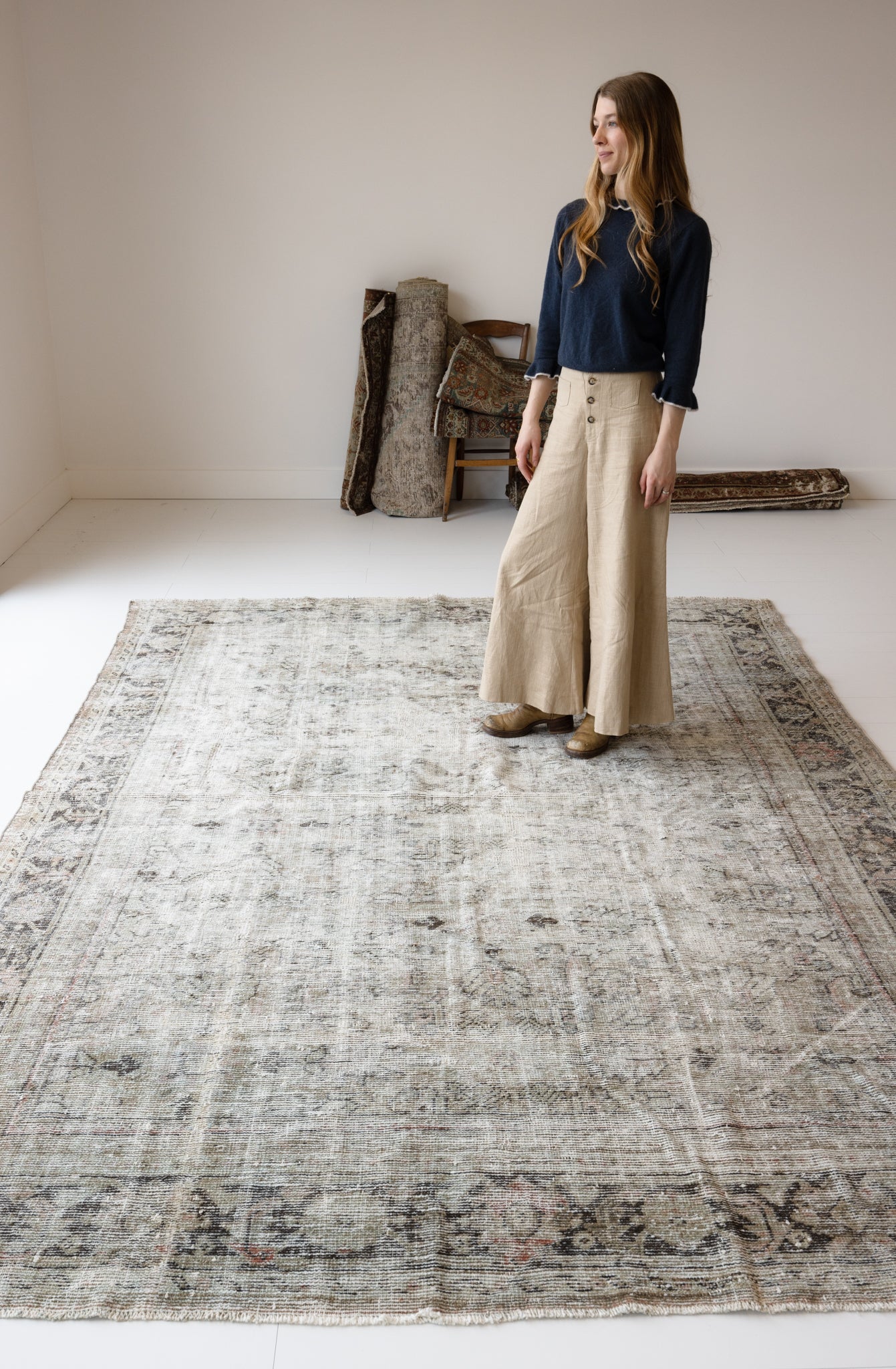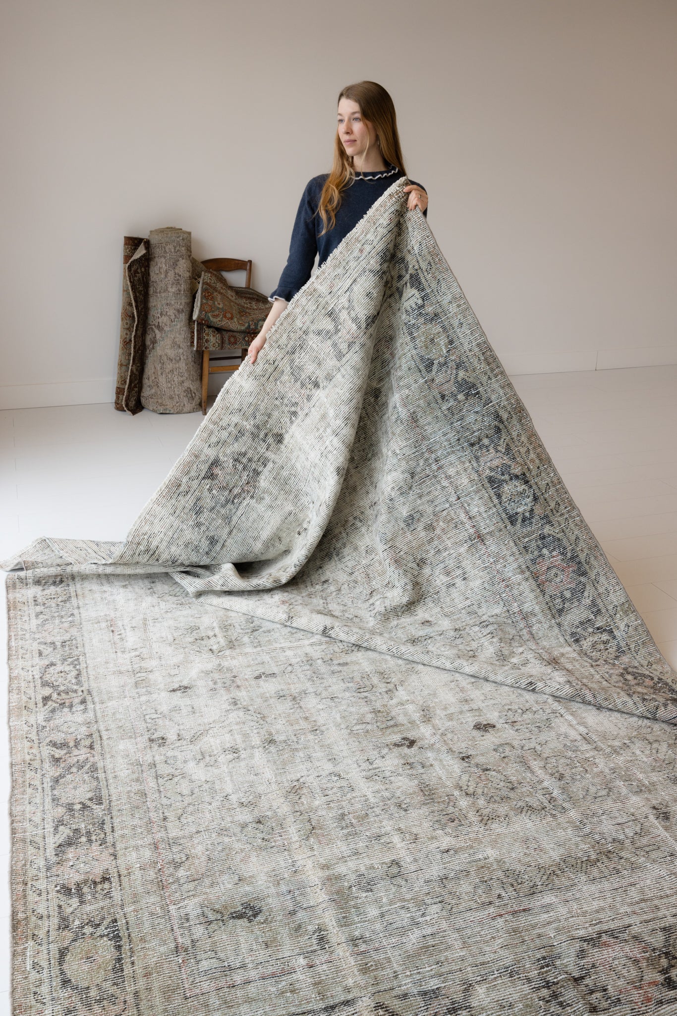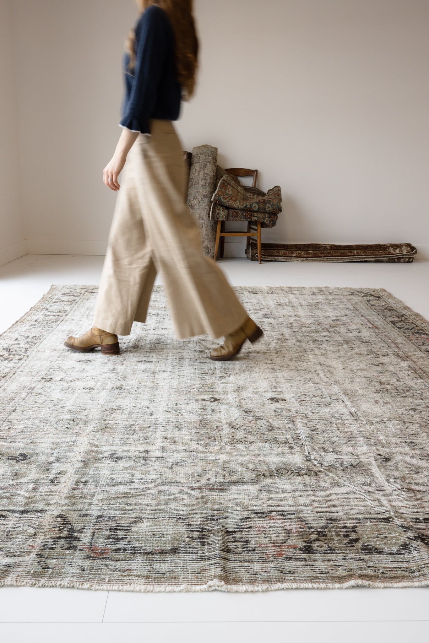 Because of the nature of this item, there may be slight imperfections in its wear, shape, dimensions, and color. Our rugs have been repaired over the years, using various techniques. There might be evidence of these repairs through texture, look and feel. This is all part of the rich history and story of each artistic piece. These markings are not considered defective.