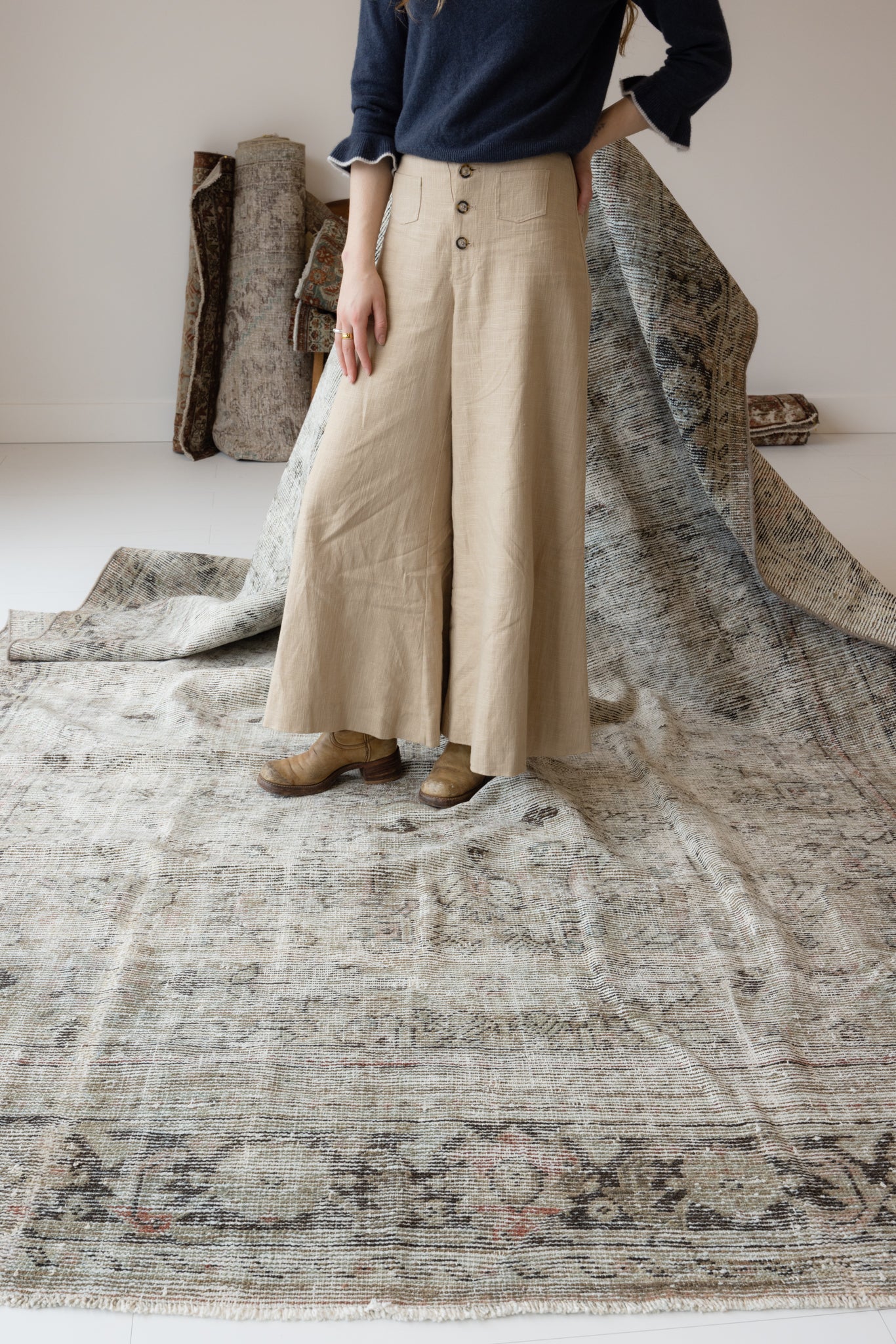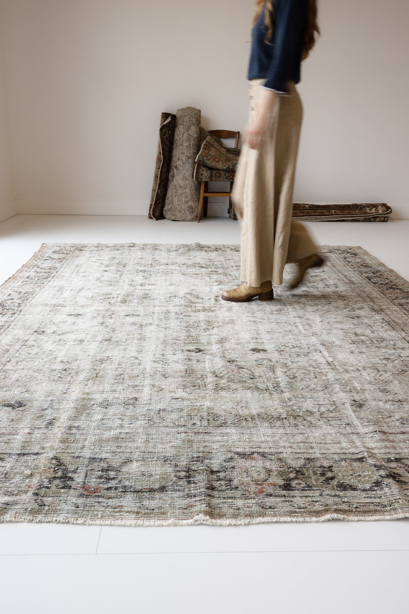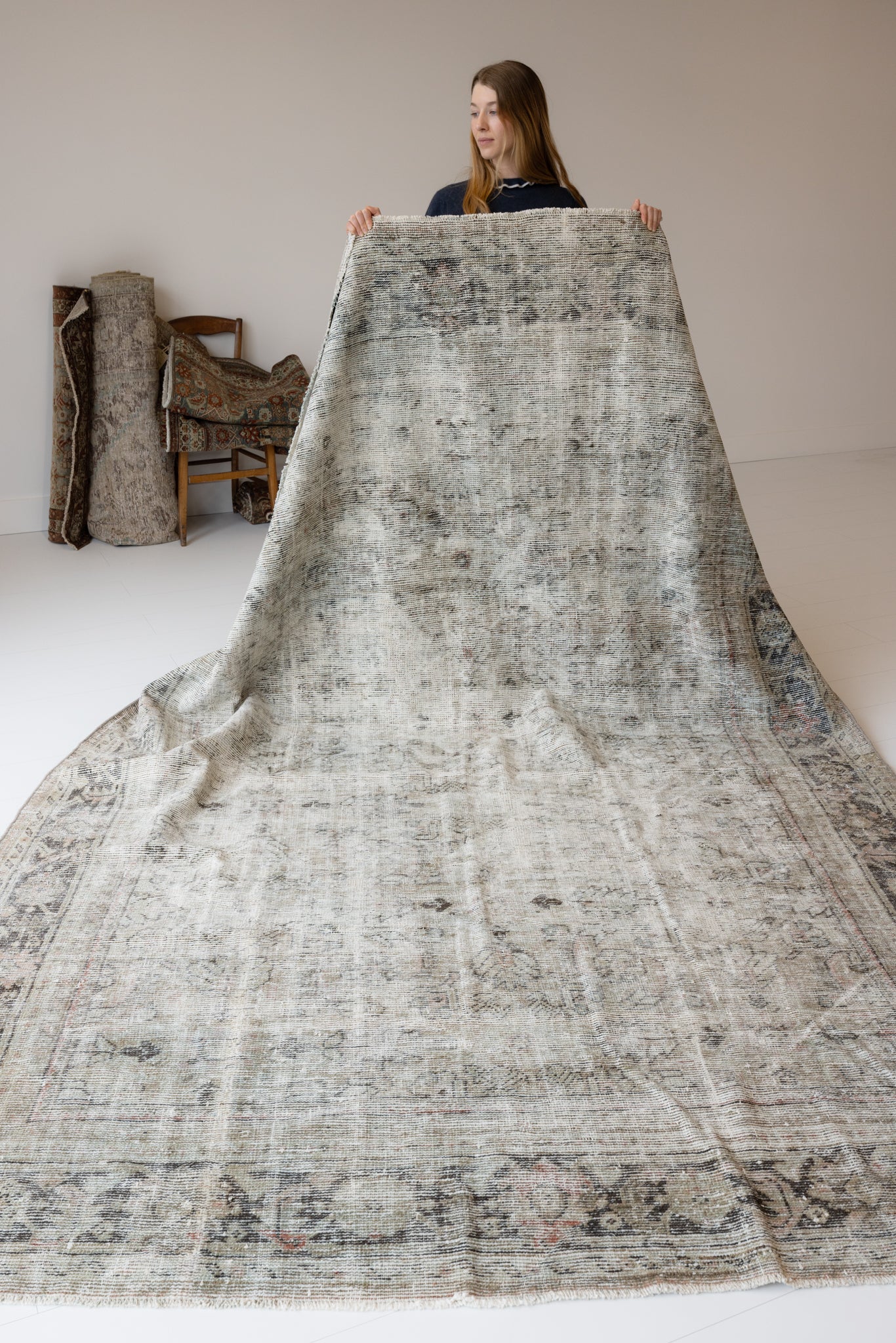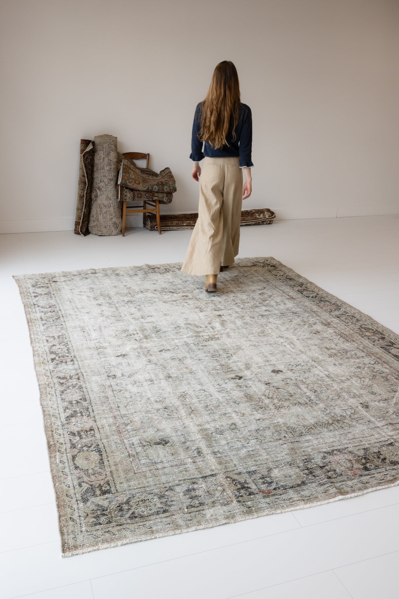 Because of the nature of this item, there may be slight imperfections in its wear, shape, dimensions, and color. Our rugs have been repaired over the years, using various techniques. There might be evidence of these repairs through texture, look and feel. This is all part of the rich history and story of each artistic piece. These markings are not considered defective.