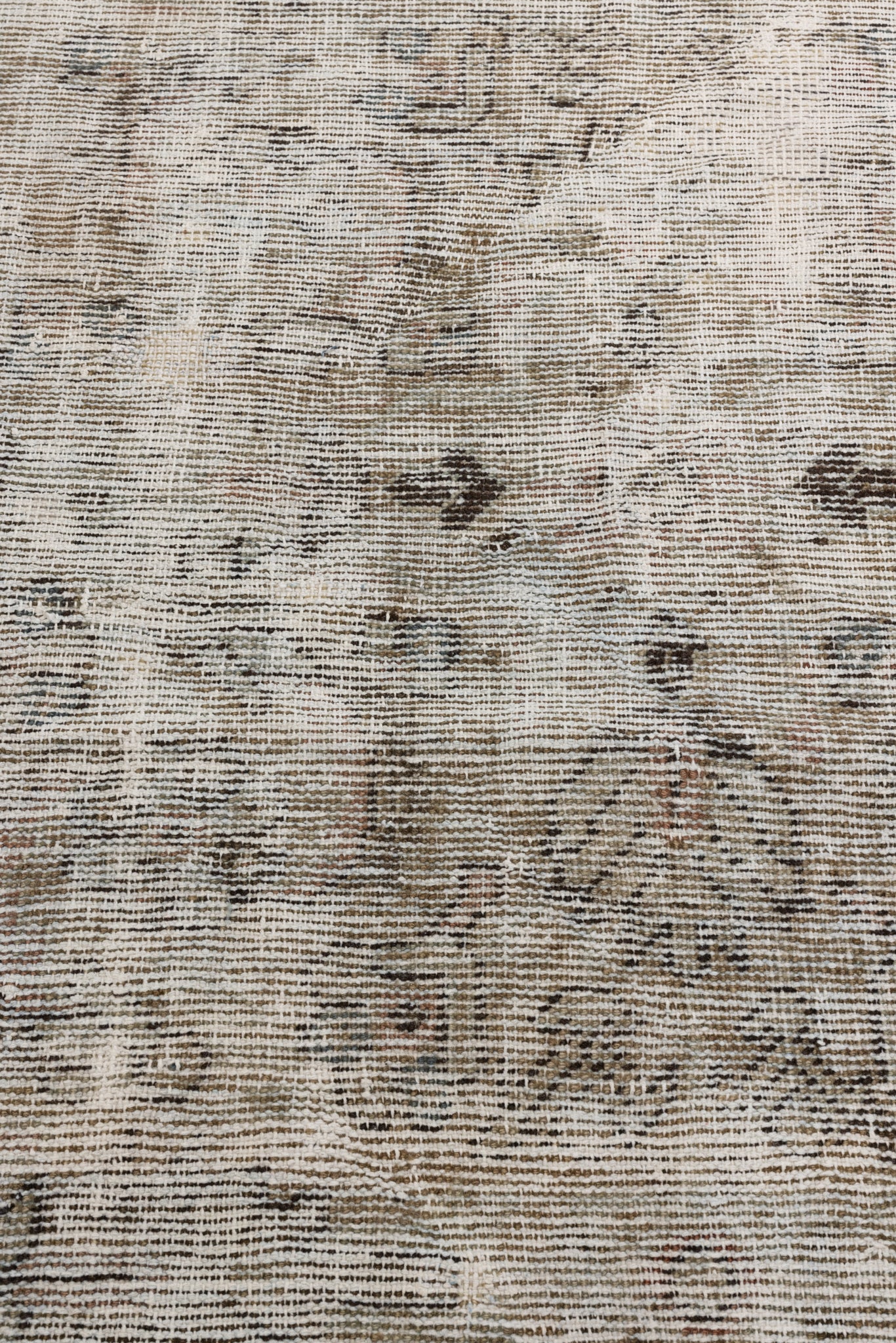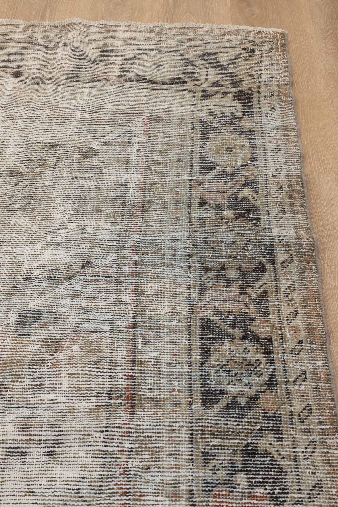 Colors: chocolate brown along the border as well as throughout the field, hints of rust detailing throughout the rug, brown taupe throughout the field, medium khaki, splashes of light denim blue throughout, taupe, gray taupe