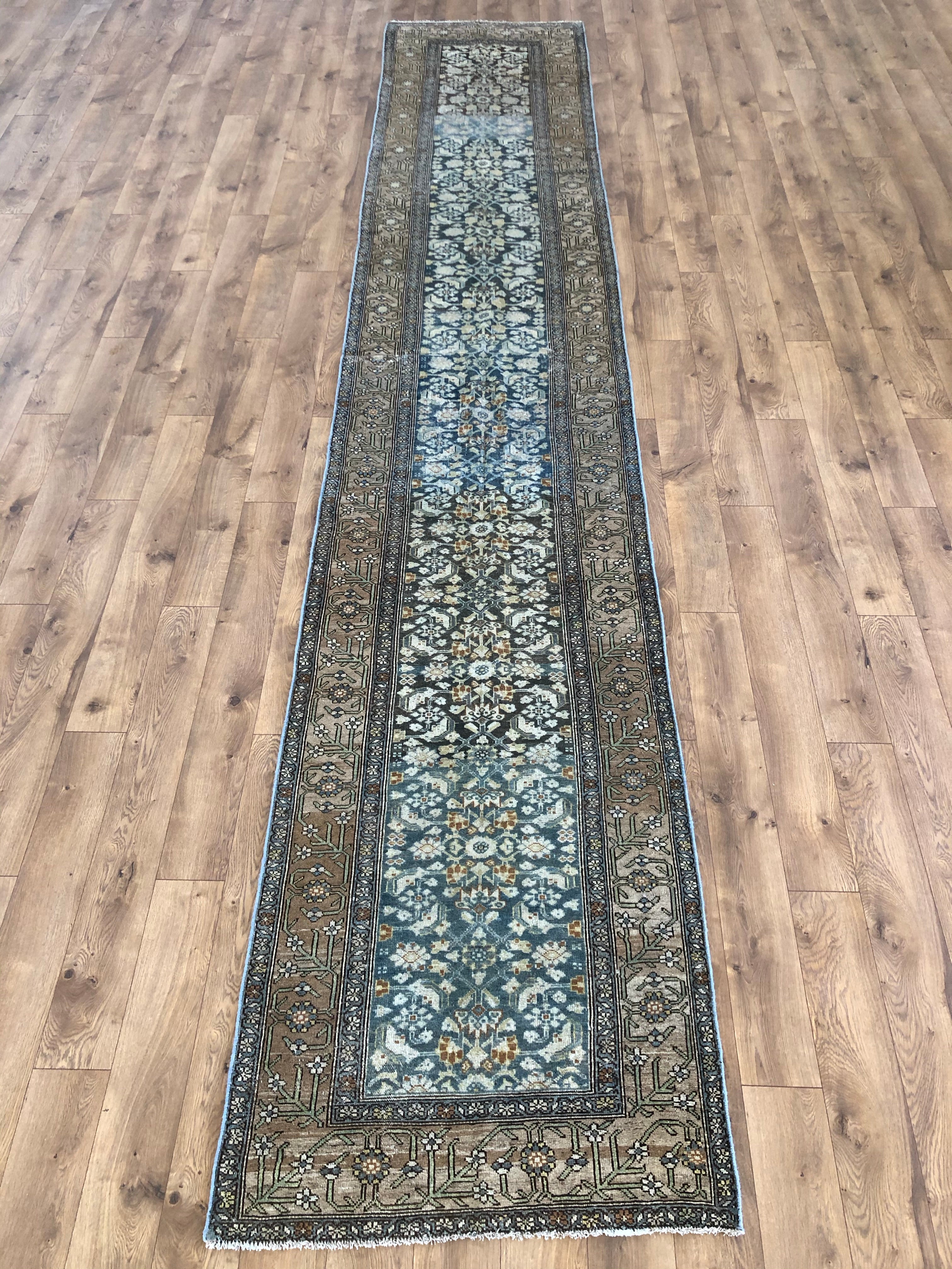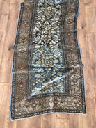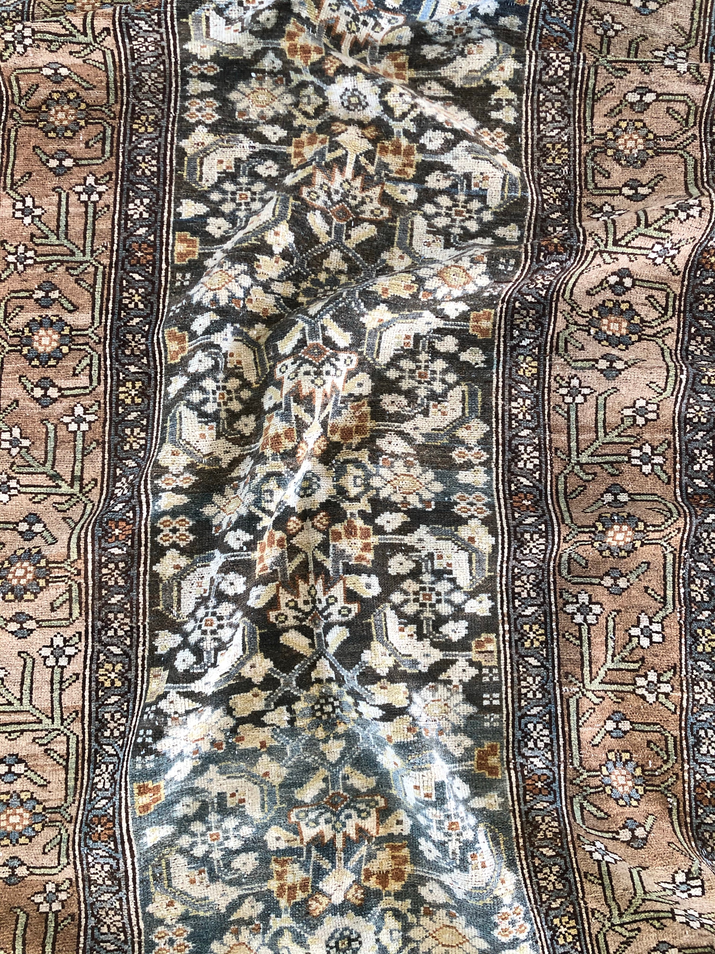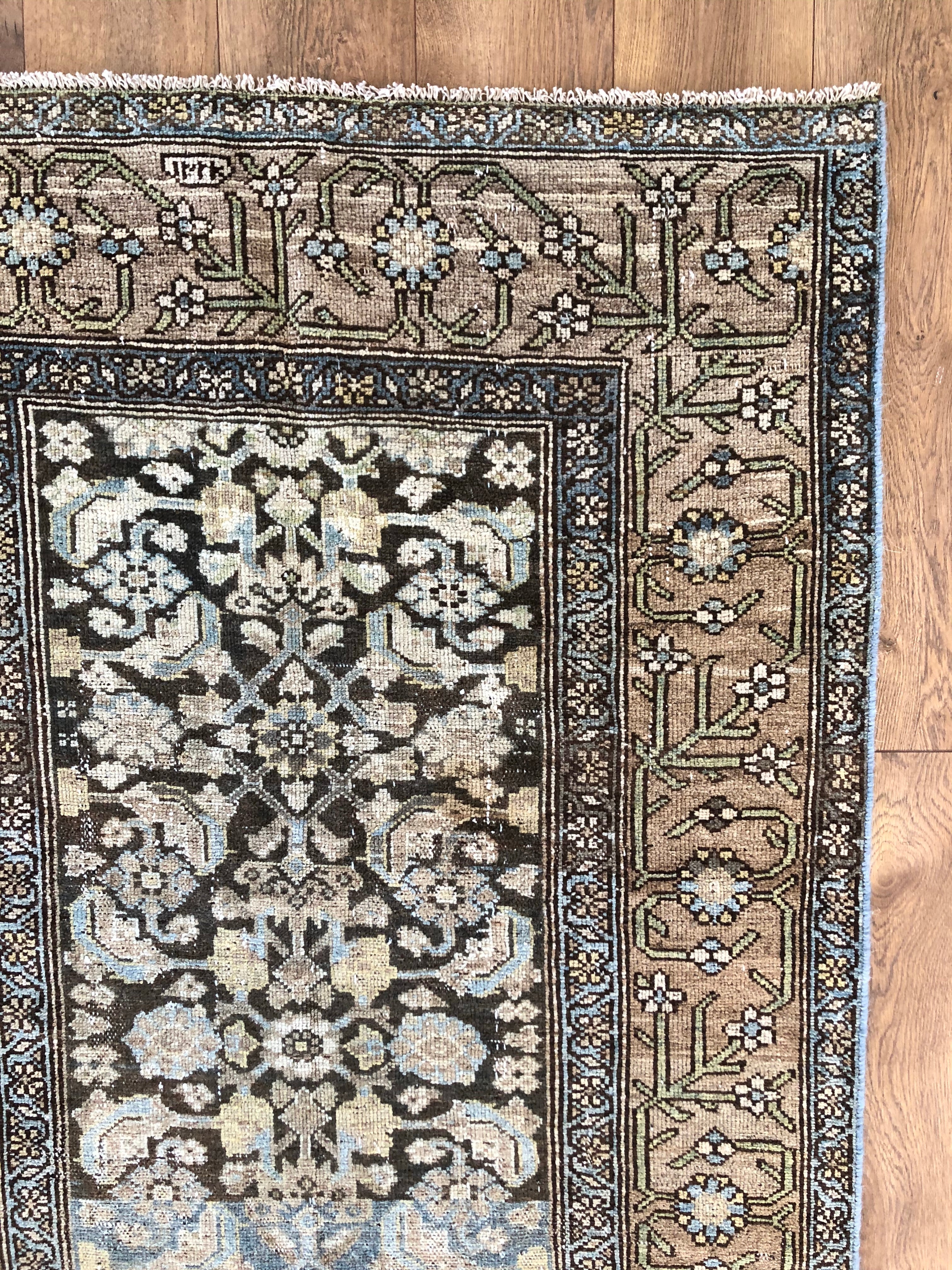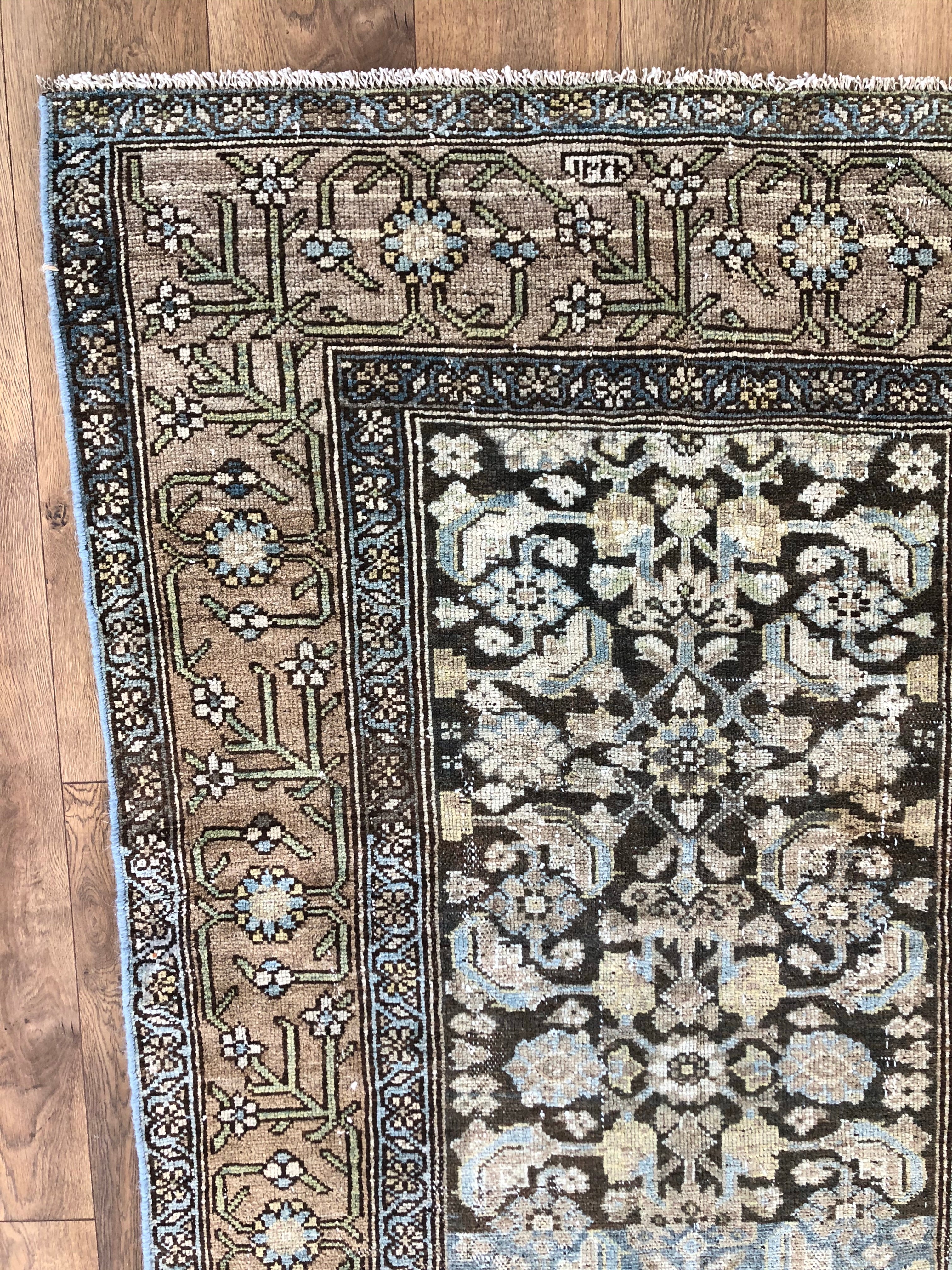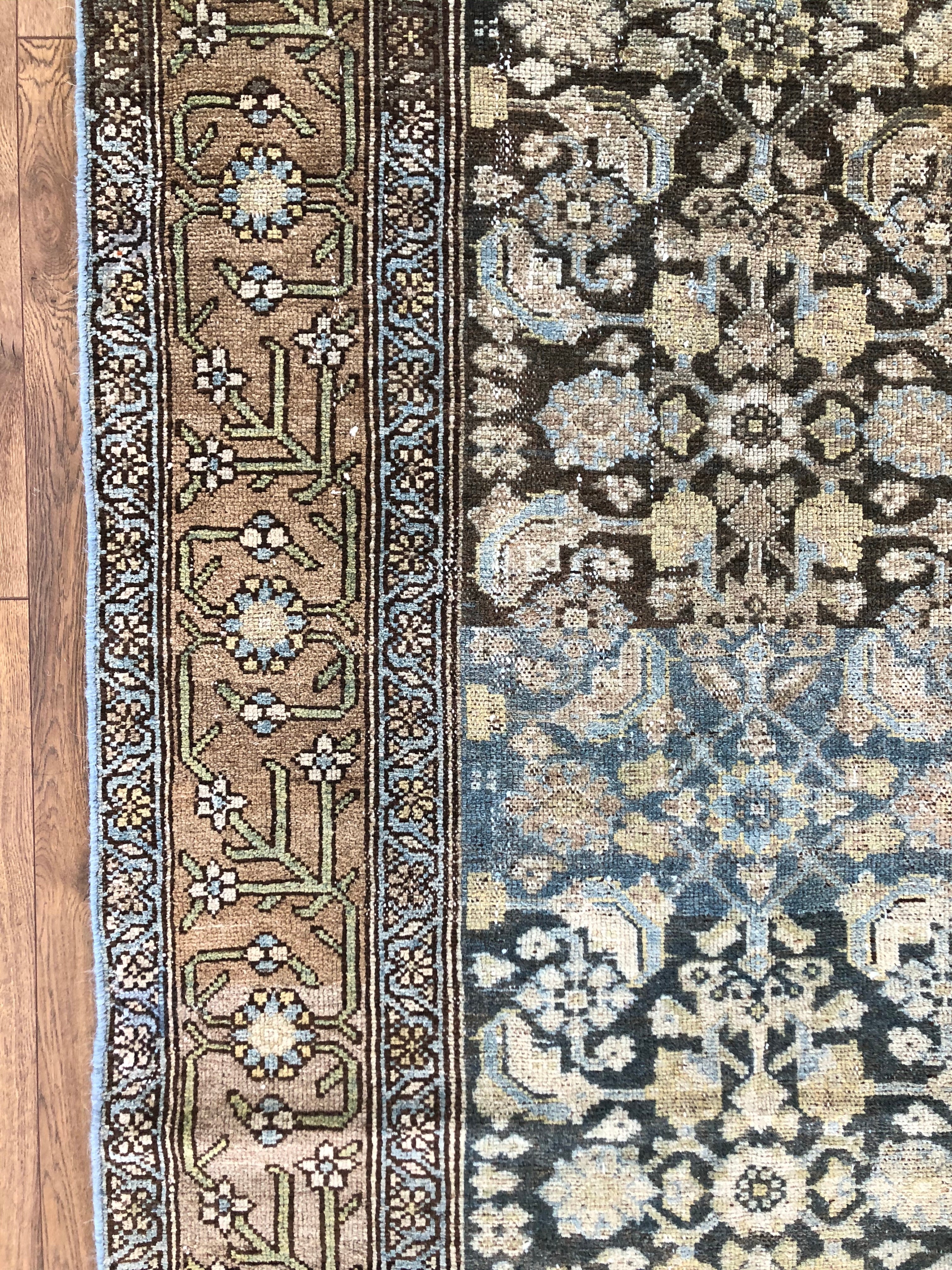Colors: deep teal and chocolate brown base colors, with ginger, dandelion, cerulean blue, chiffon and muted sage green detailing throughout the rug.