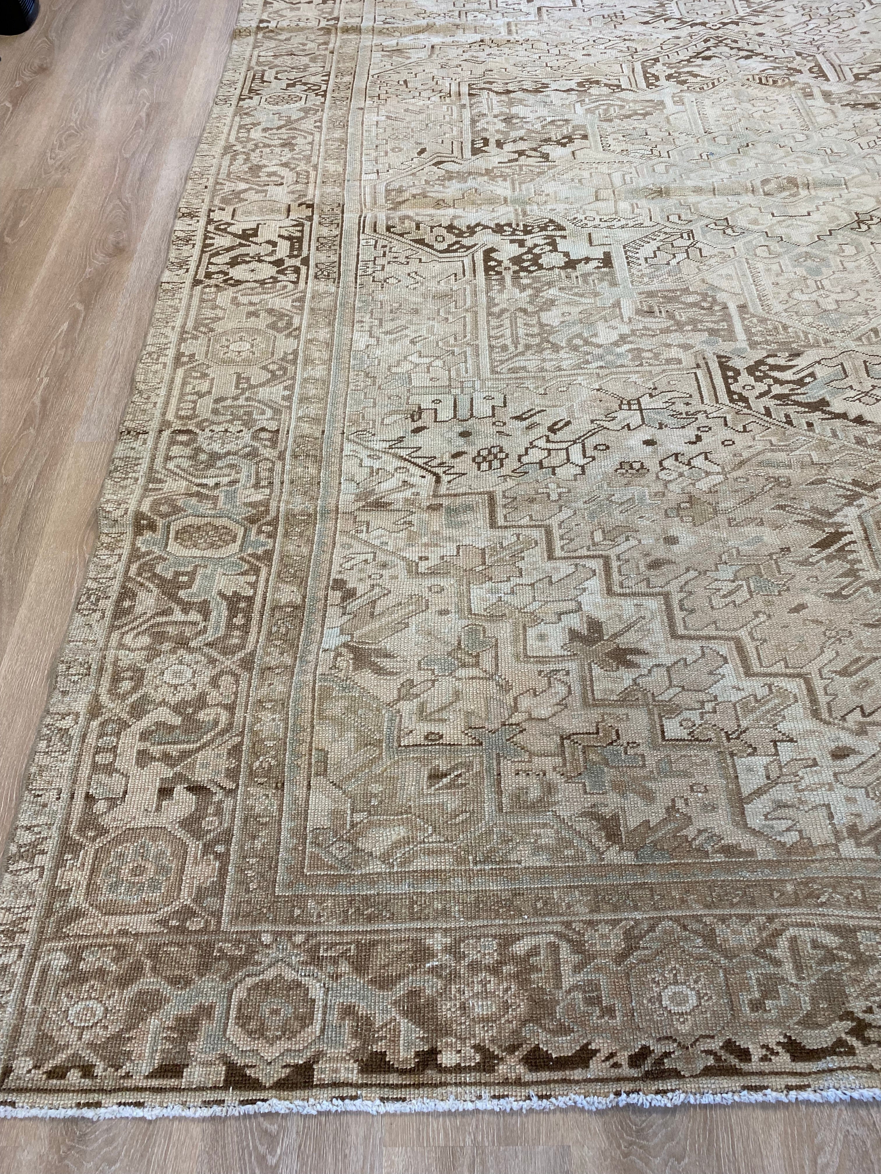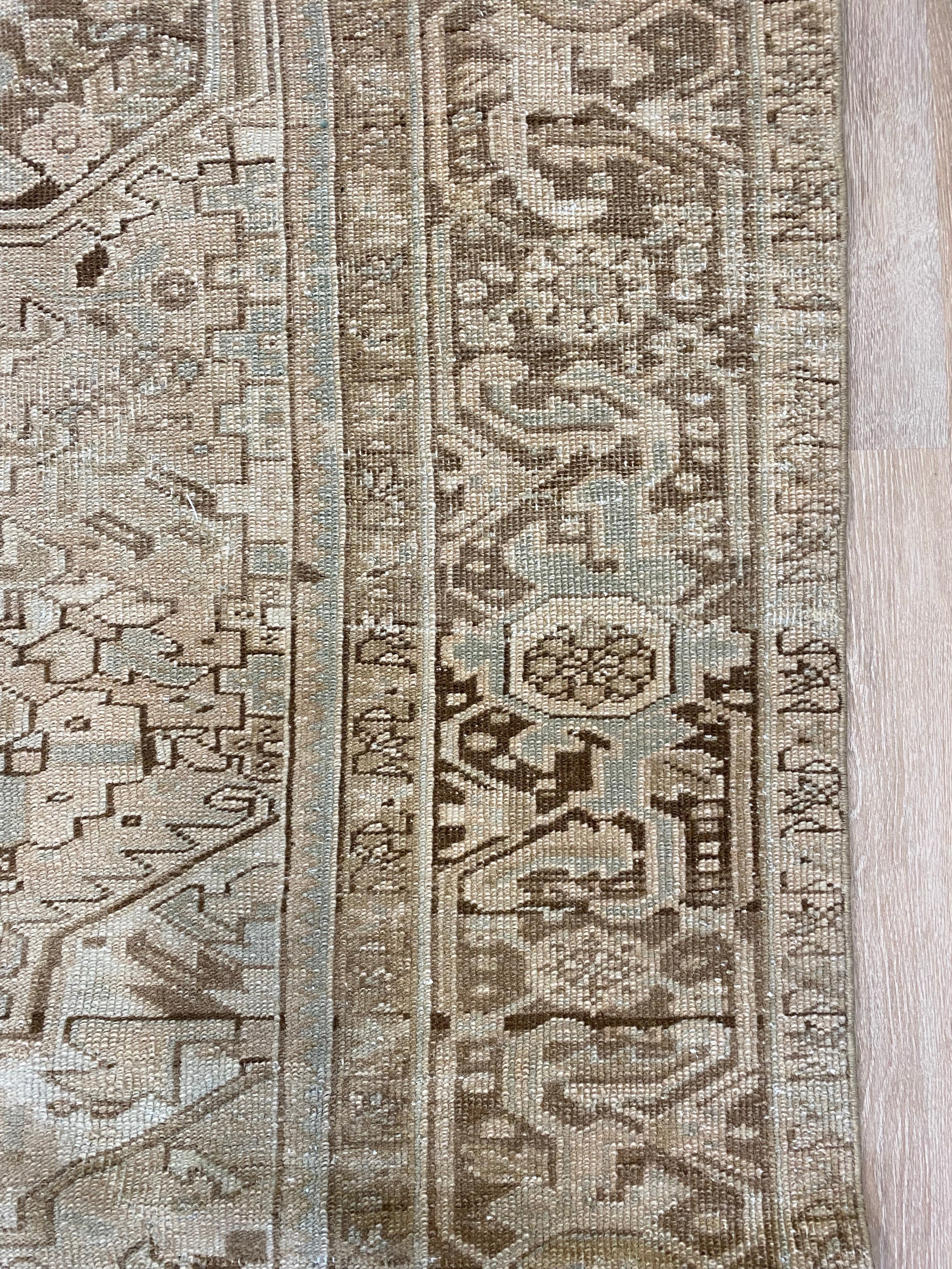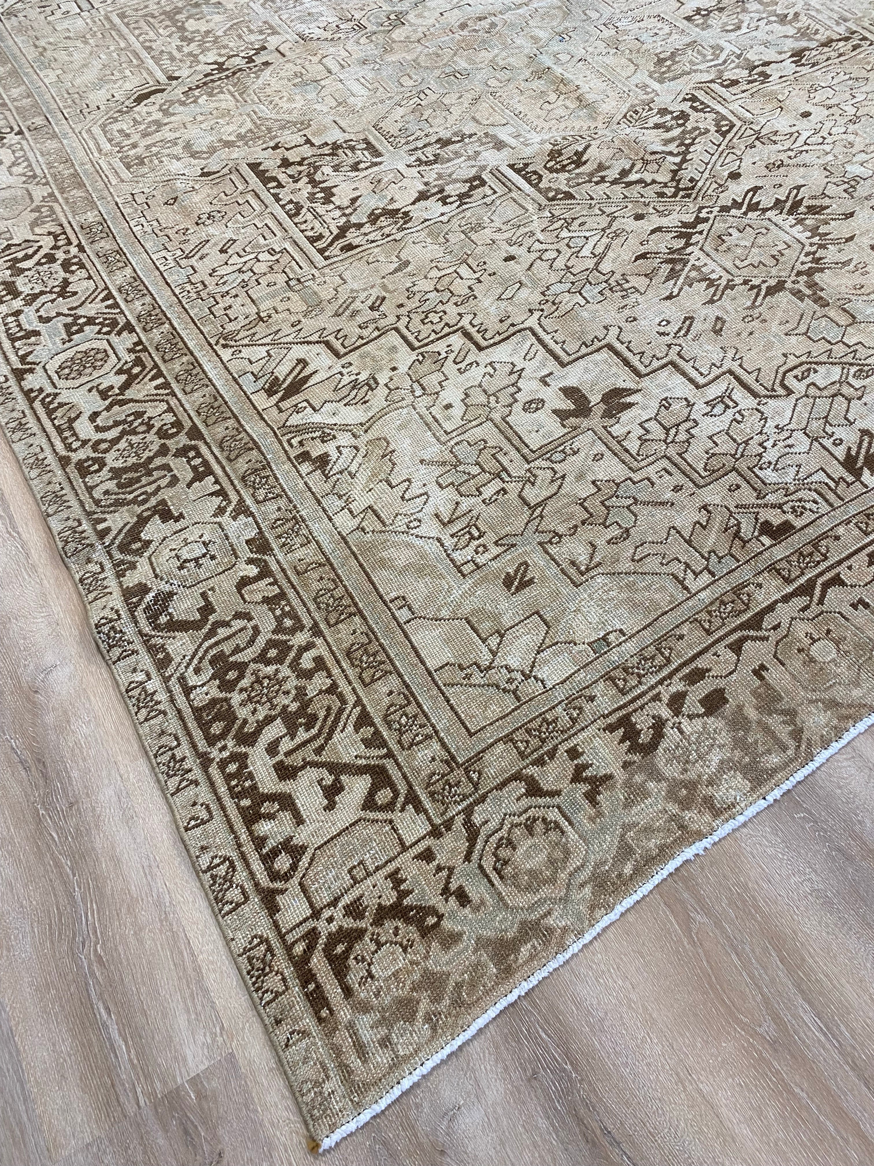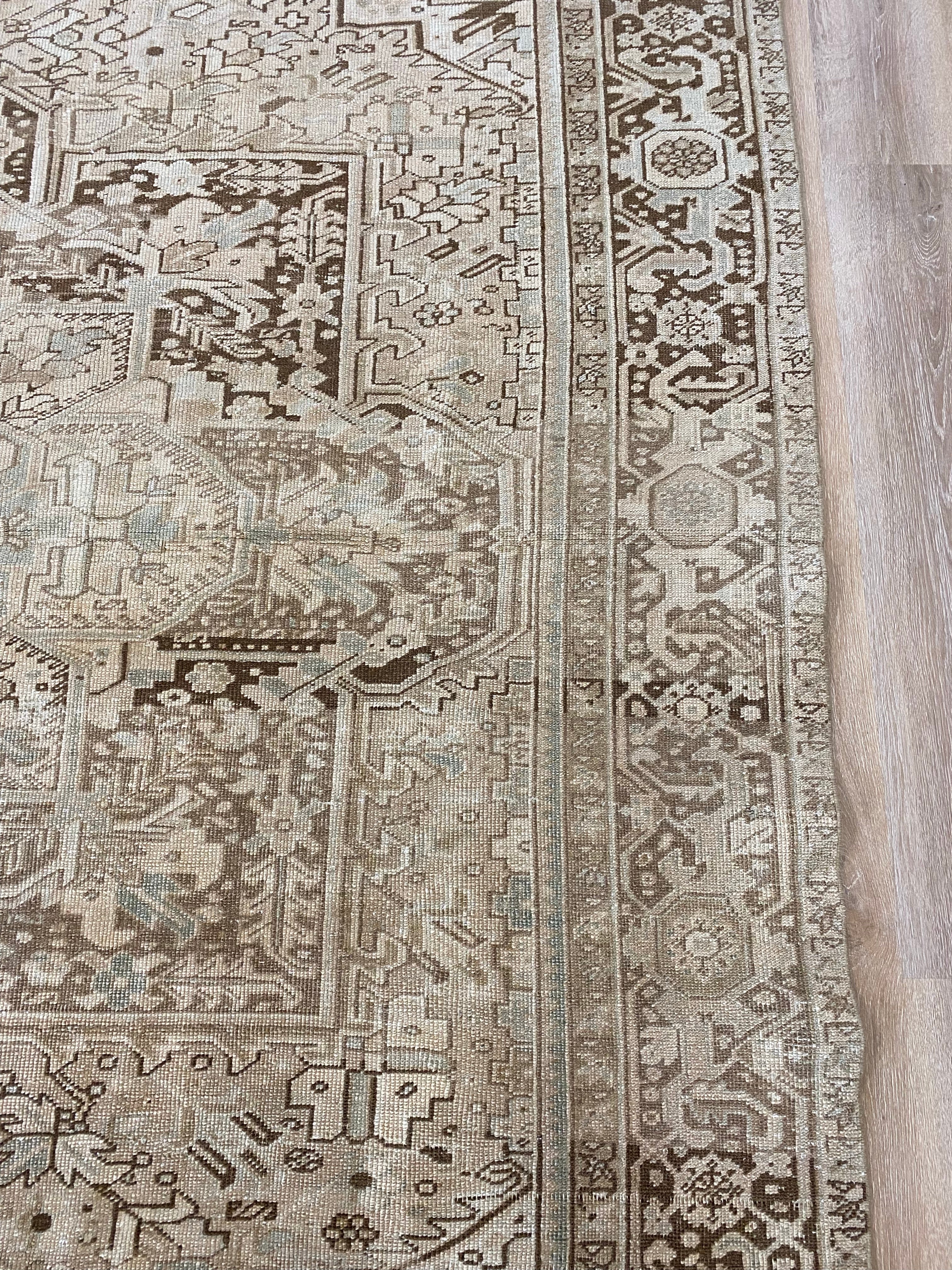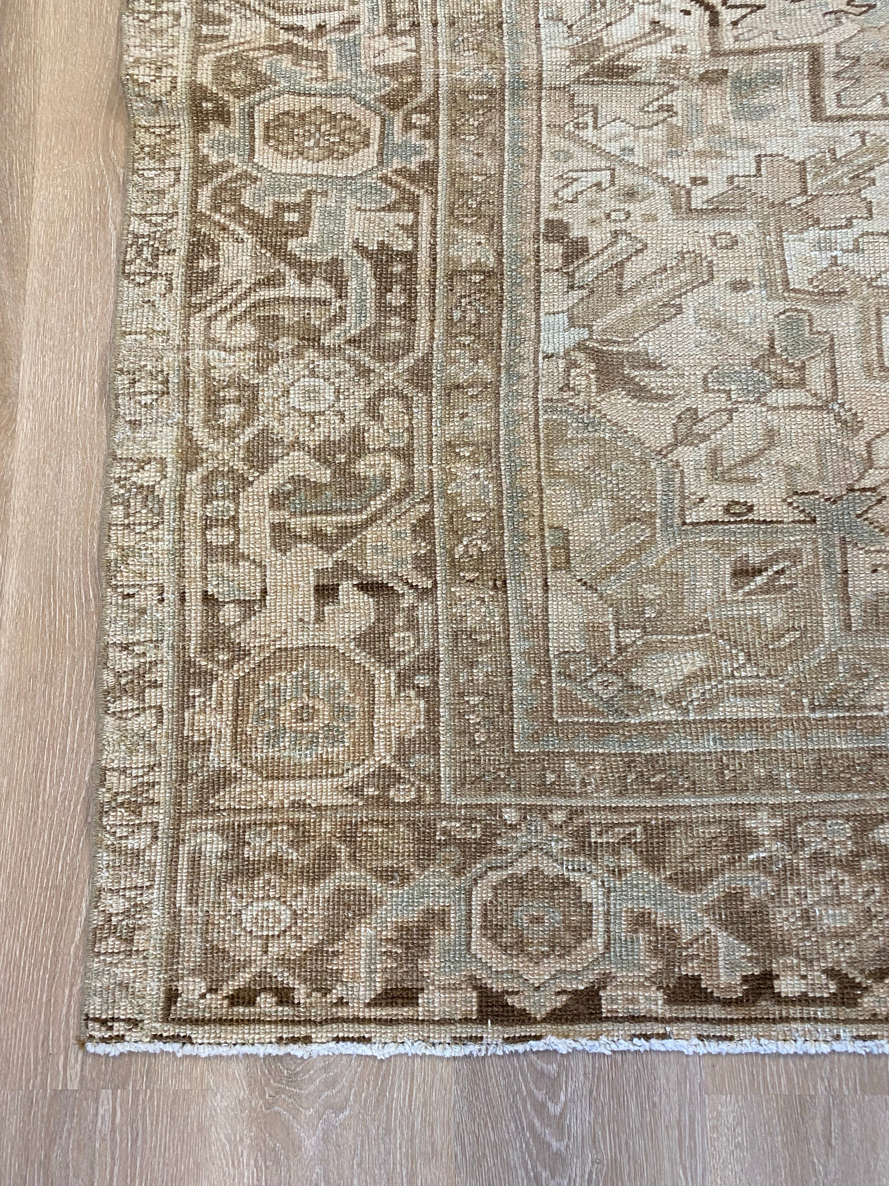 Colors: warm, sand tones. Accents of ivory, light sepia, and latte base coloring with mocha, coffee, and muted seafoam detailing throughout the rug.