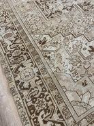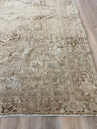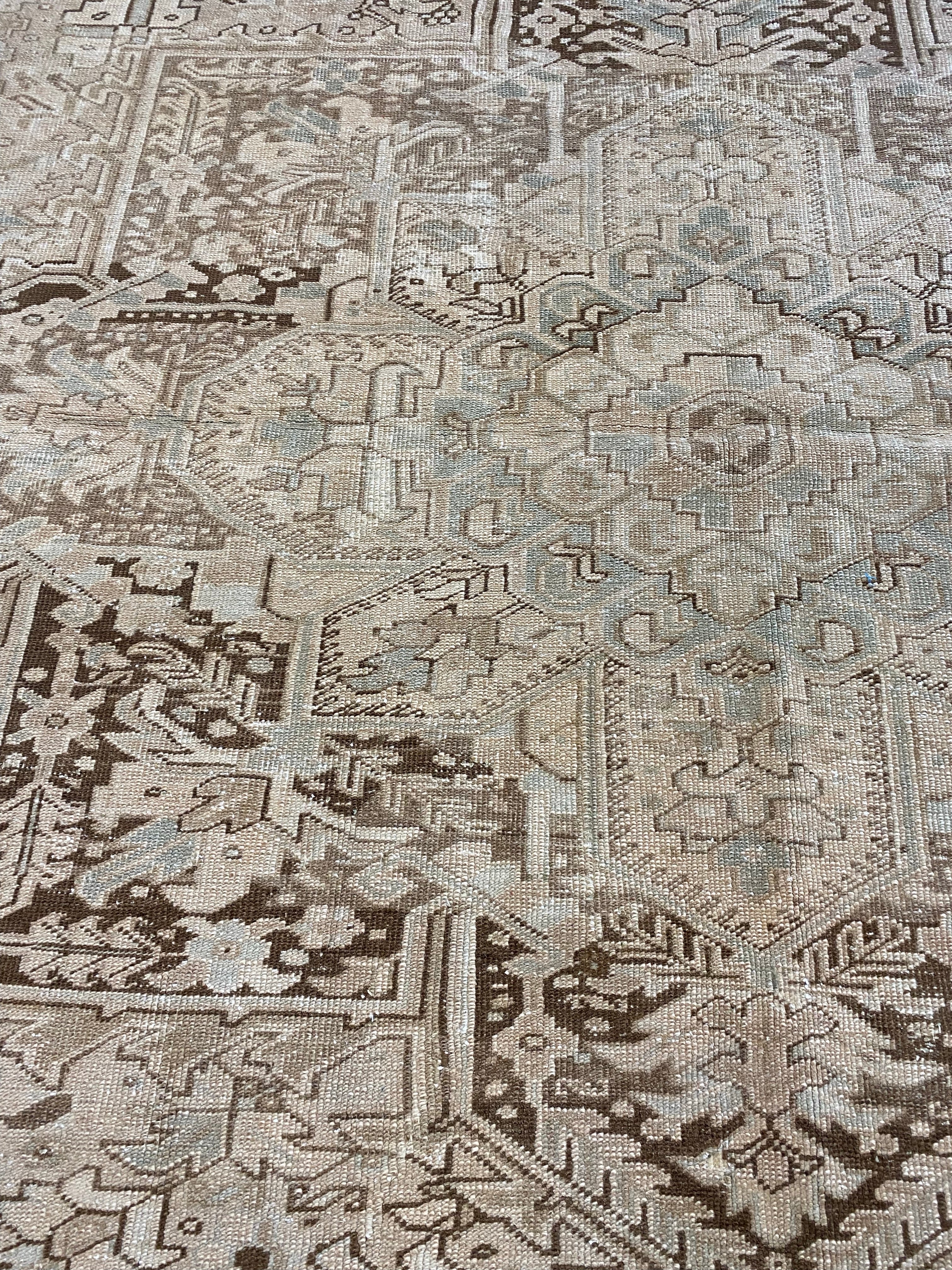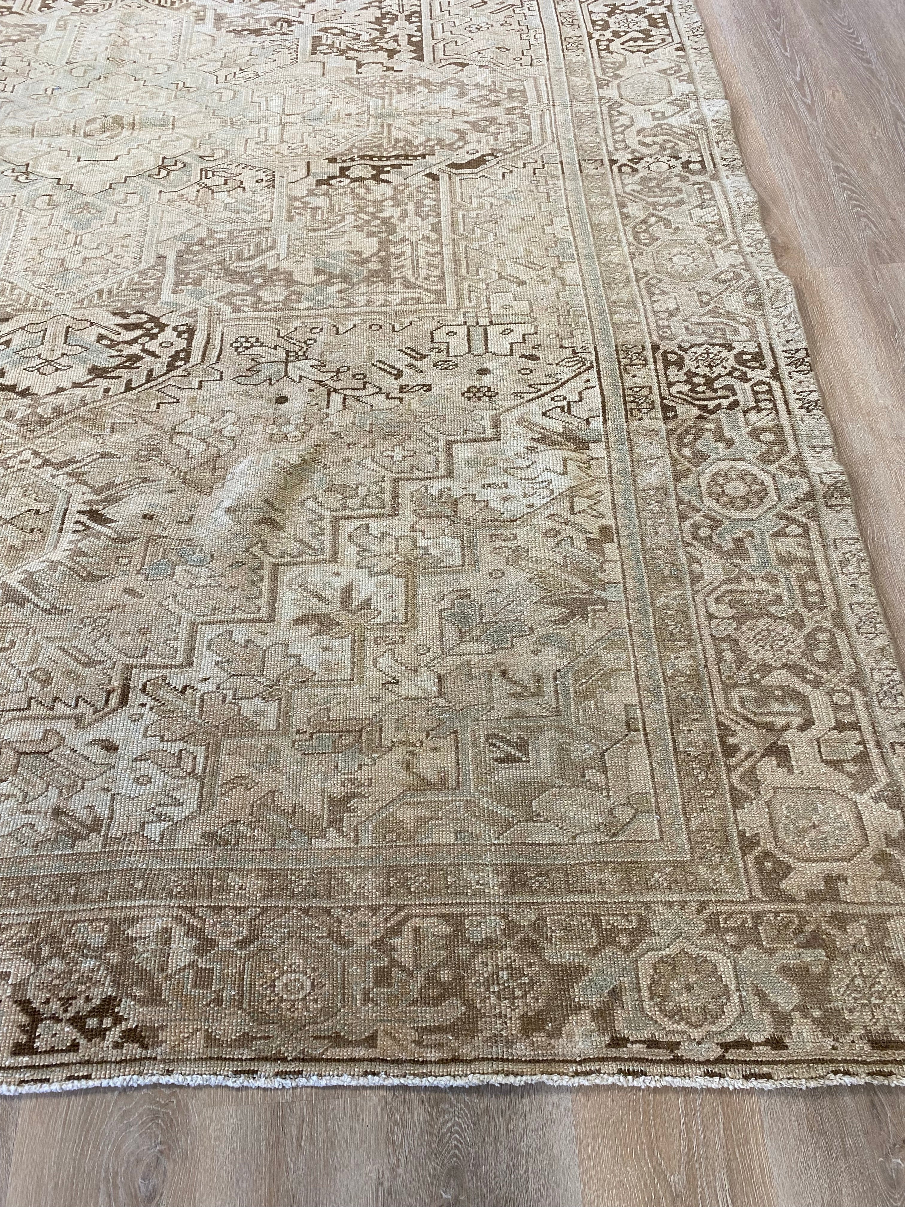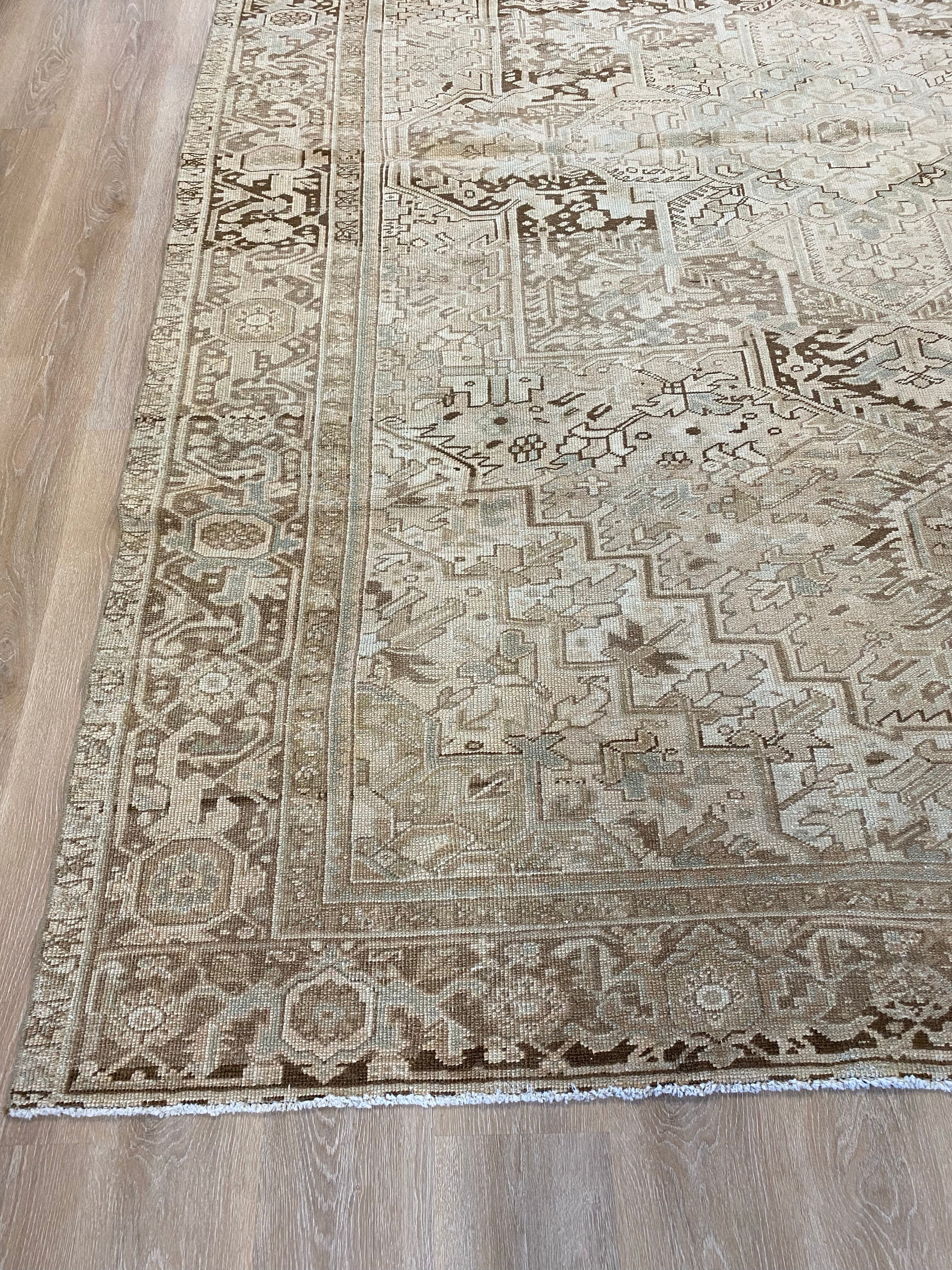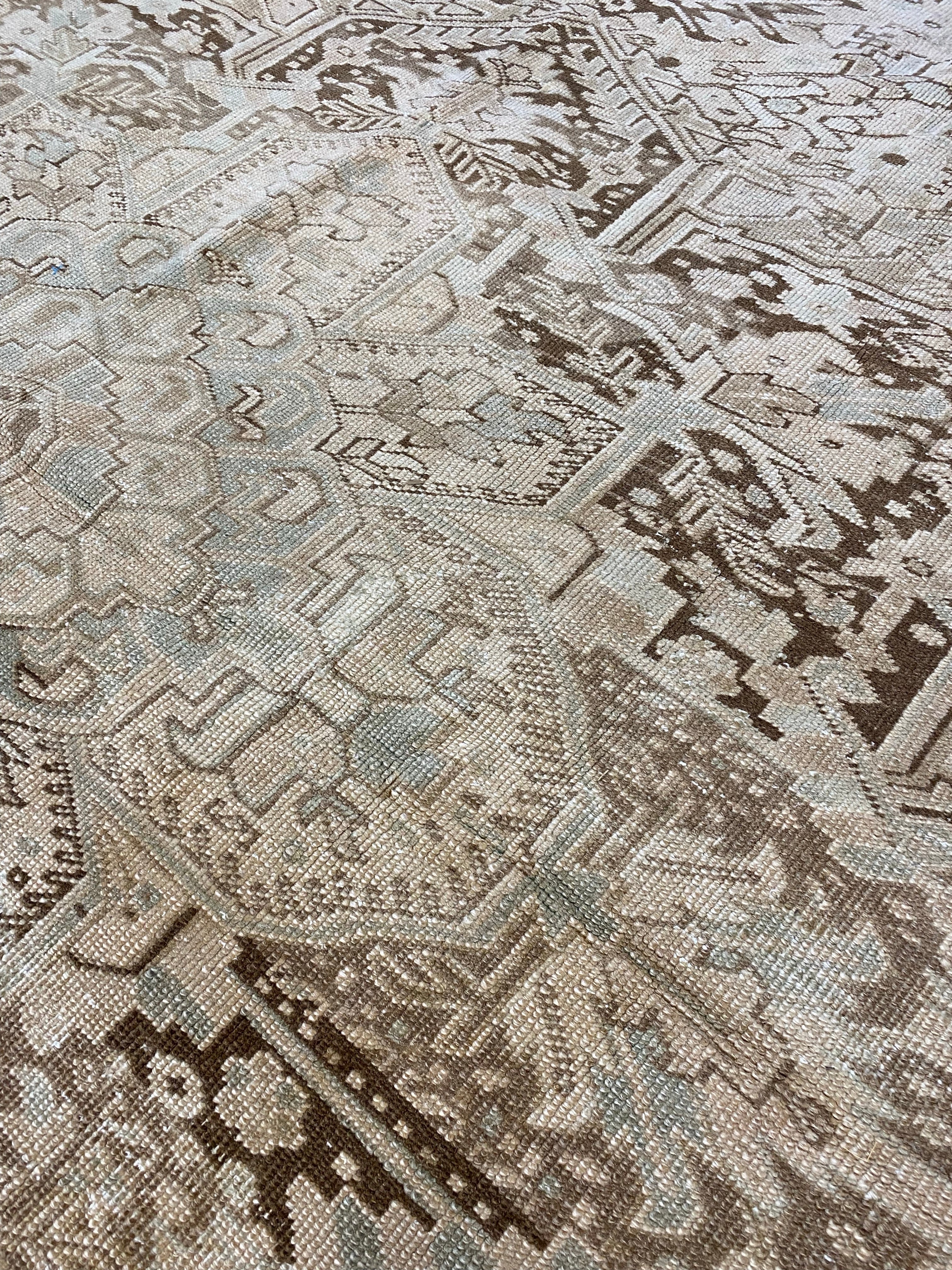 Colors: warm, sand tones. Accents of ivory, light sepia, and latte base coloring with mocha, coffee, and muted seafoam detailing throughout the rug.