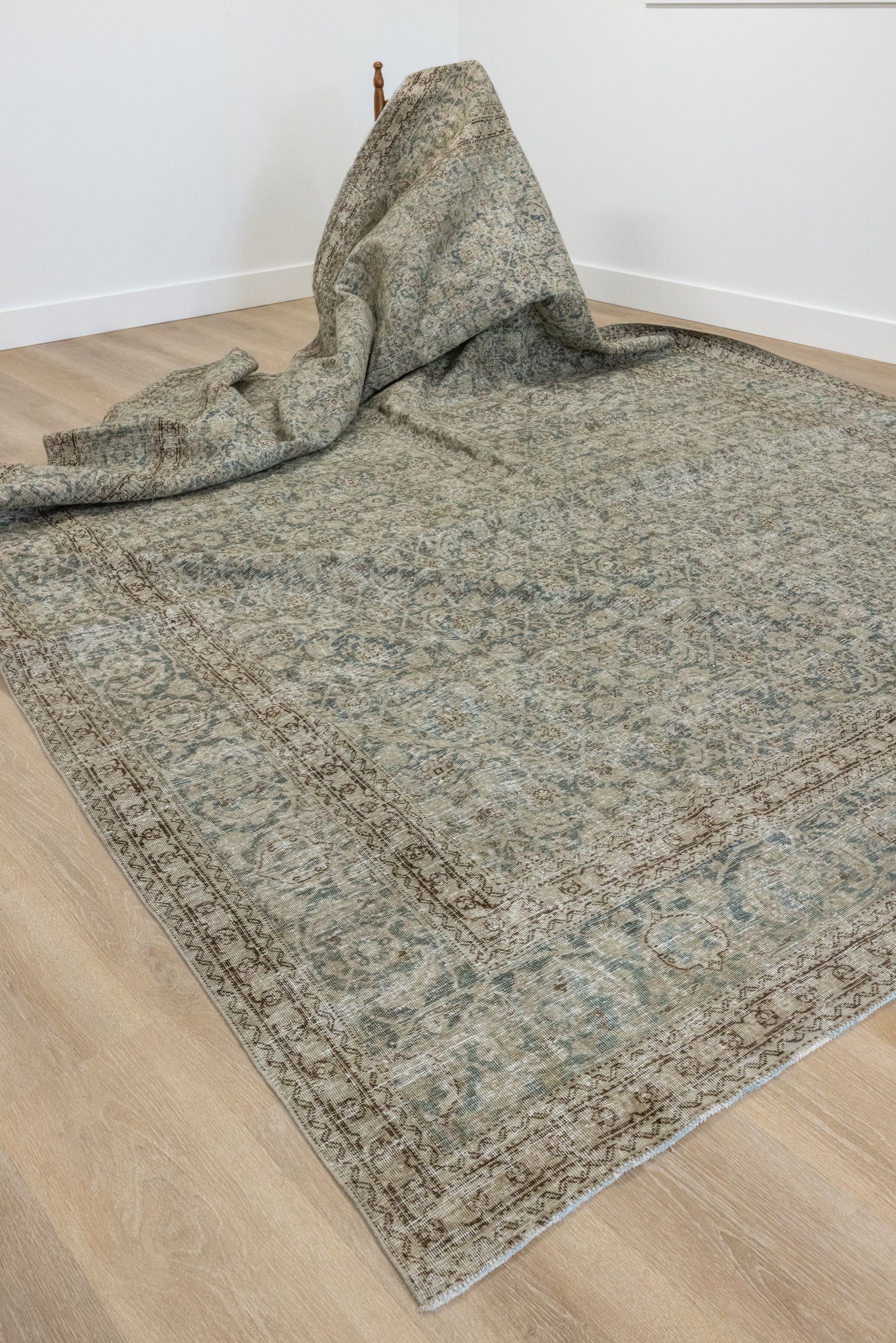 This rug has been professionally cleaned. Spot clean using the blotting technique, using a damp cloth. Take to a professional cleaner if the rug requires a deeper clean.
