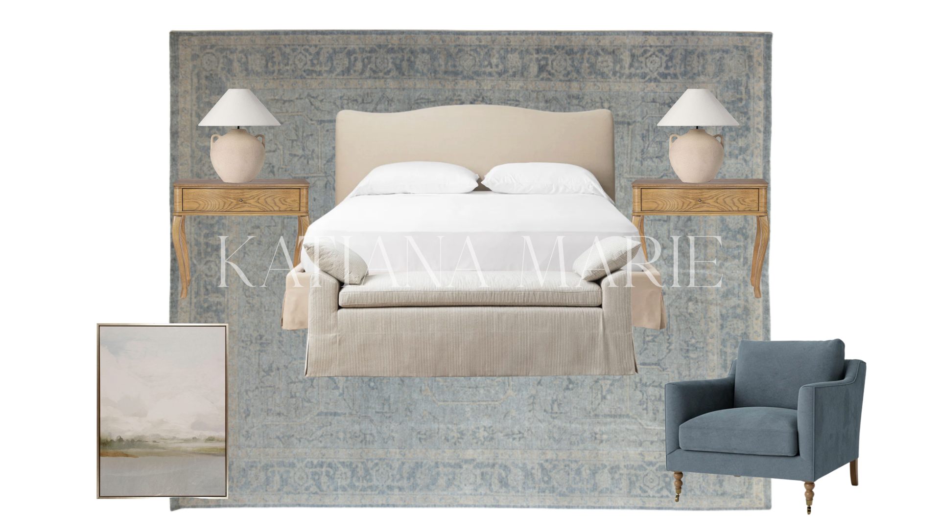 Relaxed, refined, and effortlessly coastal, this mood board was designed by our founder Katiana Marie to offer styling inspiration centered around our Josephine Rug, a soft vintage-inspired piece that brings texture and quiet elegance to any bedroom. With soft blues, a breezy linen bed frame, coastal-inspired artwork, and layered natural textures, this look captures the essence of the coastal grandmother aesthetic: comfortable, collected, and timeless.