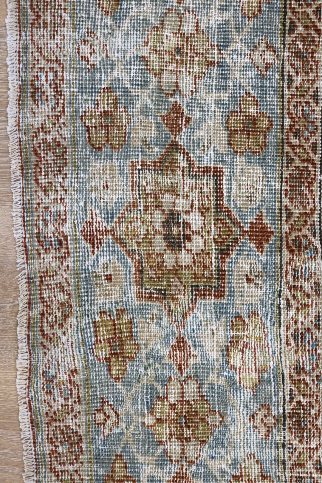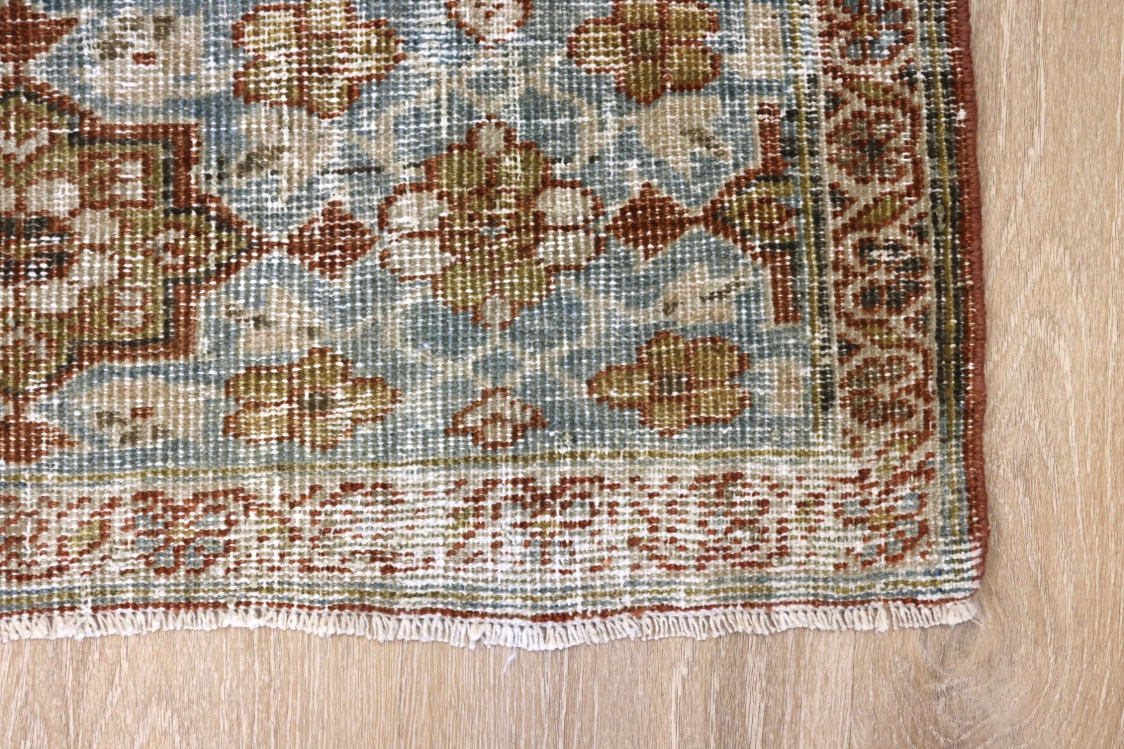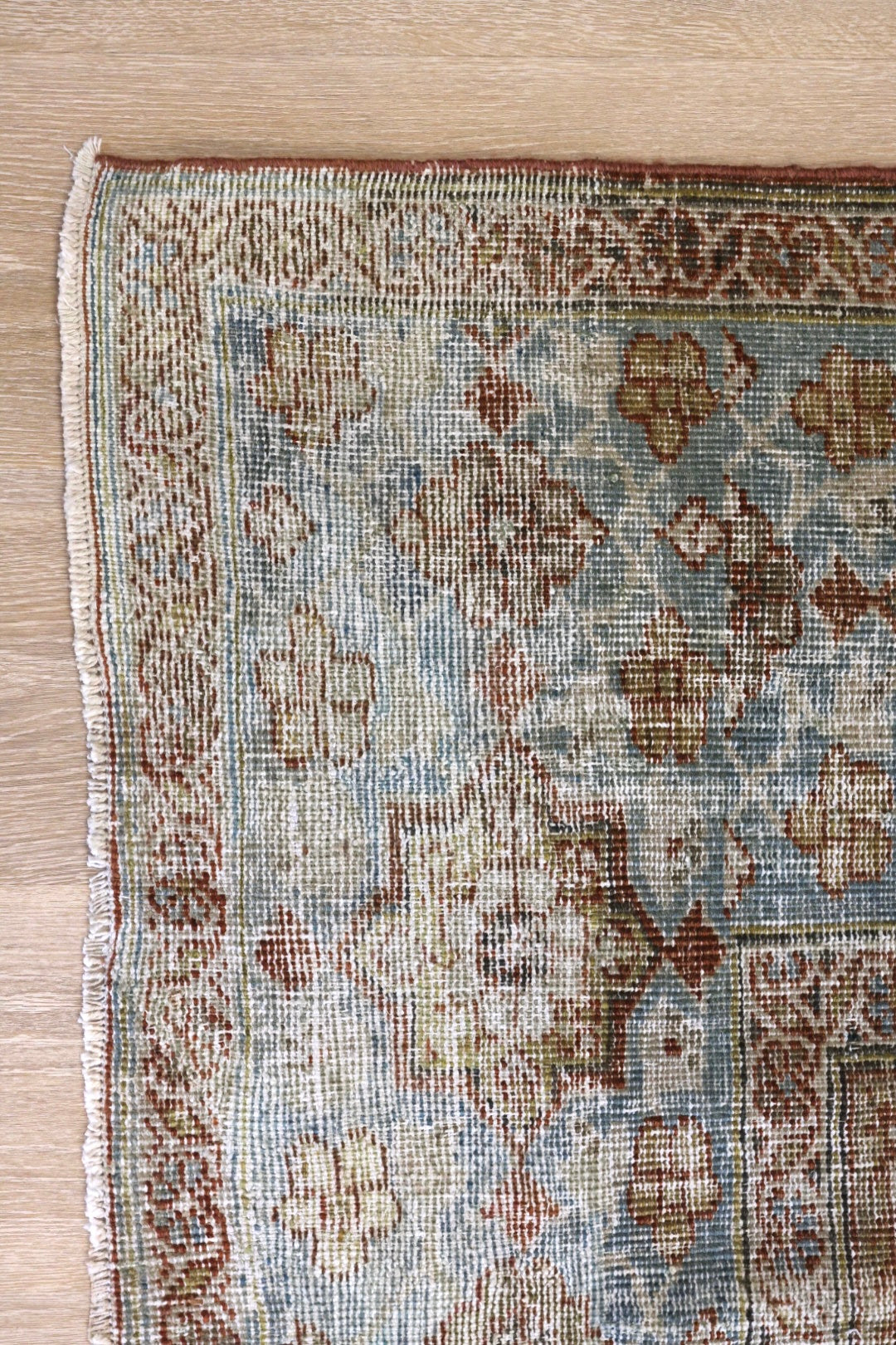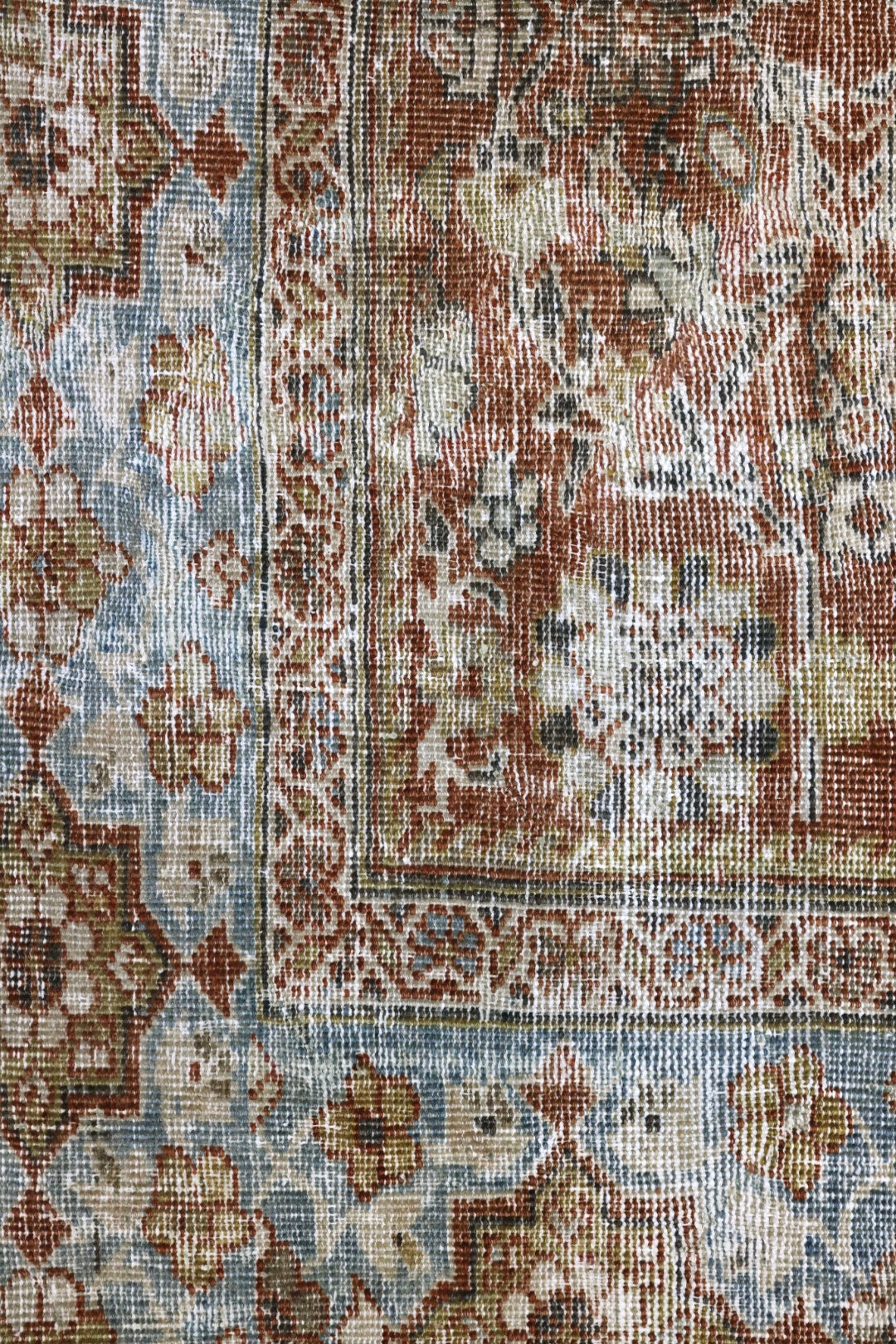 Please note that because this is a vintage rug, there may be slight imperfections in its wear, dimensions, and color. Our rugs have been repaired over the years, using various techniques. There might be evidence of these repairs through texture, look and feel. This is all part of the rich history and story of each artistic piece. These markings are not considered defective.