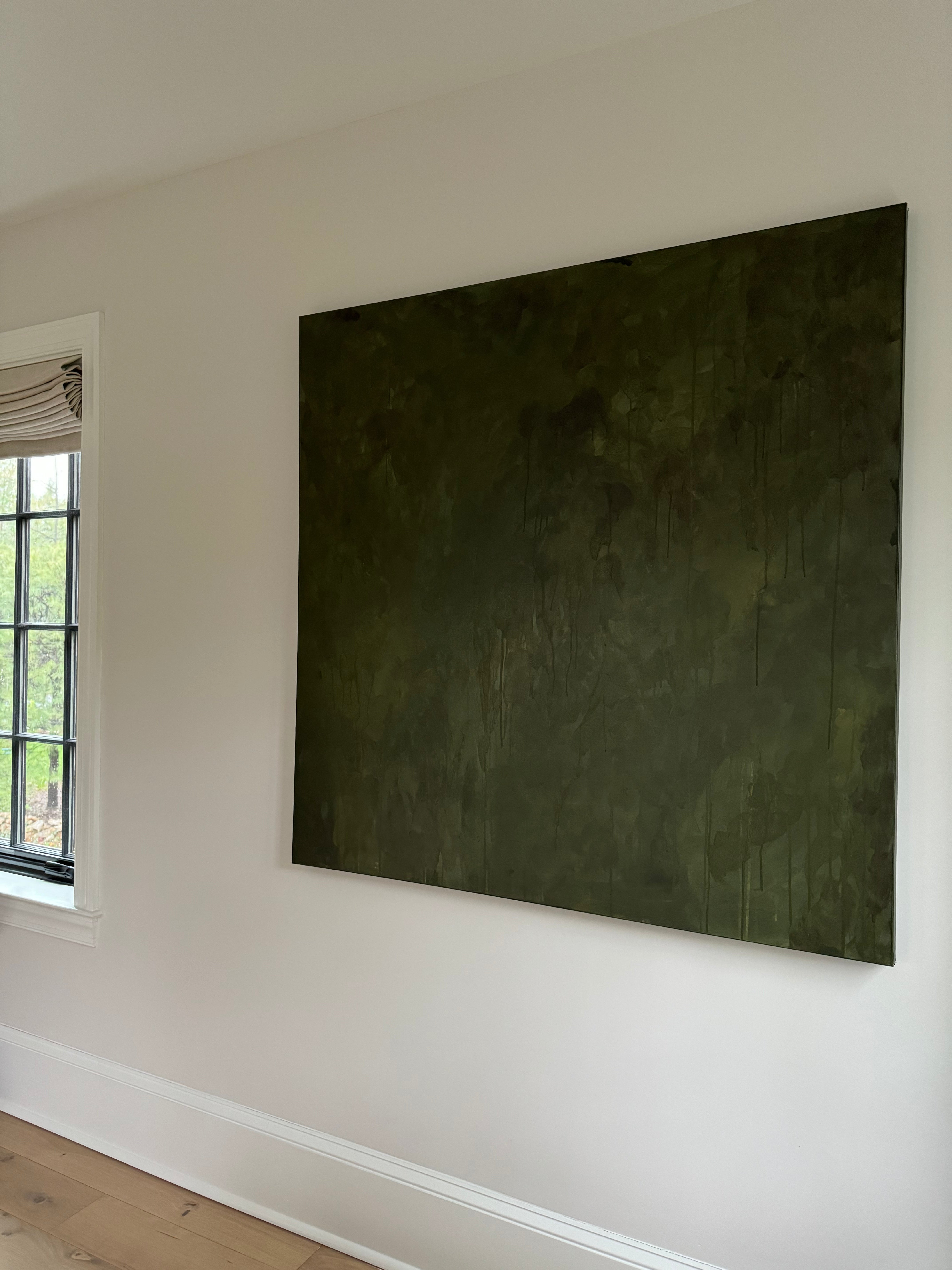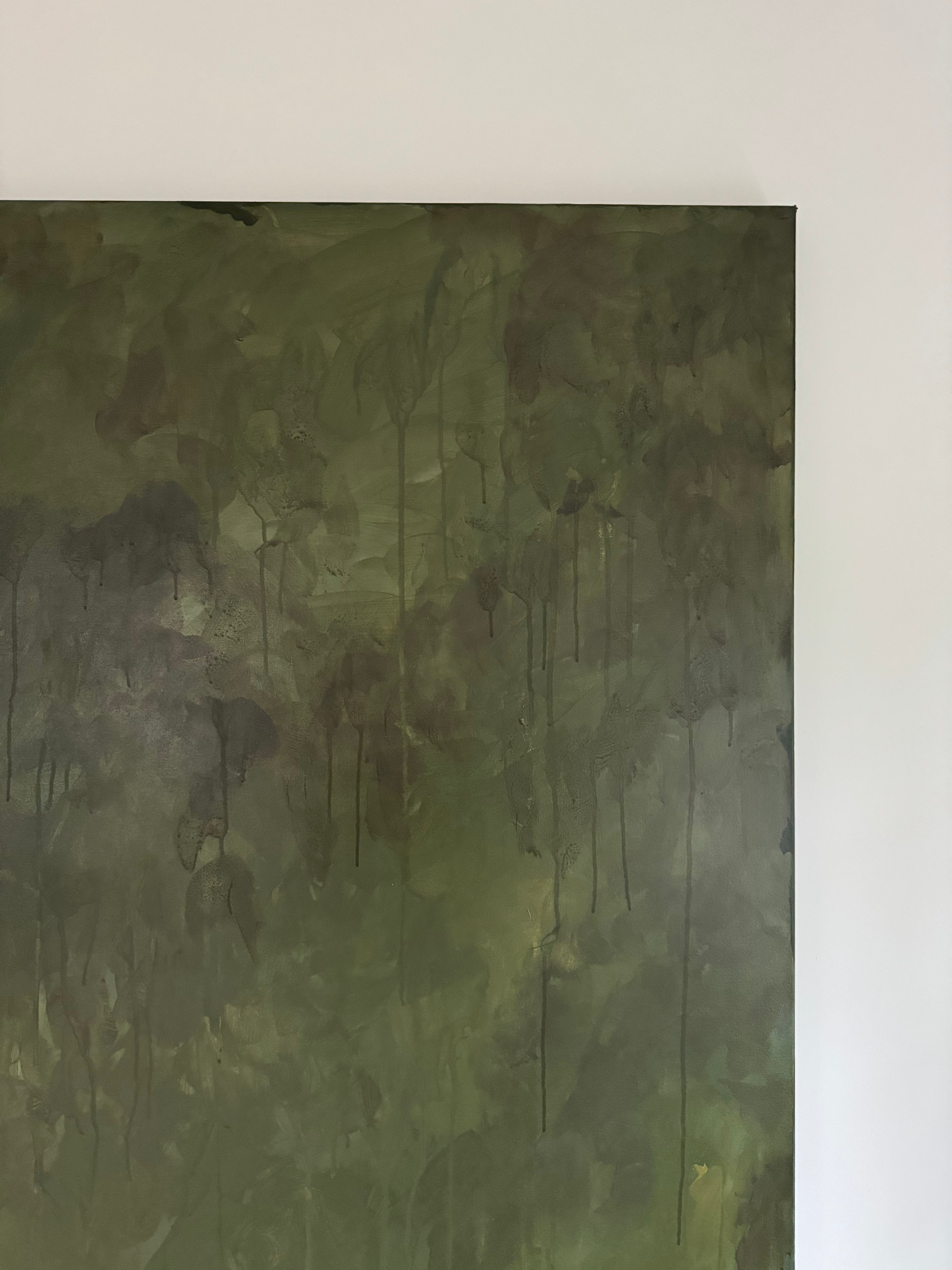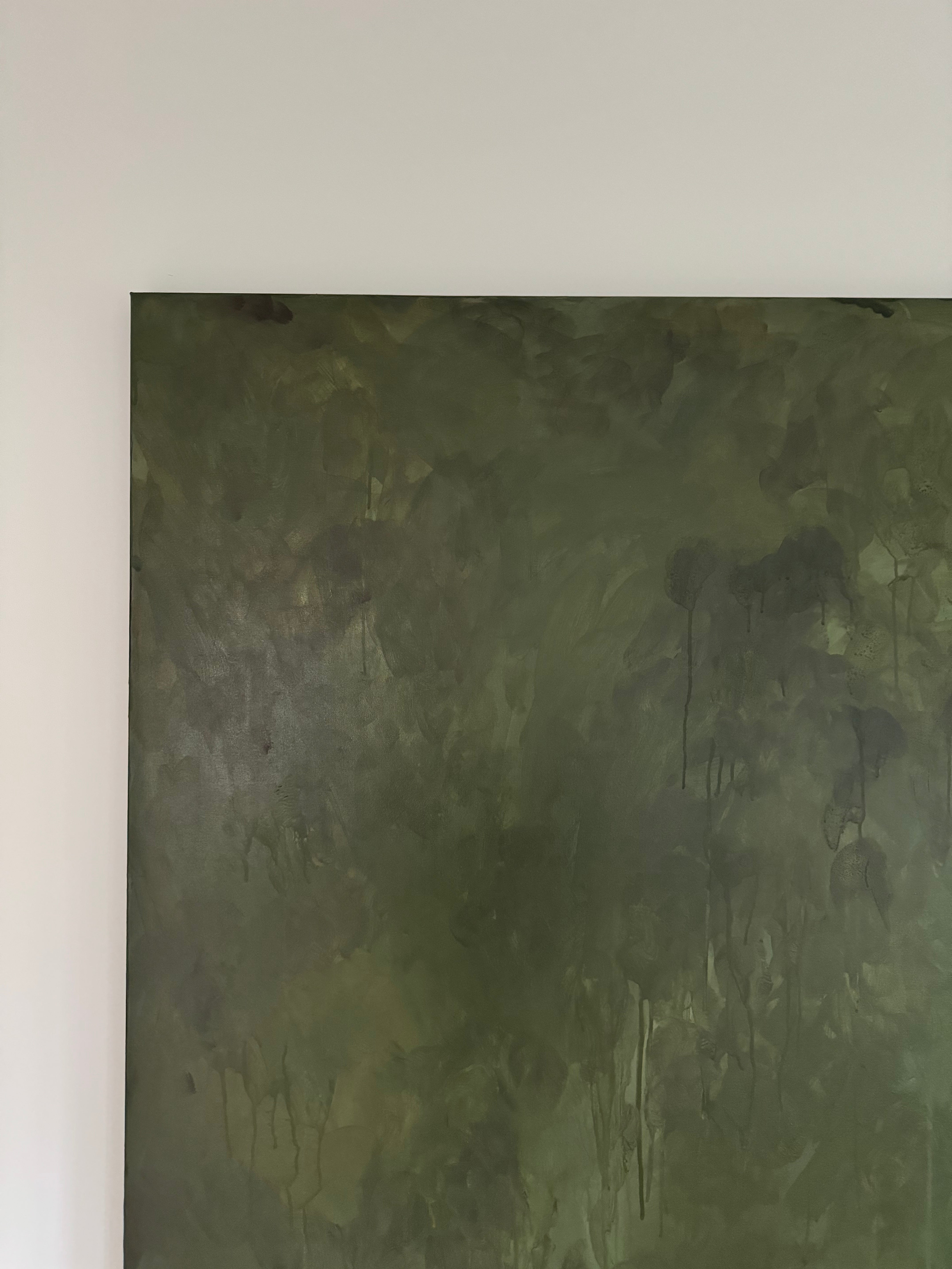 "Midnight Evergreen" is an evocative and captivating abstract painting featuring a monochromatic palette of dark green tones. The moody atmosphere of the piece draws the viewer into a world of mystery and depth. The intersecting layers in the artwork invite contemplation and discovery, offering a unique and entrancing visual experience.